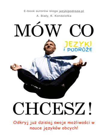 E-book autorów bloga jezykipodroze.pl A. Biały, K. Kondziołka MÓW CO CHCESZ! Odkryj już dzisiaj swoje możliwości w nauce języków obcych! SPIS TREŚĆI Ty w świecie języków obcych ....................................3 KROK 1: Twój indywidualny poziom ..............................4 KROK 2: W jaki sposób się uczysz? ..............................7 KROK 3: Co tak naprawdę Cię motywuje? .....................14 E-Materiały - skrzynia pełna skarbów czy studnia bez dna? ...27 Nauka słownictwa - samo się nie zrobi, ale nic na siłę ..31 Ogólne strategie dla osób zaawansowanych: .................33 Ćwiczenie dla dwóch lub więcej osób: ...........................35 Jak uczyć się słówek z fiszek? ......................................35 Nauka słówek przez pisanie: .......................................36 Nauka słówek przez czytanie: ......................................37 Nauka słówek przez słuchanie: ....................................38 Nauka słówek przez mówienie: ....................................38 Nauka słówek przez zabawę: .......................................40 Podziękowania i parę słów na dobry koniec .................41 The only thing that interferes with my learning is my education. (Jedyną rzeczą, która przeszkadza mi w nauce jest moja edukacja.) Albert Einstein Knowing is not enough; we must apply. Willing is not enough; we must do. (Sama wiedza nie wystarczy, trzeba ją zastosować. Same chęci nie wystarczą, należy działać.) Johann Wolfgang von Goethe Ty w świecie języków obcych Czy zdarzyło się kiedyś tak, że rozpoczynałeś kurs językowy i byłeś z niego nie do końca zadowolony? Czy próbowałeś nauki samodzielnej, ale nie kontynuowałeś jej? Uczysz się angielskiego już kilka lat i nadal nie osiągnąłeś swojego celu? Czy wiedziałeś, że powodem mogło być niedopasowanie kursu, metod i technik nauki do Ciebie? Każdy z nas jest inny. Są tacy, którzy lubią muzykę i sztukę, inni odnajdują się w liczbach i analizach. Jedni uwielbiają być w towarzystwie, inni poszukują raczej spokojniejszej rozrywki w zaciszu domowym. Tak samo każdy z nas inaczej się uczy. Oznacza to, że stosowanie jednej metody i jednego schematu nauczania dla 3 z 41 wszystkich z góry skazane jest na niepowodzenie. Skorzystają tylko ci, dla których ta metoda będzie skuteczna. Czy mówiłeś sobie czasem, że nie masz talentu do nauki języka? Że języki są nie dla Ciebie? Za chwilę odkryjesz, że to tylko Twoje fałszywe przekonanie oparte na Twoich doświadczeniach w nauce, która bazowała na nietrafionych metodach! Chcę pokazać Ci, że opanowanie języka obcego jest w zasięgu Twoich możliwości! Otrzymasz dzisiaj narzędzia, dzięki którym rozpoczniesz zupełnie nową przygodę i osiągniesz swoje cele! Zanim przystąpisz do nauki, musisz dowiedzieć się kilku ważnych rzeczy o sobie. KROK 1: Twój indywidualny poziom Często słyszę od ludzi, którzy wznawiają przygodę z językiem: „Mój poziom jest słaby”. Zastanów się głębiej nad sensem i metodą określania poziomu językowego w ogóle. Poziom nie jest ani słaby, ani dobry, poziom jest taki, jaki jest w konkretnym etapie nauki, wskazuje na nasz aktualny stan znajomości języka. Polecałabym odejść od używania negatywnych słów, takich jak „słaby”. Po pierwsze działa to silnie demotywująco, a po drugie jest tylko subiektywnym stwierdzeniem, wzmacniającym nasze przekonanie o tym, że jesteśmy w czymś gorsi. Wyobraź sobie dwulatka, który rozpoczyna nowy etap życia i 4 z 41 zaczyna nazywać przedmioty wokół niego, a do tego tworzyć pełne zdania. Na pewno oczyma wyobraźni widzisz mnóstwo radości wśród rodziców dziecka, którzy cieszą się na każde nowe słowo swojej pociechy. Nieważne, że poprzestawiał sylaby i zamiast samolotu słyszymy „malotot”, nieważne, że niepoprawnie odmienił czasownik. Ważne, że mówi! Z takim podejściem nauka każdego nowego języka byłaby niczym innym jak niekończącą się frajdą :) Gdy uczysz się języka, bez względu na to, na jakim jesteś poziomie, ciesz się tym, co już potrafisz! Zobaczysz, że pomoże Ci to przełamać wszelkie blokady, które nie pozwalają Ci na efektywną naukę. Musisz pamiętać również, że poziom poziomowi nierówny. Każdy, kto uczył się kiedyś języka ma swoją indywidualną historię językową, spotkał po drodze swoich nauczycieli, uczył się ze swoich list słówek, które z dużą dozą prawdopodobieństwa różnią się od Twoich. Nawet jeśli po audycie językowym okaże się, że Ty i druga osoba jesteście na poziomie B2, może to oznaczać, że Ty jesteś świetny z gramatyki i pisania, a więcej nakładu pracy wymaga słownictwo i wymowa. Druga osoba z kolei mogła uczyć się angielskiego wyłącznie podczas swojego 2-letniego pobytu w USA i świetnie mówi, jednak ma braki w gramatyce. Są osoby, które świetnie rozwiązują testy, a mają trudności z użyciem poprawnych konstrukcji w kontekście, podczas rozmowy. Znając swój poziom możesz dobrać optymalne materiały do nauki i ustalić sobie realny cel :) 5 z 41 Sam test jest oczywiście niewystarczającym narzędziem do zweryfikowania poziomu. Test pokaże naszą znajomość gramatyki i słownictwa w formie pisanej. Rozmowa ustna jest idealnym uzupełnieniem testu celem sprawdzenia poziomu znajomości języka w praktyce (wymowa, słownictwo, płynność). Niezwykle ważne jest, aby w czasie nauki pracować nad wyrównaniem poziomu. Tak samo jak ćwicząc jogę pracujemy nad harmonią swojego ciała, poprawną pozycją, równomiernym rozwojem mięśni i elastyczności tak samo ucząc się języka obcego nie powinniśmy poświęcać 10 godzin na ćwiczenia gramatyczne, a na konwersacje jedynie 30 minut. O ile możemy ćwiczyć gramatykę podczas konwersacji, nie da się ćwiczyć konwersacji siedząc z nosem w ćwiczeniach gramatycznych. Jeśli chcesz sprawdzić, w