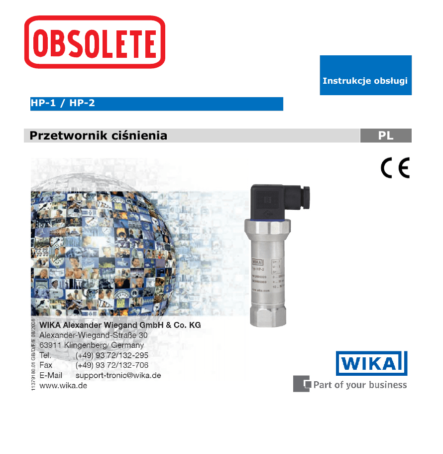 Instrukcje obsługi HP-1 / HP-2 Przetwornik ciśnienia PL Obowiązują aktualne warunki zakupu i dostawy. Szczegóły są dostępne na ... Instrukcje obsługi HP-1 / HP-2 www.wika.de Przetwornik ciśnienia WIKA Alexander Wiegand GmbH & Co. KG Alexander-Wiegand-Straße 30 63911 Klingenberg/Niemcy Tel. (+49) 93 72/132-295 Faks (+49) 93 72/132-706 E-mail [email protected] www.wika.de Spis treści – Spis treści PL Strony 3-17 1. Ważne informacje 2. Szybki przegląd 3. Skróty, znaki i symbole 4. Funkcja 5. Bezpieczeństwo 6. Opakowanie 7. Uruchomienie, obsługa 8. Regulacja punktu zerowego/zakresu 9. Konserwacja, wyposażenie 10. Wykrywanie i usuwanie usterek 11. Przechowywanie, usuwanie 2 PL Instrukcje obsługi WIKA HP-1 / HP-2 1. Ważne informacje PL 1. Ważne informacje Przed zainstalowaniem i uruchomieniem przetwornika ciśnienia należy przeczytać niniejszą instrukcję obsługi. Niniejszą instrukcję należy przez cały czas trzymać w łatwo dostępnym miejscu dla wszystkich użytkowników. Poniższe instrukcje instalacji i obsługi zostały napisane ze szczególną uwagą, jednak uwzględnienie wszystkich zastosowań nie jest możliwe. Niniejsza instrukcja instalacji i obsługi powinna spełniać potrzeby większości zastosowań pomiarów ciśnienia. W przypadku pytań dotyczących konkretnych zastosowań, szczegółowe informacje można uzyskać: ■ Na stronie internetowej www.wika.de / www.wika.com ■ Z karty danych produktu opatrzonej numerem PE 81.29 (HP-1) / PE 81.53 (HP-2) ■ Kontaktując się z firmą WIKA, aby uzyskać dodatkowe wsparcie techniczne (+49) 9372 / 132-295 W przypadku numerów modeli specjalnych, np. HP-20000, należy zwrócić uwagę na specyfikację na dowodzie dostawy. Jeżeli numer seryjny na etykiecie produktu i/lub kod 2D na sześciokątnej naklejce stanie się nieczytelny (np. w wyniku uszkodzeń mechanicznych lub malowania), zwrot urządzenia nie będzie możliwy. Przetworniki ciśnienia firmy WIKA zostały starannie zaprojektowane i wyprodukowane przy zastosowaniu najnowszych technologii. Wszystkie części składowe przed zamontowaniem przechodzą ścisłą kontrolę jakościową i środowiskową, a każde urządzenie przed wysyłką jest dokładnie testowane. Nasz system zarządzania środowiskowego jest zgodny z DIN EN ISO 14001. Ponieważ wszystkie materiały poddawane wysokiemu ciśnieniu podlegają ekstremalnym obciążeniom stała stabilność cyklu obciążeń zapewniona jest w ograniczonym obszarze. Dotyczy to w szczególności zastosowań dynamicznych. Zgodnie z tym części pod ciśnieniem HP-1 / HP-2 są częściami zużywalnymi i nie są objęte gwarancją. Zastosowanie produktu zgodnie z przeznaczeniem HP-1/HP-2: Przetwornik ciśnienia służy do przetwarzania ciśnienia w sygnał elektryczny do zastosowania w ekstremalnie wysokim ciśnieniu > 1000 barów. Wymagana wiedza: Przetwornik ciśnienia należy instalować i uruchamiać jedynie po zapoznaniu się z odpowiednimi przepisami i dyrektywami obowiązującymi w kraju użytkowania i pod warunkiem, że użytkownik posiada wymagane kwalifikacje. Użytkownik musi znać zasady i przepisy dotyczące technologii pomiarowej i kontrolnej oraz obwodów elektrycznych, ponieważ, jak określa norma EN 50178, przetwornik ciśnienia stanowi „sprzęt elektryczny”. W zależności od warunków pracy danego systemu, należy posiadać odpowiadającą wiedzę, np. dotyczącą mediów agresywnych lub wysokiego ciśnienia. Instrukcja obsługi WIKA HP-1 / HP-2 3 2. Szybki przegląd / 3. Skróty, znaki i symbole / 4. Funkcja PL 2. Szybki przegląd Jeżeli użytkownik chce dokonać szybkiego przeglądu, powinien przeczytać rozdziały 3, 5, 7 i 11. Uzyska tam kilka krótkich instrukcji dotyczących bezpieczeństwa oraz ważne informacje odnośnie produktu i jego uruchomienia. Należy przeczytać podane rozdziały w każdym przypadku. 3. Skróty, znaki i symbole Ostrzeżenie Ostrzeżenie Potencjalne zagrożenie życia lub ryzyko ciężkiego uszkodzenia ciała. Uwaga, ważna informacja, awaria. Wyrzucane części przyrządu (katapultowane) stanowią potencjalne zagrożenie życia lub ryzyko ciężkiego uszkodzenia ciała. Produkt jest zgodny z odnośnymi dyrektywami europejskimi. Gorące powierzchnie stwarzają potencjalne ryzyko poparzenia Uwaga 2-przewodowy 3-przewodowy UB S+ 0V Dwie linie podłączenia są przeznaczone do zasilania elektrycznego. Prąd zasilania jest sygnałem pomiarowym. Dwie linie podłączenia są przeznaczone do zasilania elektrycznego. Jedna linia podłączenia służy jako sygnał pomiarowy. Zasilanie dodatnie Dodatnie przyłącze pomiarowe Zasilanie ujemne 4. Funkcja Ciśnienie panujące w systemie jest przekształcane w znormalizowany sygnał elektryczny poprzez ugięcie membrany, która działa na element sensora za pomocą zasilania elektrycznego podłączonego do przetwornika. Sygnał elektryczny zmienia się proporcjonalnie do ciśnienia i może być odpowiednio oszacowany. 4 Instrukcje obsługi WIKA HP-1 / HP-2 5. Bezpieczeństwo PL 5. Bezpieczeństwo Przed zainstalowaniem i uruchomieniem aparatu należy wybrać odpowiedni przetwornik ciśnienia, w odniesieniu do zakresu skali, wydajności i określonych warunków pomiarowych. Ostrzeżenie ■ Należy przestrzegać odpowiednich przepisów krajowych (np. EN50178) oraz odnośnych norm i dyrektyw dotyczących specjalnych zastosowań. W przypadku nieprzestrzegania odpowiednich przepisów mogą wystąpić poważne uszkodzenia i/lub zniszczenia! ■ Przyłącza ciśnieniowe należy otwierać wyłącznie po dekompresji systemu! ■ Należy upewnić się, że przetwornik ciśnienia cały czas stosowany jest wyłącznie przy zachowaniu wartości progowych przeciążenia! ■ Należy zwrócić uwagę na warunki otoczenia i pracy podane w rozdziale 7. „Dane techniczne”. ■ Należy upewnić się, że przetwornik ciśnienia jest obsługiwany jedynie zgodnie z przepisami, czyli tak, jak podano w niniejszej instrukcji. ■ Nie n