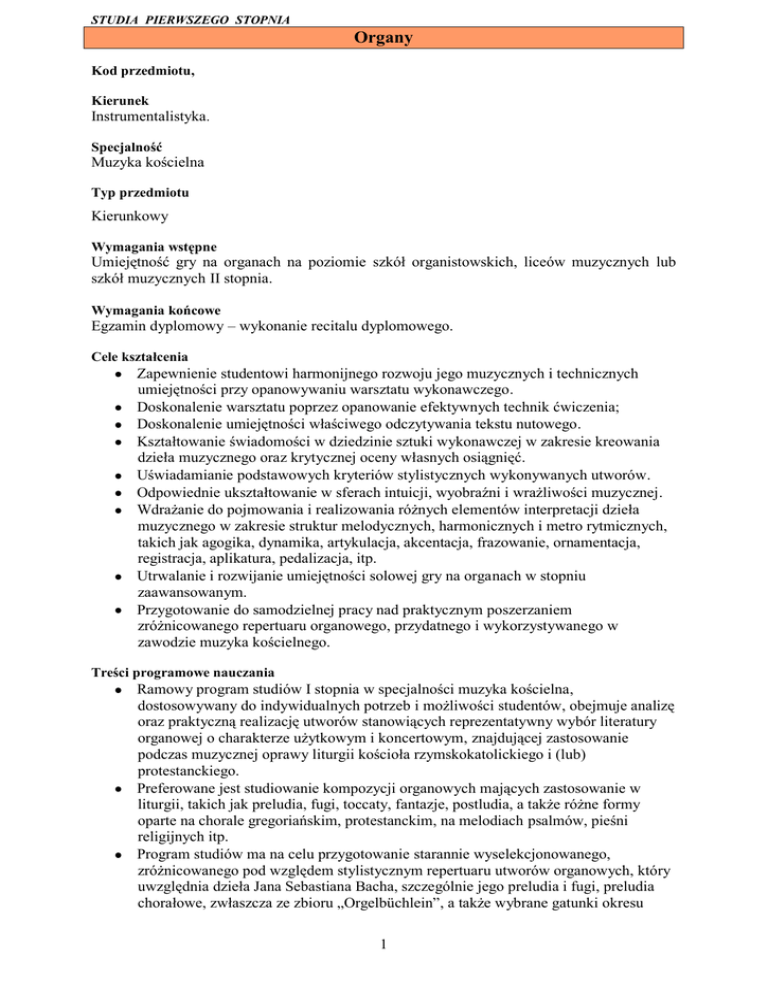 STUDIA PIERWSZEGO STOPNIA Organy Kod przedmiotu, Kierunek Instrumentalistyka. Specjalność Muzyka kościelna Typ przedmiotu Kierunkowy Wymagania wstępne Umiejętność gry na organach na poziomie szkół organistowskich, liceów muzycznych lub szkół muzycznych II stopnia. Wymagania końcowe Egzamin dyplomowy – wykonanie recitalu dyplomowego. Cele kształcenia Zapewnienie studentowi harmonijnego rozwoju jego muzycznych i technicznych umiejętności przy opanowywaniu warsztatu wykonawczego. Doskonalenie warsztatu poprzez opanowanie efektywnych technik ćwiczenia; Doskonalenie umiejętności właściwego odczytywania tekstu nutowego. Kształtowanie świadomości w dziedzinie sztuki wykonawczej w zakresie kreowania dzieła muzycznego oraz krytycznej oceny własnych osiągnięć. Uświadamianie podstawowych kryteriów stylistycznych wykonywanych utworów. Odpowiednie ukształtowanie w sferach intuicji, wyobraźni i wrażliwości muzycznej. Wdrażanie do pojmowania i realizowania różnych elementów interpretacji dzieła muzycznego w zakresie struktur melodycznych, harmonicznych i metro rytmicznych, takich jak agogika, dynamika, artykulacja, akcentacja, frazowanie, ornamentacja, registracja, aplikatura, pedalizacja, itp. Utrwalanie i rozwijanie umiejętności solowej gry na organach w stopniu zaawansowanym. Przygotowanie do samodzielnej pracy nad praktycznym poszerzaniem zróżnicowanego repertuaru organowego, przydatnego i wykorzystywanego w zawodzie muzyka kościelnego. Treści programowe nauczania Ramowy program studiów I stopnia w specjalności muzyka kościelna, dostosowywany do indywidualnych potrzeb i możliwości studentów, obejmuje analizę oraz praktyczną realizację utworów stanowiących reprezentatywny wybór literatury organowej o charakterze użytkowym i koncertowym, znajdującej zastosowanie podczas muzycznej oprawy liturgii kościoła rzymskokatolickiego i (lub) protestanckiego. Preferowane jest studiowanie kompozycji organowych mających zastosowanie w liturgii, takich jak preludia, fugi, toccaty, fantazje, postludia, a także różne formy oparte na chorale gregoriańskim, protestanckim, na melodiach psalmów, pieśni religijnych itp. Program studiów ma na celu przygotowanie starannie wyselekcjonowanego, zróżnicowanego pod względem stylistycznym repertuaru utworów organowych, który uwzględnia dzieła Jana Sebastiana Bacha, szczególnie jego preludia i fugi, preludia chorałowe, zwłaszcza ze zbioru „Orgelbüchlein”, a także wybrane gatunki okresu 1 przedbachowskiego (renesans, barok), utwory XIX i XX w. oraz dzieła muzyki polskiej. Na pierwszym roku studiów (I i II semestr) zwraca się szczególną uwagę na warsztat i wypracowanie umiejętności różnicowania techniki gry (w oparciu o wybór różnorodnych pod względem stylistycznym utworów organowych. Kolejne semestry (III, IV, V) to praca nad przygotowywaniem zróżnicowanego repertuaru, przydatnego do muzycznej oprawy mszy, nabożeństw oraz innych obrzędów liturgicznych. W każdym semestrze student przygotowuje repertuar o czasie trwania około 35 min., który wykonuje w części podczas egzaminu semestralnego oraz w ramach audycji. W VI semestrze student przygotowuje pod kierunkiem pedagoga program egzaminu dyplomowego. Program egzaminu dyplomowego o czasie trwania ok. 45 min., zaaprobowany przez pedagoga prowadzącego, podlega zatwierdzeniu przez Katedrę Organów, Klawesynu i Muzyki Dawnej. Efekty kształcenia (uczenia się) po ukończeniu przedmiotu - w zakresie wiedzy: Posiada znajomość podstawowego repertuaru związanego z własną specjalnością (K1_W02). - w zakresie umiejętności: Dysponuje umiejętnościami potrzebnymi do tworzenia i realizowania własnych koncepcji artystycznych (K1_U01). Jest świadomy sposobów wykorzystywania swej intuicji, emocjonalności i wyobraźni w obszarze ekspresji artystycznej (K1_U02). Posiada znajomość i umiejętność wykonywania reprezentatywnego repertuaru związanego z głównym kierunkiem studiów (K1_U04). Posiada umiejętność wykorzystywania wiedzy dotyczącej podstawowych kryteriów stylistycznych wykonywanych utworów (K1_U05). Posiada umiejętność właściwego odczytania tekstu nutowego, biegłego i pełnego przekazania materiału muzycznego, zawartych w utworze idei i jego formy (K1_U09). Opanował warsztat techniczny potrzebny do profesjonalnej prezentacji muzycznej i być świadomym problemów specyficznych dla danego instrumentu (K1_U10). Poprzez opanowanie efektywnych technik ćwiczenia wykazywać umiejętność doskonalenia warsztatu technicznego poprzez samodzielną pracę (K1_U12). Posiada umiejętność rozumienia i kontrolowania struktur rytmicznych, metrorytmicznych, aspektów dotyczących aplikatury, smyczkowania, pedalizacji, frazowania, struktury harmonicznej itp. opracowywanych utworów (K1_U13). - w zakresie kompetencji społecznych: Realizuje własne koncepcje i działania artystyczne oparte na zróżnicowanej stylistyce, wynikającej z niezależnego wykorzystania wyobraźni, ekspresji i intuicji (K1_K02). Metody nauczania Wykład, zajęcia indywidualne Nakład pracy studenta potrzebny do osiągnięcia efektów uczenia się ROK SEMESTR 1 I 2 3 II 4 5 6 Punkty ECTS 8 8 8 8 8 10 Ilość godzin w semestrze 30 30 30 30 30 30 2 III Rodzaj zaliczenia LEGENDA egz egz egz egz egz zal/ed zal –zaliczony; zs – zaliczenie ze stopniem; egz – egzamin; ed –egzamin dyplomowy Kryteria oceny Każdy semestr studiów (I-V) kończy się obowiązkowym egzaminem praktycznym w formie krótkiego recitalu o czasie trwania około 20 min.; studenci prezentują wówczas wybór z repertuaru, przygotowanego w ciągu danego semestru. Program egzaminu dyplomowego (semestr VI) winien zawierać solowe utwory organowe: wirtuozowskie i kantylenowe (chorałowe) mające zastosowanie w liturgii (ok. 45 min). Przy ustalaniu oceny bierze się pod uwagę następujące aspekty: - kwalifikacja (ilość i jakość) przygotowanego repertuaru, - rzeteln