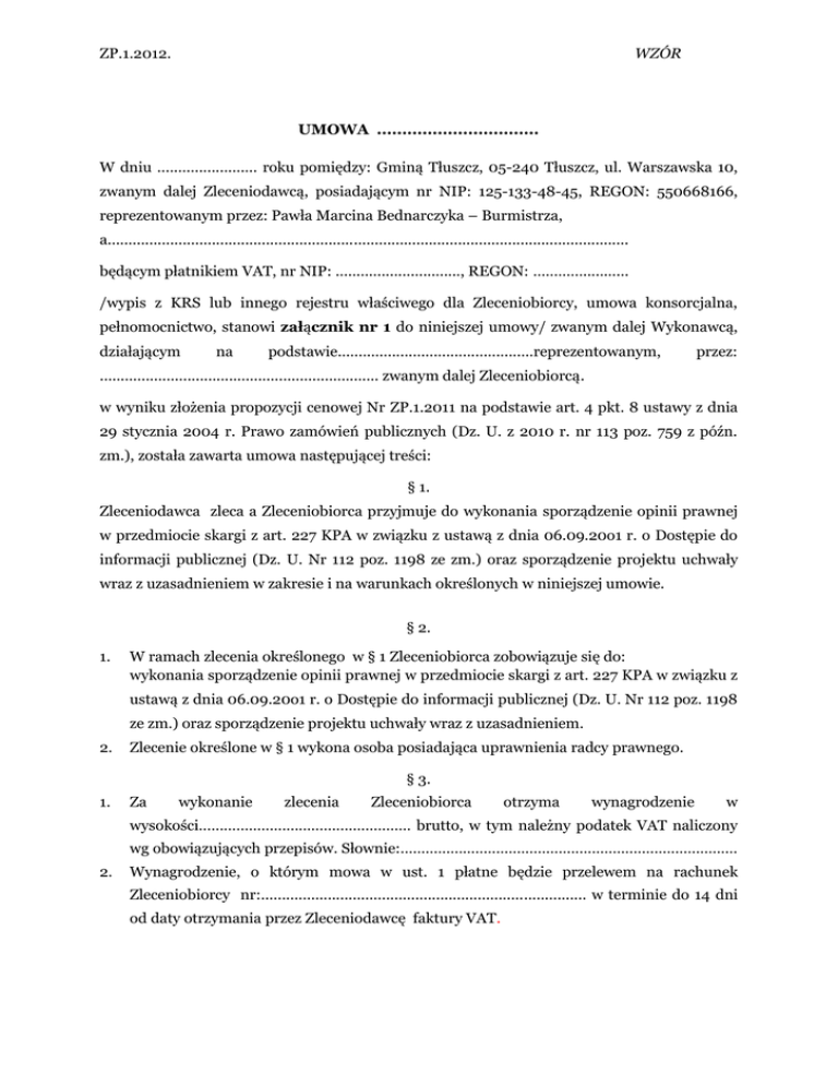 ZP.1.2012. WZÓR UMOWA ................................ W dniu ........................ roku pomiędzy: Gminą Tłuszcz, 05-240 Tłuszcz, ul. Warszawska 10, zwanym dalej Zleceniodawcą, posiadającym nr NIP: 125-133-48-45, REGON: 550668166, reprezentowanym przez: Pawła Marcina Bednarczyka – Burmistrza, a............................................................................................................................. będącym płatnikiem VAT, nr NIP: .............................., REGON: …………........... /wypis z KRS lub innego rejestru właściwego dla Zleceniobiorcy, umowa konsorcjalna, pełnomocnictwo, stanowi załącznik nr 1 do niniejszej umowy/ zwanym dalej Wykonawcą, działającym na podstawie...............................................reprezentowanym, przez: ................................................................... zwanym dalej Zleceniobiorcą. w wyniku złożenia propozycji cenowej Nr ZP.1.2011 na podstawie art. 4 pkt. 8 ustawy z dnia 29 stycznia 2004 r. Prawo zamówień publicznych (Dz. U. z 2010 r. nr 113 poz. 759 z późn. zm.), została zawarta umowa następującej treści: § 1. Zleceniodawca zleca a Zleceniobiorca przyjmuje do wykonania sporządzenie opinii prawnej w przedmiocie skargi z art. 227 KPA w związku z ustawą z dnia 06.09.20o1 r. o Dostępie do informacji publicznej (Dz. U. Nr 112 poz. 1198 ze zm.) oraz sporządzenie projektu uchwały wraz z uzasadnieniem w zakresie i na warunkach określonych w niniejszej umowie. § 2. 1. W ramach zlecenia określonego w § 1 Zleceniobiorca zobowiązuje się do: wykonania sporządzenie opinii prawnej w przedmiocie skargi z art. 227 KPA w związku z ustawą z dnia 06.09.20o1 r. o Dostępie do informacji publicznej (Dz. U. Nr 112 poz. 1198 ze zm.) oraz sporządzenie projektu uchwały wraz z uzasadnieniem. 2. Zlecenie określone w § 1 wykona osoba posiadająca uprawnienia radcy prawnego. § 3. 1. Za wykonanie zlecenia Zleceniobiorca otrzyma wynagrodzenie w wysokości…………………………………………… brutto, w tym należny podatek VAT naliczony wg obowiązujących przepisów. Słownie:……………………………………………………………………… 2. Wynagrodzenie, o którym mowa w ust. 1 płatne będzie przelewem na rachunek Zleceniobiorcy nr:.............................................................................. w terminie do 14 dni od daty otrzymania przez Zleceniodawcę faktury VAT. ZP.1.2012. WZÓR § 4. 1. Zleceniodawcy przysługuje prawno do naliczenia Zleceniobiorcy kar umownych za nieterminowe wykonanie przedmiotu umowy w wysokości 0,2% wartości wynagrodzenia o którym mowa w § 3 ust. 1, za każdy dzień opóźnienia w wykonaniu umowy w stosunku do terminu zapisanego umowie. 2. W przypadku zwłoki w zapłacie wynagrodzenia z tytułu należytego wykonania postanowień niniejszej umowy Zleceniodawca zapłaci na rzecz Zleceniobiorcy odsetki w ustawowej wysokości. 1. § 5. Celem umożliwienia Zleceniobiorcy wykonania zobowiązania objętego niniejszą umową Zleceniodawca udostępni wszelkie niezbędne dokumenty i informacje związane z powierzonym zleceniem.. 2. Odpowiedzialność Zleceniobiorcy za niewykorzystanie informacji lub dokumentów ogranicza się do tych informacji i dokumentów, które zostały ujawnione przez Zleceniodawcę. § 6. Zleceniobiorca zobowiązuje się do zachowania w tajemnicy wszelkich informacji, uzyskanych od Zleceniodawcy w związku z wykonywanymi czynnościami, objętymi zakresem zlecenia. § 7. Zleceniobiorca zobowiązuje się do wykonania przedmiotu do dnia................................... do godz. .......... § 8. Wszelkie wytwory działalności Zleceniobiorcy, opinia oraz projekt uchwały związane z wykonaniem przedmiotu umowy stanowią własność Zleceniodawcy z chwilą ich wydania Zleceniodawcy. § 9. W zakresie nieuregulowanym niniejszą umową obowiązują odpowiednie przepisy Kodeksu cywilnego. § 10. Umowa sporządzona została w czterech jednobrzmiących egzemplarzach jeden dla Zleceniobiorcy, trzy dla Zleceniodawcy. Zleceniodawca Zleceniobiorca ........................... ........................... ZP.1.2012. WZÓR