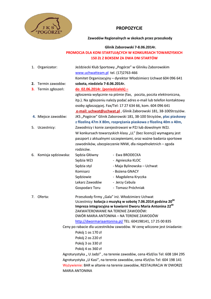 PROPOZYCJE Zawodów Regionalnych w skokach przez przeszkody Glinik Zaborowski 7-8.06.2014r. PROMOCJA DLA KONI STARTUJĄCYCH W KONKURSACH TOWARZYSKICH 150 ZŁ Z BOKSEM ZA DWA DNI STARTÓW 1. Organizator: 2. Termin zawodów: 3. Termin zgłoszeń: 4. Miejsce zawodów: 5. Uczestnicy: 6. Komisja sędziowska: 7. Oferta: Jeździecki Klub Sportowy „Pogórze” w Gliniku Zaborowskim www.uchwatteam.pl tel. (17)2763-466 Komitet Organizacyjny – dyrektor Włodzimierz Uchwat 604 096 641 sobota, niedziela 7-8.06.2014r. do 02.06.2014r. (poniedziałek) – zgłoszenia wyłącznie na piśmie (fax, poczta, poczta elektroniczna, itp.). Na zgłoszeniu należy podać adres e-mail lub telefon kontaktowy osoby zgłaszającej. Fax/Tel: 17 27 634 66, kom. 604 096 641 e-mail: [email protected] , Glinik Zaborowski 181, 38-100Strzyżów. JKS „Pogórze” Glinik Zaborowski 181, 38-100 Strzyżów, plac piaskowy z flizeliną 47m X 80m, rozprężania piaskowa z flizeliną 40m x 40m, Zawodnicy i konie zarejestrowani w PZJ lub dowolnym WZJ. W konkursach towarzyskich klasy „LL” (bez licencji) wymagany jest paszport z aktualnymi szczepieniami, oraz ważne badania sportowe zawodników, ubezpieczenie NNW, dla niepełnoletnich – zgoda rodziców. Sędzia Główny - Ewa BRODECKA Sędzia WZJ - Agnieszka KLOC Sędzia styl - Maja Bylinowska – Uchwat Komisarz - Bożena GNACY Sędziowie - Magdalena Kryczka Lekarz Zawodów - Jerzy Cebula Gospodarz Toru - Tomasz Próchniak Przeszkody firmy „Gala” inż. Włodzimierz Uchwat Uczestnicy: kolacja z muzyką w sobotę 7.06.2014 godzina 2000 Impreza integracyjna w kawiarni Dworu Maria Antonina 2200 ZAKWATEROWANIE NA TERENIE ZAWODÓW: DWÓR MARIA ANTONINA – NA TERENIE ZAWODÓW http://dwormariaantonina.pl/ TEL: 604198141, 17 25 00 835 Ceny po rabacie dla uczestników zawodów. W cenę wliczone jest śniadanie: Pokój 1 os 170 zł Pokój 2 os 220 zł Pokój 3 os 330 zł Pokój 4 os 360 zł Agroturystyka „ U Jadzi” , na terenie zawodów, cena 45zł/os Tel: 608 184 295 Agroturystyka „U Kasi”, na terenie zawodów, cena 45zł/os Tel: 604 198 141 Wyżywienie: BAR w altanie na terenie zawodów, RESTAURACJA W DWORZE MARIA ANTONINA Opłaty: a) 250 zł/ koń/zawody z boksem (2 dni startów) boksy letnie b) 150 zł/koń/zawody bez boksu (2 dni startów) c) 200 zł/ koń/ zawody z boksem (1 dzień startów) d) 100 zł/ koń/ zawody bez boksu (1 dzień startów) 150 zł/koń/ zawody z boksem (2 dni startów) PROMOCJA DOTYCZY KONI STARTUJĄCYCH TYLKO W KONKURSACH TOWARZYSKICH KLASY LL e) bez przedpłat, płatne w całości na miejscu zawodów f) zgłoszenia w terminie i nie wycofanie go do 05.06.2014r jest jednoznaczne z przyjęciem zobowiązania do zapłaty g) 50 zł –podłączenie koniowozu do prądu. h) Ilość boksów ograniczona (60 szt.) 8. Zawody rozgrywane zgodnie z Przepisami i Regulaminem PZJ. 9. Prosimy o przestrzeganie ciszy nocnej od godziny 23.oo do 7.oo 10. Kara finansowa za zakłócenie ciszy nocnej wynosi – 200 zł. – decyduje organizator. 11. Zgodnie z regulaminem B 2014, koń w wieku od 6 lat może startować 3 razy dziennie do wysokości max 105cm (max. dwukrotnie w jednym konkursie lub serii) 12. Organizator nie ponosi odpowiedzialności za kradzieże, wypadki i inne szkody mogące powstać w trakcie zawodów oraz w czasie transportu na i po zawodach. 13. Organizator zastrzega sobie prawo do korekt w programie i propozycjach zawodów. 14. Nagrody: Pula nagród wynosi 1500 zł +nagrody rzeczowe+ FLOTS + PUCHARY 15. Program zawodów: Sobota 7.06.2014r. 10.00 Konkurs nr T1 klasy LL „towarzyski” 60 cm, zwykły art. 238.2.1 (obydwa przejazdy zaliczane do klasyfikacji) Konkurs nr T2 klasy LL „towarzyski” 80 cm, zwykły art.238.2.1 (obydwa przejazdy zaliczane do klasyfikacji) Konkurs nr 1 klasy L – 100 cm, dokładności bez rozgrywki art.238.1.1 Konkurs nr 2 klasy L – 100 cm, na styl jeźdźca, EGZAMINACYJNY Konkurs nr 3 klasy P/P1 – 110/115 cm, dwufazowy, art. 274.5.6 Konkurs nr 4 klasy N/N1– 120/125 cm, dwufazowy, art. 274.5.6 Konkurs nr 5 klasy C – 130 cm, zwykły, art. 238.2.1, o puchar Burmistrza Miasta Strzyżowa pula nagród 500 zł (I – 200 zł, II – 150 zł, III – 100 zł, IV – 50 zł) Istnieje możliwość zorganizowania wyższych konkursów. Prosimy o ewentualne zgłoszenia. Niedziela 8.06.2014r. 9.00 Konkurs nr T3 klasy LL „towarzyski” 60 cm, zwykły art. 238.2.1 (obydwa przejazdy zaliczane do klasyfikacji) Konkurs nr T4 klasy LL „towarzyski” 80 cm, zwykły art.238.2.1 (obydwa przejazdy zaliczane do klasyfikacji) Konkurs nr 6 klasy L – 100 cm zwykły, art.238.2.1 Konkurs nr 7 klasy P – 110 cm zwykły, art.238.2.1 Konkurs nr 8 klasy N – 120 cm zwykły, art. 238.2.1 Konkurs nr 9 GRAND PRIX GLINIKA ZABOROWSKIEGO klasy C – 130 cm zwykły z rozgrywką , art. 238.2.2 Nagrody finansowe 1000zł+ puchary (I-300zł, II-250zł, III-200zł, IV-150zł,V-100zł) Istnieje możliwość zorganizowania wyższych konkursów. Prosimy o ewentualne zgłoszenia. Jeździecki Klub Sportowy „Pogórze” oraz Uchwat Team serdecznie zapraszają wszystkich zawodników na zawody do Glinika Zaborowskiego. więcej na www.uchwatteam.pl Polski Związek Jeździecki prosi wszystkie osoby zaangażowane w jakikolwiek sposób w sporty konne, o przestrzeganie poniżej przedstawionego kodeksu oraz zasady, że dobrostan konia jest najważniejszy. Dobrostan konia musi być zawsze uwzględniany w sportach konnych i nie może być podporządkowany współzawodnictwu sportowemu ani celom komercyjnym. KODEKS POSTĘPOWANIA Z KONIEM I. Na wszystkich etapach treningu i przygotowań konia do startów, dobrostan konia musi stać ponad wszelkimi innymi wymaganiami. Dotyczy to stałej opieki, metod treningu, starannego obrządku, kucia oraz transportu. II. Konie i jeźdźcy muszą być zdrowi, kompetentni i wytrenowani, zanim wezmą udział w zawodach. Dotyczy to także stosowanych leków, środków medycznych oraz zabiegów chirurgicznych zagrażających dobr