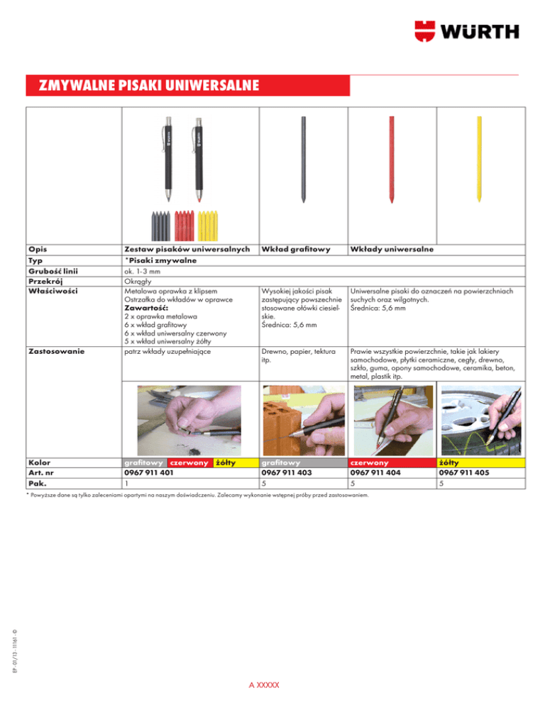 ZMYWALNE PISAKI UNIWERSALNE Opis Typ Grubość linii Przekrój Właściwości Wkład grafitowy Wkłady uniwersalne Wysokiej jakości pisak zastępujący powszechnie stosowane ołówki ciesielskie. Średnica: 5,6 mm Uniwersalne pisaki do oznaczeń na powierzchniach suchych oraz wilgotnych. Średnica: 5,6 mm Zastosowanie Zestaw pisaków uniwersalnych *Pisaki zmywalne ok. 1- 3 mm Okrągły Metalowa oprawka z klipsem Ostrzałka do wkładów w oprawce Zawartość: 2 x oprawka metalowa 6 x wkład grafitowy 6 x wkład uniwersalny czerwony 5 x wkład uniwersalny żółty patrz wkłady uzupełniające Drewno, papier, tektura itp. Prawie wszystkie powierzchnie, takie jak lakiery samochodowe, płytki ceramiczne, cegły, drewno, szkło, guma, opony samochodowe, ceramika, beton, metal, plastik itp. Kolor Art. nr Pak. grafitowy czerwony żółty 0967 911 401 1 grafitowy 0967 911 403 5 czerwony 0967 911 404 5 EP - 01/13 - 11161 - © * Powyższe dane są tylko zaleceniami opartymi na naszym doświadczeniu. Zalecamy wykonanie wstępnej próby przed zastosowaniem. A XXXXX żółty 0967 911 405 5