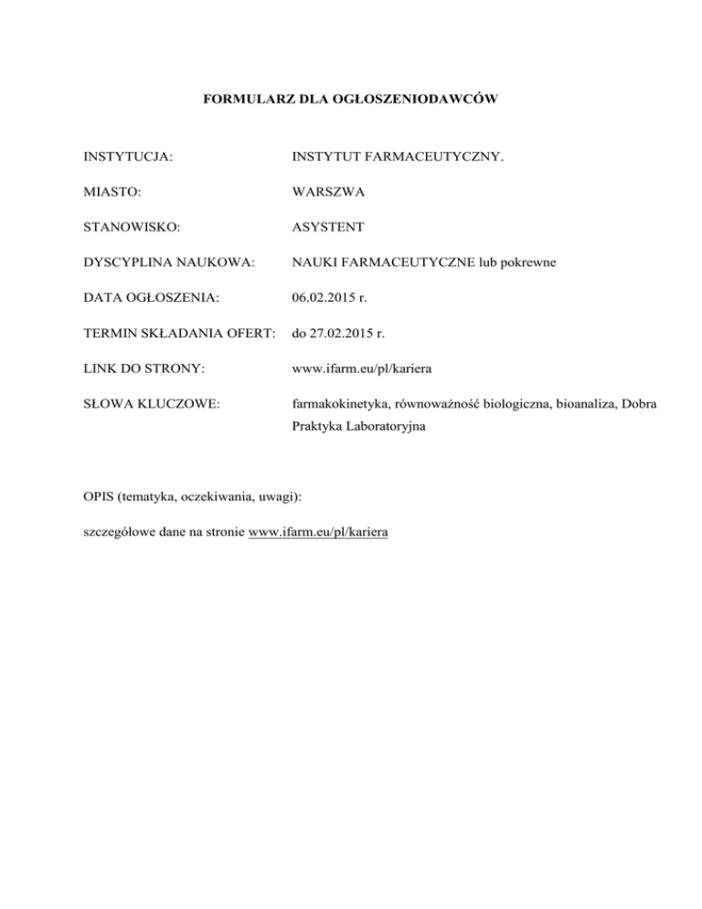 FORMULARZ DLA OGŁOSZENIODAWCÓW INSTYTUCJA: INSTYTUT FARMACEUTYCZNY. MIASTO: WARSZWA STANOWISKO: ASYSTENT DYSCYPLINA NAUKOWA: NAUKI FARMACEUTYCZNE lub pokrewne DATA OGŁOSZENIA: 06.02.2015 r. TERMIN SKŁADANIA OFERT: do 27.02.2015 r. LINK DO STRONY: www.ifarm.eu/pl/kariera SŁOWA KLUCZOWE: farmakokinetyka, równoważność biologiczna, bioanaliza, Dobra Praktyka Laboratoryjna OPIS (tematyka, oczekiwania, uwagi): szczegółowe dane na stronie www.ifarm.eu/pl/kariera