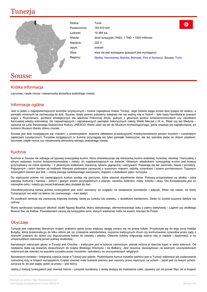 Tunezja Stolica: Tunis Powierzchnia: 163 610 km² Ludność: 10 384 tys. Waluta: dinar tunezyjski (TND), 1 TND = 1000 millimów Napięcie: 220 V Język: arabski Wiza: wiza nie jest wymagana (paszport jest wymagany) Regiony: Djerba, Hammamet, Mahdia, Monastir, Port el Kantaoui, Sousse, Tunis Sousse Krótka informacja Lazurowe, ciepłe morze i niesamowita atmosfera arabskiego miasta. Informacje ogólne Jest to jeden z najpopularniejszych kurortów turystycznych i trzecie największe miasto Tunezji. Jego historia sięga ponad dwa tysiące lat wstecz, a pamiątki minionych lat zachwycają do dziś. Sousse, dzięki swemu położeniu odegrało nie raz ważną rolę w historii – było bazą Hannibala w czasach wojen z Rzymianami, punktem strategicznym dla władców Północnej Afryki, jednym z głównych portów śródziemnomorskich czy ośrodkiem francuskiej władzy kolonialnej. Do najważniejszych i najciekawszych pamiątek historycznych należy Wielki Meczet z IX w., Ribat czy też Medyna – wpisana na Listę Światowego Dziedzictwa Kultury UNESCO. Warto udać się też do Muzeum Archeologicznego, gdzie znajdują się najpiękniejsze, po tuniskim Muzeum Bardo, zbiory mozaik. Sousse jest dziś rozwijającym się miastem z uniwersytetem, wieloma zakładami produkcyjnymi, międzynarodowym portem morskim i rozwiniętym zapleczem turystycznym. Turystów ściągających tu tłumnie przyciągają nie tylko pamiątki historyczne, ale też szerokie plaże ze złotym piaskiem, lazurowe, ciepłe morze czy niesamowita atmosfera starego, arabskiego miasta. Kuchnia Kuchnia w Sousse nie odbiega od typowej tunezyjskiej kuchni, która charakteryzuje się mieszanką kuchni arabskiej, tureckiej, włoskiej i francuskiej z silnym wpływem kuchni śródziemnomorskiej i należy do najpikantniejszych na świecie. Głównym składnikiem tunezyjskiej kuchni jest kuskus przyrządzany na różne sposoby – z pikantnymi kiełbasami, baraniną, rybami, jagnięciną i warzywami. Pojawiają się też ziemniaki, fasola i pomidory. Popularnym i tanim daniem są kiełbaski Marquez podawane zazwyczaj z suszonym mięsem, cebulą, czosnkiem i sosem pomidorowym. Typowym tunezyjskim daniem jest brik – rodzaj pieroga nadziewanego warzywami, mięsem, z dodatkiem jajka i tuńczyka. Do większości potraw nie zawierających kuskus podaje się pieczywo, które stanowi dopełnienie dania. Potrawy przyprawiane są słodką i ostrą papryką, kurkumą i harissą – ostrym i gęstym sosem przyrządzanym z papryki, czosnku, kolendry, mięty, kminku i oliwy. Dla Europejczyka jest on niezwykle ostry i należy go raczej traktować jako dodatek do dań. Charakterystyczną barwą potraw tunezyjskich jest kolor czerwony ze względu na dodawanie pomidorów i papryki. Mówi się nawet, że kiedy Tunezyjczyk nie widzi na talerzu nic czerwonego – traci apetyt. Po posiłkach serwuje się zazwyczaj miętową herbatę, kawę po turecku lub arabsku, z dodatkiem kardamonu. Deser to zwykle suszone daktyle lub cytrusy. Warto spróbować tutejszych alkoholi: wódki figowej Boukha, likieru daktylowego, sfermentowanego soku z palmy daktylowej – Laghmi czy słodkiego Muscat Sec de Kelibia. Powodzeniem cieszą się tunezyjskie wina, których większość trafia na export, również do Polski. Obyczaje Tunezja jest najbardziej liberalnym krajem arabskim gdzie coraz większą uwagę zwraca się na prawa kobiet. Przysłużyła się do tego żona Habiba Burgiby, która przekonała go do kilku reform jak np. zniesienie wielożeństwa, noszenia tradycyjnych chust czy kontrolowanie rozwodów przez sądy z równymi prawami do dzieci czy dopuszczenie kobiet do oświaty i władzy. Obecnie kobiety odgrywają ważna rolę w rządzie i dyplomacji, a na uniwersytetach stanowią ponad połowę studentów. Narodowym nakryciem głowy w Tunezji jest Chechia – tradycyjne jest w kolorze czerwonym, jednak można je obecnie kupić w wielu kolorach. Od niedawna stała się towarem eksportowym do krajów Bliskiego Wschodu i na Bałkany. Jest noszona obowiązkowo na ważnych uroczystościach rodzinnych jak również na wysokim szczeblu przez ministrów i sekretarzy na uroczystościach religijnych. Narodowym kwiatem i integralną częścią świąt w Tunezji jest jaśmin. Podarowanie komuś kwiatów jaśminu jest w Tunezji odbierane jak podarowanie czerwonej róży w krajach europejskich. Często również mały bukiecik jaśminu jest noszony przez mężczyzn za uchem – jeżeli jest za lewym uchem, oznacza to, że jest zajęty, jeżeli za prawy – jest wolny. Jedną z tradycji tunezyjskich jest również henna – proszek rozrabiany z wodą służący do malowania ciała, używany już od ponad 5tys. lat w krajach Wydruk ze strony http://klubwakacji.pl/ Informacje przygotowane przez MerlinX Strona 1/3 Północnej Afryki, Dalekiego Wschodu i Iniach. Nazwą henna określa się tu również wieczór panieński, podczas którego przyszła panna młoda zostaje ozdobiona wzorami z henny na rękach i nogach. Naprzemiennie z henną używa się harguus – który daje trwalszy efekt, jest czarny i często stosuje się go przy tatuażach. W krajach arabskich najważniejszym świętem jest Ramadan, czyli 30-dniowy okres postu, podczas którego muzułmanie od wschodu do zachodu słońca powstrzymują się od jedzenia i picia. Jest to święto ruchome ponieważ jego trwanie określa kalendarz księżycowy, a nie słoneczny. W tym czasie mogą wystąpić zmiany w godzinach pracy sklepów, muzeów i różnych instytucji. Jednak nie wpływa on znacząco na pobyt turystów. Podczas postu może być źle odebrane jedzenie na ulicy. Ważnym elementem życia muzułmanów jest modlitwa, przy której obowiązuje określony rytuał. Modląca się osoba zwraca się na wschód w kierunku Mekki i na klęczkach oddaje pokłony dotykając głową ziemi. W Tunezji, podobnie jak w innych krajach arabskich istnieje zwyczaj targowania się, który jest elementem tradycji zwłaszcza na bazarach. Cena spe