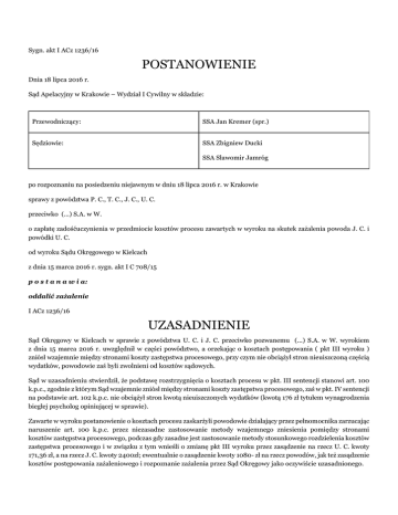 Sygn. akt I ACz 1236/16 POSTANOWIENIE Dnia 18 lipca 2016 r. Sąd Apelacyjny w Krakowie – Wydział I Cywilny w składzie: Przewodniczący: SSA Jan Kremer (spr.) Sędziowie: SSA Zbigniew Ducki SSA Sławomir Jamróg po rozpoznaniu na posiedzeniu niejawnym w dniu 18 lipca 2016 r. w Krakowie sprawy z powództwa P. C., T. C., J. C., U. C. przeciwko (...) S.A. w W. o zapłatę zadośćuczynienia w przedmiocie kosztów procesu zawartych w wyroku na skutek zażalenia powoda J. C. i powódki U. C. od wyroku Sądu Okręgowego w Kielcach z dnia 15 marca 2016 r. sygn. akt I C 708/15 p o s t a n a w i a: oddalić zażalenie I ACz 1236/16 UZASADNIENIE Sąd Okręgowy w Kielcach w sprawie z powództwa U. C. i J. C. przeciwko pozwanemu (...) S.A. w W. wyrokiem z dnia 15 marca 2016 r. uwzględnił w części powództwo, a orzekając o kosztach postępowania ( pkt III wyroku ) zniósł wzajemnie między stronami koszty zastępstwa procesowego, przy czym nie obciążył stron nieuiszczoną częścią wydatków, powodowie zaś byli zwolnieni od kosztów sądowych. Sąd w uzasadnieniu stwierdził, że podstawę rozstrzygnięcia o kosztach procesu w pkt. III sentencji stanowi art. 100 k.p.c., zgodnie z którym Sąd wzajemnie zniósł między stronami koszty zastępstwa procesowego, zaś w pkt. IV sentencji na podstawie art. 102 k.p.c. nie obciążył stron kwotą nieuiszczonych wydatków (kwotą 176 zł tytułem wynagrodzenia biegłej psycholog opiniującej w sprawie). Zawarte w wyroku postanowienie o kosztach procesu zaskarżyli powodowie działający przez pełnomocnika zarzucając naruszenie art. 100 k.p.c. przez niezasadne zastosowanie metody wzajemnego zniesienia pomiędzy stronami kosztów zastępstwa procesowego, podczas gdy zasadne jest zastosowanie metody stosunkowego rozdzielenia kosztów zastępstwa procesowego i w związku z tym wnieśli o zmianę pkt III wyroku przez zasądzenie na rzecz U. C. kwoty 171,36 zł, a na rzecz J. C. kwoty 2400zł; ewentualnie o zasądzenie kwoty 1080- zł na rzecz powodów, jak też zasądzenie kosztów postępowania zażaleniowego i rozpoznanie zażalenia przez Sąd Okręgowy jako oczywiście uzasadnionego. Sąd Apelacyjny zważył co następuje: Zażalenie nie jest zasadne. Pomijając dopuszczalność ewentualnego rozpoznania zażalenia przez Sąd I instancji, to już z wniosków zażalenia wynikało, że nie było ono oczywiście uzasadnione. Sąd Apelacyjny ustalił, że powodowie w pozwie wraz z T. i P. C. dochodzili łącznie 278 000zł, przy czym T. i P. C. zawarli z pozwanym w trakcie postępowania ugodę w kwotach po 18 800zł każdy, a w ugodzie otrzymali tytułem zwrotu kosztów zastępstwa procesowego po 1200zł, przy dochodzeniu w pozwie kwot po 82 000zł. Powód J. C. dochodził kwoty 30 000zł i taką na jego rzecz zasądzono, a powódka U. C. dochodziła kwoty 84 000zł , a uwzględniono 44 000zł. W pozwie wynagrodzenie pełnomocnika określone zostało na kwotę 14 400zł jako dwukrotność stawki minimalnej wynikającej z § 6 pkt 7 w zw. z § 2 pkt 2 Rozporządzenia Min. Spaw. Z dnia 28 września 2002 r. w sprawie opłat za czynności adwokackie …( Dz. U. Nr 163, poz. 1348 ze zm. ). W tym stanie rzeczy Sąd Apelacyjny zauważa, że powodowie występujący w sprawie wygrali łącznie 111 600zł, przy wartości przedmiotu sporu 278 000zł. Otrzymali przy zawarciu ugód 2400zł tytułem kosztów zastępstwa procesowego. Ponadto zauważyć należy, że w sprawie brak przesłanek do podwyższenia wynagrodzenia, sprawa była typowa, poza pozwem złożono dwa pisma procesowe, w tym jedno odnoszące się zwięźle do opinii biegłego. Pełnomocnik w pozwie określił sposób obliczenia wynagrodzenia. Sąd Najwyższy w uchwale z dnia 10 lipca 2015 r. III CZP 29/ 15 wskazał na możliwość obniżenia wynagrodzenia pełnomocnika przy uwzględnieniu nakładu pracy i charakteru sprawy. Uwzględniają okoliczności sprawy, a więc stanowisko zawarte w pozwie, nakład pracy, wynik łączny postępowania, brak podstaw do zmiany orzeczenia i zażalenie na podstawie art. 385 k.p.c. w zw. z art. 391 § 1 k.p.c. uległo oddaleniu. SSA Sławomir Jamróg SSA Jan Kremer SSA Zbigniew Ducki