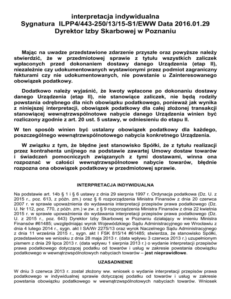 interpretacja indywidualna Sygnatura ILPP4/443-250/13/15-S1/EWW Data 2016.01.29 Dyrektor Izby Skarbowej w Poznaniu Mając na uwadze przedstawione zdarzenie przyszłe oraz powyższe należy stwierdzić, że w przedmiotowej sprawie z tytułu wszystkich zaliczek wpłaconych przed dokonaniem dostawy danego Urządzenia (etap II), niezależnie czy udokumentowanych wystawionymi przez podmiot zagraniczny fakturami czy nie udokumentowanych, nie powstanie u Zainteresowanego obowiązek podatkowy. Dodatkowo należy wyjaśnić, że kwoty wpłacone po dokonaniu dostawy danego Urządzenia (etap II), nie stanowiące zaliczek, nie będą rodziły powstania odrębnego dla nich obowiązku podatkowego, ponieważ jak wynika z niniejszej interpretacji, obowiązek podatkowy dla całej złożonej transakcji stanowiącej wewnątrzwspólnotowe nabycie danego Urządzenia winien być rozliczony zgodnie z art. 20 ust. 5 ustawy, w odniesieniu do etapu II. W ten sposób winien być ustalany obowiązek podatkowy dla każdego, poszczególnego wewnątrzwspólnotowego nabycia konkretnego Urządzenia. W związku z tym, że błędne jest stanowisko Spółki, że z tytułu realizacji przez kontrahenta unijnego na podstawie zawartej Umowy dostaw towarów i świadczeń pomocniczych związanych z tymi dostawami, winna ona rozpoznać w całości wewnątrzwspólnotowe nabycie towarów, błędnie rozpozna ona obowiązek podatkowy w przedmiotowej sprawie. INTERPRETACJA INDYWIDUALNA Na podstawie art. 14b § 1 i § 6 ustawy z dnia 29 sierpnia 1997 r. Ordynacja podatkowa (Dz. U. z 2015 r., poz. 613, z późn. zm.) oraz § 6 rozporządzenia Ministra Finansów z dnia 20 czerwca 2007 r. w sprawie upoważnienia do wydawania interpretacji przepisów prawa podatkowego (Dz. U. Nr 112, poz. 770, z późn. zm.) w zw. z § 9 rozporządzenia Ministra Finansów z dnia 22 kwietnia 2015 r. w sprawie upoważnienia do wydawania interpretacji przepisów prawa podatkowego (Dz. U. z 2015 r., poz. 643) Dyrektor Izby Skarbowej w Poznaniu działający w imieniu Ministra Finansów #61485; uwzględniając wyrok Wojewódzkiego Sądu Administracyjnego we Wrocławiu z dnia 4 lutego 2014 r., sygn. akt I SA/Wr 2275/13 oraz wyrok Naczelnego Sądu Administracyjnego z dnia 11 września 2015 r., sygn. akt I FSK 815/14 #61485; stwierdza, że stanowisko Spółki, przedstawione we wniosku z dnia 28 maja 2013 r. (data wpływu 3 czerwca 2013 r.) uzupełnionym pismem z dnia 29 lipca 2013 r. (data wpływu 1 sierpnia 2013 r.) o wydanie interpretacji przepisów prawa podatkowego dotyczącej podatku od towarów i usług w zakresie powstania obowiązku podatkowego w wewnątrzwspólnotowych nabyciach towarów – jest nieprawidłowe. UZASADNIENIE W dniu 3 czerwca 2013 r. został złożony ww. wniosek o wydanie interpretacji przepisów prawa podatkowego w indywidualnej sprawie dotyczącej podatku od towarów i usług w zakresie powstania obowiązku podatkowego w wewnątrzwspólnotowych nabyciach towarów. Wniosek uzupełniono pismem z dnia 29 lipca 2013 r. (data wpływu 1 sierpnia 2013 r.) o doprecyzowanie opisu sprawy. W przedmiotowym wniosku przedstawiono następujące zdarzenie przyszłe. Spółka jest czynnym podatnikiem podatku od towarów i usług, zarejestrowanym również dla transakcji wewnątrzwspólnotowych. Spółka prowadzi podstawową działalność gospodarczą w zakresie produkcji i sprzedaży metali oraz innych towarów i usług, których sprzedaż podlega opodatkowaniu VAT. Dla potrzeb prowadzonej działalności gospodarczej nabywa ona towary, tj. maszyny, urządzenia (dalej Urządzenia), które mają spełniać określone wymogi technicznowydajnościowe, przy czym Urządzenia te wymagają montażu i zabudowy w ciągach technologicznych Spółki, zaś ich wprowadzenie do użytkowania wymaga przeszkolenia pracowników Spółki (w zakresie obsługi, konserwacji, drobnych napraw). Ww. Urządzenia są to towary w rozumieniu art. 2 pkt 6 ustawy VAT, tj. nowe maszyny/urządzenia, wykorzystywane przez Spółkę do produkcji wyrobów sprzedawanych przez nią. Urządzenia które są przedmiotem niniejszej sprawy, nie stanowią jednak nowych środków transportu w rozumieniu art. 2 pkt 20 ustawy VAT, jak również dostaw z montażem w rozumieniu art. 22 w zw. z art. 12 ust. 1 pkt 1 ustawy VAT. Urządzenia te według regulacji ustawy o podatku dochodowym od osób prawnych zaliczane są zasadniczo (za wyjątkiem kosztów szkoleń) do środków trwałych/wydatków na modernizację środków trwałych (z uwagi na przewidywany okres użytkowania dłuższy niż rok). W ramach ww. nabyć Spółka dokonuje m.in. zakupu takich towarów jak: przenośniki i podajniki wibracyjne, filtry wody, chłodnie, filtry workowe wraz z urządzeniami przynależnymi dla instalacji odpylających, rozdzielnie 30kV, kotły odzysknicowe, turbozespoły parowe wraz z wyposażeniem, urządzenia do systemów sterowania procesu elektrorafinacji miedzi (szafy obiektowe, sterownicze, układy zasilania napędów i oświetlenia), urządzenia do rekonstrukcji instalacji odlewnictwa (m.in.: maszyny odlewnicze, chłodnie, prowadnice, piły, sprzęgła i ich części), pompy cyrkulacyjne. Zakup tych towarów dokonywany jest m.in. od podatników podatku od wartości dodanej posiadających siedziby i miejsca prowadzenia działalności gospodarczej na terytorium kraju UE, innym niż terytorium RP (dalej Dostawca). Wysyłka tych towarów do Polski jest realizowana również z kraju UE innego niż Polska, przy czym transport jest zawsze przyporządkowany do dostawy dokonywanej na rzecz Spółki. Powyższe Urządzenia Spółka nabywa na warunkach określonych w Umowach (DDP, DDU – wg Incoterms – wskazany zakład Spółki położony w Polsce), które Dostawca realizuje – stosownie do zapisów Umowy – etapami na przestrzeni kilkunastu, a nawet kilkudziesięciu miesięcy. Tak długotrwały okres realizacji Umowy wynika z faktu, że ww. Urządzenia nie stanowią towarów ogólnodostępnych na rynku lecz są budowan