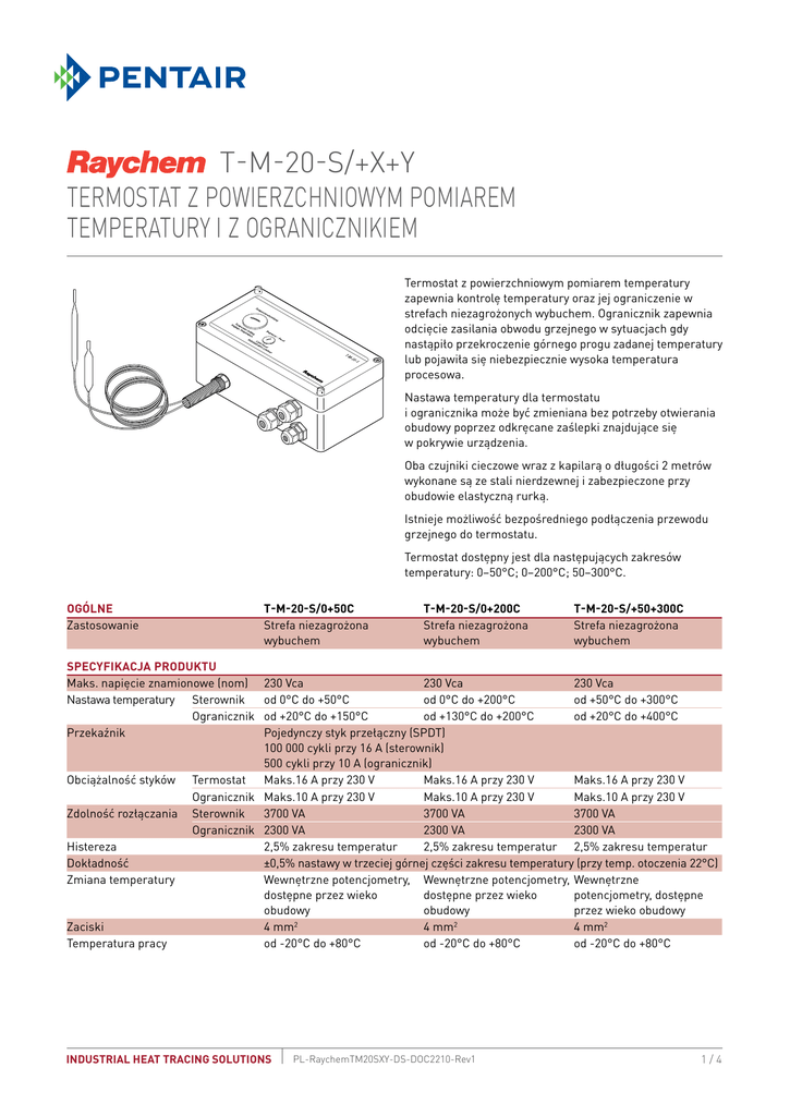 T-M-20-S/+x+y Termostat z powierzchniowym pomiarem temperatury i z ogranicznikiem Termostat z powierzchniowym pomiarem temperatury zapewnia kontrolę temperatury oraz jej ograniczenie w strefach niezagrożonych wybuchem. Ogranicznik zapewnia odcięcie zasilania obwodu grzejnego w sytuacjach gdy nastąpiło przekroczenie górnego progu zadanej temperatury lub pojawiła się niebezpiecznie wysoka temperatura procesowa. T Nastawa temperatury dla termostatu i ogranicznika może być zmieniana bez potrzeby otwierania obudowy poprzez odkręcane zaślepki znajdujące się w pokrywie urządzenia. Oba czujniki cieczowe wraz z kapilarą o długości 2 metrów wykonane są ze stali nierdzewnej i zabezpieczone przy obudowie elastyczną rurką. Istnieje możliwość bezpośredniego podłączenia przewodu grzejnego do termostatu. Termostat dostępny jest dla następujących zakresów temperatury: 0–50°C; 0–200°C; 50–300°C. Ogólne Zastosowanie T-M-20-S/0+50C Strefa niezagrożona wybuchem T-M-20-S/0+200C Strefa niezagrożona wybuchem T-M-20-S/+50+300C Strefa niezagrożona wybuchem Specyfikacja produktu Maks. napięcie znamionowe (nom) Nastawa temperatury Sterownik Ogranicznik Przekaźnik Obciążalność styków Zdolność rozłączania Histereza Dokładność Zmiana temperatury Zaciski Temperatura pracy 230 Vca 230 Vca 230 Vca od 0°C do +50°C od 0°C do +200°C od +50°C do +300°C od +20°C do +150°C od +130°C do +200°C od +20°C do +400°C Pojedynczy styk przełączny (SPDT) 100 000 cykli przy 16 A (sterownik) 500 cykli przy 10 A (ogranicznik) Termostat Maks.16 A przy 230 V Maks.16 A przy 230 V Maks.16 A przy 230 V Ogranicznik Maks.10 A przy 230 V Maks.10 A przy 230 V Maks.10 A przy 230 V Sterownik 3700 VA 3700 VA 3700 VA Ogranicznik 2300 VA 2300 VA 2300 VA 2,5% zakresu temperatur 2,5% zakresu temperatur 2,5% zakresu temperatur ±0,5% nastawy w trzeciej górnej części zakresu temperatury (przy temp. otoczenia 22°C) Wewnętrzne potencjometry, Wewnętrzne potencjometry, Wewnętrzne dostępne przez wieko potencjometry, dostępne dostępne przez wieko przez wieko obudowy obudowy obudowy 4 mm2 4 mm2 4 mm2 od -20°C do +80°C od -20°C do +80°C od -20°C do +80°C INDUSTRIAL HEAT TRACING SOLUTIONS PL-RaychemTM20SXY-DS-DOC2210-Rev1 1/4 T-M-20-S/+x+y Wymiary (w mm) 220 90 204 82 Przekaźniki Przekaźnik sterujący Przekaźnik ogranicznika Obudowa Stopień ochrony Wymiary Materiał Mocowanie pokrywy Otwory pod dławiki kablowe Czujnik temperatury Typ T-M-20-S/0+50C Przekaźnik sterujący Przekaźnik ogranicznika 120 T-M-20-S/0+200C T-M-20-S/+50+300C IP65 IP65 IP65 222 x 120 x 90 mm 222 x 120 x 90 mm 222 x 120 x 90 mm Poliester, kolor szary Poliester, kolor szary Poliester, kolor szary 4 nierdzewne, niewypadające śruby 3 wejścia: 1 x Reduktor M25 (męski)/M20 (żeński) oraz dławik M20 (Ø 8–13 mm) 1 x Dławik M20 (Ø 8–13 mm) 1 x Dławik M20 (Ø 8–13 mm) Czujnik cieczowy z kapilarą, długość 2 m Wymiary Termostat Materiał Temp. oddziaływania Termostat Ogranicznik Minimalny promień gięcia 8 mm 8 mm 166 mm 78 mm 6 mm 6 mm 80 mm 78 mm Stal nierdzewna Stal nierdzewna od -40°C do +60°C od -20°C do +230°C od -40°C do +170°C od -20°C do +230°C 10 mm dla kapilary (czujnika nie można zginać) Metoda montażu Wspornik montażowy SB-120 lub montaż powierzchniowy Ogranicznik 2/4 ∅ Długość czujnika ∅ Długość czujnika PL-RaychemTM20SXY-DS-DOC2210-Rev1 8 mm 56 mm 6 mm 176 mm Stal nierdzewna od -20°C do +345°C od -40°C do +500°C INDUSTRIAL HEAT TRACING SOLUTIONS T-M-20-S/+x+y Specyfikacja zamówienia Symbol T-M-20-S/0+50C T-M-20-S/0+200C T-M-20-S/+50+300C Nr katalogowy 260448-000 750502-000 608706-000 Waga 1,9 kg 1,9 kg 1,9 kg Objaśnienia opisu: T-M-20-S/+x+y T = termostat M = termostat mechaniczny 20 = termostat sterujący + ogranicznik S = pomiar powierzchniowy x = minimalna temperatura nastawy termostatu y = maksymalna temperatura nastawy termostatu Schemat połączeń L N PE Max C16A Ogranicznik Termostat 1 1 30 mA T 4 1 2 3 2 4 2 5 6 7 4 8 Przewód grzejny INDUSTRIAL HEAT TRACING SOLUTIONS PL-RaychemTM20SXY-DS-DOC2210-Rev1 3/4 WWW.PENTAIRTHERMAL.PL POLSKA Tel. +48 22 331 29 50 Fax +48 22 331 29 51 [email protected] All Pentair trademarks and logos are owned by Pentair or its global affiliates. Pentair reserves the right to change specifications without prior notice. © 2012-2014 Pentair. INDUSTRIAL HEAT TRACING SOLUTIONS PL-RaychemTM20SXY-DS-DOC2210-Rev1 4/4