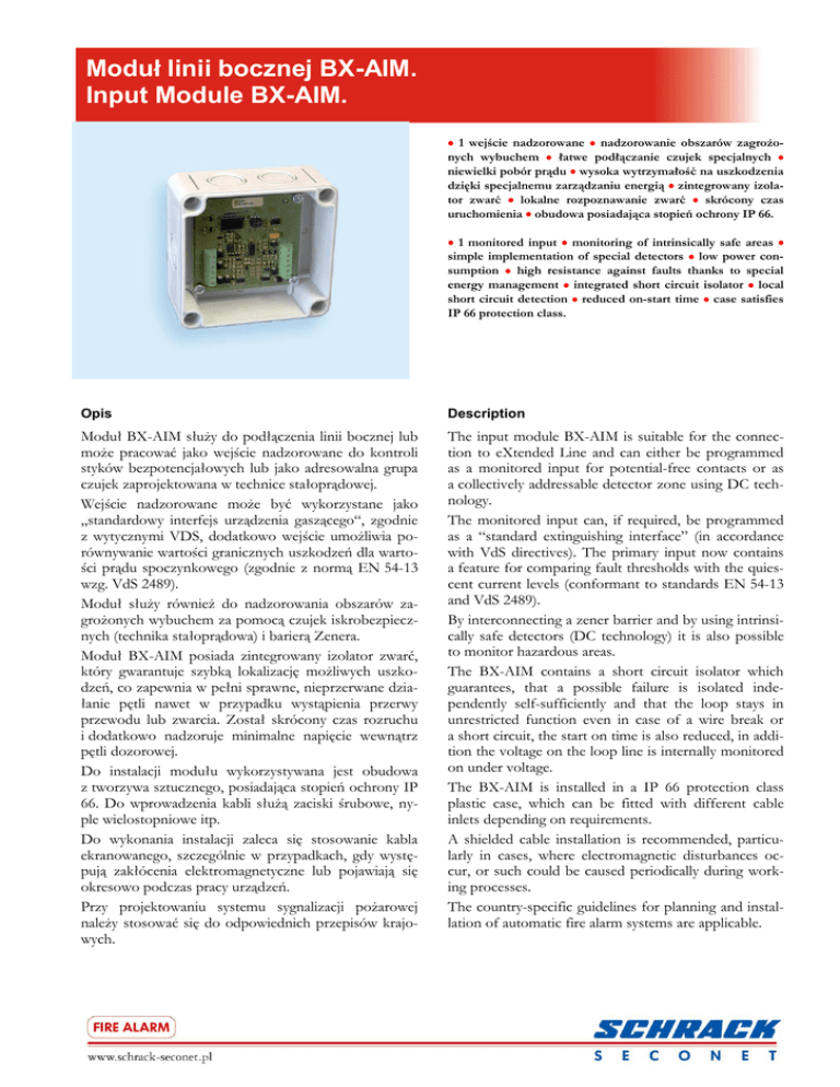 Moduł linii bocznej BX-AIM. Input Module BX-AIM. 1 wejście nadzorowane nadzorowanie obszarów zagrożonych wybuchem łatwe podłączanie czujek specjalnych niewielki pobór prądu wysoka wytrzymałość na uszkodzenia dzięki specjalnemu zarządzaniu energią zintegrowany izolator zwarć lokalne rozpoznawanie zwarć skrócony czas uruchomienia obudowa posiadająca stopień ochrony IP 66. 1 monitored input monitoring of intrinsically safe areas simple implementation of special detectors low power consumption high resistance against faults thanks to special energy management integrated short circuit isolator local short circuit detection reduced on-start time case satisfies IP 66 protection class. Opis Description Moduł BX-AIM służy do podłączenia linii bocznej lub może pracować jako wejście nadzorowane do kontroli styków bezpotencjałowych lub jako adresowalna grupa czujek zaprojektowana w technice stałoprądowej. Wejście nadzorowane może być wykorzystane jako „standardowy interfejs urządzenia gaszącego“, zgodnie z wytycznymi VDS, dodatkowo wejście umożliwia porównywanie wartości granicznych uszkodzeń dla wartości prądu spoczynkowego (zgodnie z normą EN 54-13 wzg. VdS 2489). Moduł służy również do nadzorowania obszarów zagrożonych wybuchem za pomocą czujek iskrobezpiecznych (technika stałoprądowa) i barierą Zenera. Moduł BX-AIM posiada zintegrowany izolator zwarć, który gwarantuje szybką lokalizację możliwych uszkodzeń, co zapewnia w pełni sprawne, nieprzerwane działanie pętli nawet w przypadku wystąpienia przerwy przewodu lub zwarcia. Został skrócony czas rozruchu i dodatkowo nadzoruje minimalne napięcie wewnątrz pętli dozorowej. Do instalacji modułu wykorzystywana jest obudowa z tworzywa sztucznego, posiadająca stopień ochrony IP 66. Do wprowadzenia kabli służą zaciski śrubowe, nyple wielostopniowe itp. Do wykonania instalacji zaleca się stosowanie kabla ekranowanego, szczególnie w przypadkach, gdy występują zakłócenia elektromagnetyczne lub pojawiają się okresowo podczas pracy urządzeń. Przy projektowaniu systemu sygnalizacji pożarowej należy stosować się do odpowiednich przepisów krajowych. The input module BX-AIM is suitable for the connection to eXtended Line and can either be programmed as a monitored input for potential-free contacts or as a collectively addressable detector zone using DC technology. The monitored input can, if required, be programmed as a “standard extinguishing interface” (in accordance with VdS directives). The primary input now contains a feature for comparing fault thresholds with the quiescent current levels (conformant to standards EN 54-13 and VdS 2489). By interconnecting a zener barrier and by using intrinsically safe detectors (DC technology) it is also possible to monitor hazardous areas. The BX-AIM contains a short circuit isolator which guarantees, that a possible failure is isolated independently self-sufficiently and that the loop stays in unrestricted function even in case of a wire break or a short circuit, the start on time is also reduced, in addition the voltage on the loop line is internally monitored on under voltage. The BX-AIM is installed in a IP 66 protection class plastic case, which can be fitted with different cable inlets depending on requirements. A shielded cable installation is recommended, particularly in cases, where electromagnetic disturbances occur, or such could be caused periodically during working processes. The country-specific guidelines for planning and installation of automatic fire alarm systems are applicable. Technical data Napięcie robocze: +10 do +29 VDC Prąd roboczy: bez stałoprądowej linii bocznej: typowo 460µA ze stałoprądową linią boczną: typowo 1800µA Transmisja sygnału: szeregowa, technika 2-przewodowa Działanie: stałoprądowa linia boczna, wejście nadzorowane Zaciski połączeniowe: zaciski śrubowe, maks. 1,5 mm² Izolator zwarć: zintegrowany Stopień ochrony: IP 66 wraz z obudową Temperatura otoczenia: -20 do +60°C Wilgotność względna: 5 do 95%, bez kondensacji Wymiary: 67x67x20mm (z obudową 94x94x57mm) Obudowa: polistyren, bezhalogenowy Kolor: szary (RAL 7035) Dopuszczenie VDS: wniosek złożony Operating voltage: Current consumption: without DC branch: with DC branch: Signal transmission: Function: Connection: Short circuit isolator: Protection class: Ambient temperature: Relative air humidity: Dimensions: Case: Colour: VdS-Approval: +10 to +29 VDC typ. 460 µA typ. 1800 µA serial, 2 wire technology DC branch module, monitored input Screw clips, max. 1.5 mm² integrated IP 66 with case -20° to +60°C 5 to 95% without condensation 67 x 67 x 20 mm (with case 94 x 94 x 57 mm) Polystyrol, halogen-free grey (RAL 7035) applied for © Schrack Productions - DB0061DE - BX-AIM - V1.0 Zmiany techniczne zastrzeżone- subject to technical modifications Dane techniczne Dokładne informacje są dostępne w dokumentacji technicznej. Further informations can be obtained from the technical documentation. Moduł linii bocznej BX-AIM. Input Module BX-AIM.