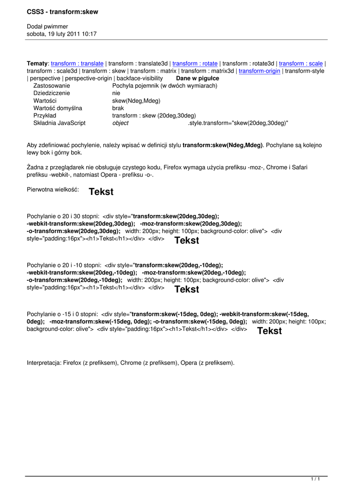 CSS3 - transform:skew Dodał pwimmer sobota, 19 luty 2011 10:17 Tematy: transform : translate | transform : translate3d | transform : rotate | transform : rotate3d | transform : scale | transform : scale3d | transform : skew | transform : matrix | transform : matrix3d | transform-origin | transform-style | perspective | perspective-origin | backface-visibility Dane w pigułce Zastosowanie Pochyla pojemnik (w dwóch wymiarach) Dziedziczenie nie Wartości skew(Ndeg,Mdeg) Wartość domyślna brak Przykład transform : skew (20deg,30deg) Składnia JavaScript object .style.transform="skew(20deg,30deg)" Aby zdefiniować pochylenie, należy wpisać w definicji stylu transform:skew(Ndeg,Mdeg). Pochylane są kolejno lewy bok i górny bok. Żadna z przeglądarek nie obsługuje czystego kodu, Firefox wymaga użycia prefiksu -moz-, Chrome i Safari prefiksu -webkit-, natomiast Opera - prefiksu -o-. Pierwotna wielkość: Tekst Pochylanie o 20 i 30 stopni: <div style="transform:skew(20deg,30deg); -webkit-transform:skew(20deg,30deg); -moz-transform:skew(20deg,30deg); -o-transform:skew(20deg,30deg); width: 200px; height: 100px; background-color: olive"> <div style="padding:16px"><h1>Tekst</h1></div> </div> Tekst Pochylanie o 20 i -10 stopni: <div style="transform:skew(20deg,-10deg); -webkit-transform:skew(20deg,-10deg); -moz-transform:skew(20deg,-10deg); -o-transform:skew(20deg,-10deg); width: 200px; height: 100px; background-color: olive"> <div style="padding:16px"><h1>Tekst</h1></div> </div> Tekst Pochylanie o -15 i 0 stopni: <div style="transform:skew(-15deg, 0deg); -webkit-transform:skew(-15deg, 0deg); -moz-transform:skew(-15deg, 0deg); -o-transform:skew(-15deg, 0deg); width: 200px; height: 100px; background-color: olive"> <div style="padding:16px"><h1>Tekst</h1></div> </div> Tekst Interpretacja: Firefox (z prefiksem), Chrome (z prefiksem), Opera (z prefiksem). 1/1