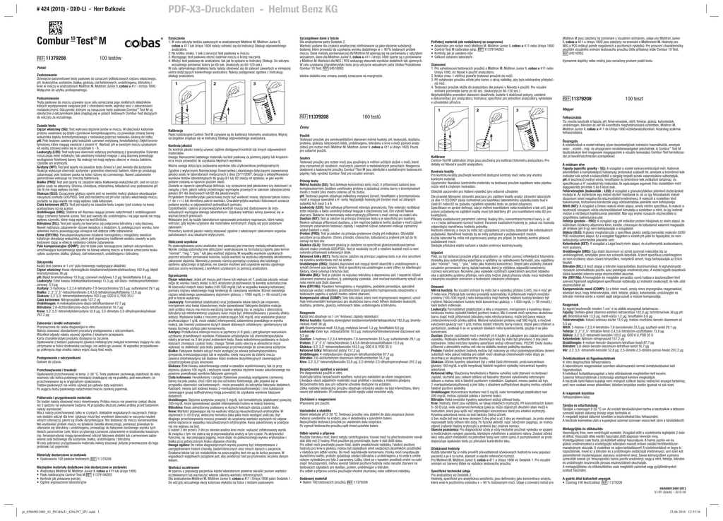 # 424 (2010) - DXO-LI - Herr Butkovic Combur 10 Test® M 5() 11379208 100 testów Polski Zastosowanie Dziesięcio-parametrowe testy paskowe do oznaczeń półilościowych ciężaru właściwego, pH, leukocytów, azotanów, białka, glukozy, ciał ketonowych, urobilinogenu, bilirubiny i krwi w moczu w analizatorach Miditron M, Miditron Junior II, cobas u 411 i Urisys 1800. Wyłącznie do użytku profesjonalnego. PDF-X3-Druckdaten - Helmut Benz KG Oznaczenie 1.W celu odczytu testów paskowych w analizatorach Miditron M, Miditron Junior II, cobas u 411 lub Urisys 1800 należy odnieść się do Instrukcji Obsługi odpowiedniego analizatora. 2.Na krótko (maks. 1 sek.) zanurzyć test paskowy w moczu. 3.Wyciągając test paskowy otrzeć nadmiar moczu o brzeg naczynia. 4.Włożyć test paskowy do analizatora, tak jak to opisano w Instrukcji Obsługi. Do odczytu wizualnego porównać kolory po 60 sek. (leukocyty po 60-120 sek.). W celu optymalnego działania testu należy stosować się do zaleceń zawartych w niniejszej ulotce dotyczących konkretnego analizatora. Należy postępować zgodnie z instrukcją obsługi analizatora. Podsumowanie Testy paskowe do moczu używane są w celu oznaczania jego niektórych składników których występowanie związane jest z chorobami nerek, wątroby oraz z zaburzeniami metabolicznymi. Odczynniki, którymi są nasączone testy paskowe Combur10 Test M są identyczne z odczynnikami jakie znajdują się w polach testowych Combur-Test służących do odczytu za wizualnego. Zasada testu Ciężar właściwy (SG): Test wykrywa stężenie jonów w moczu. W obecności kationów protony uwalniane są dzięki czynnikowi kompleksującemu, co powoduje zmianę barwy wskaźnika błękitu bromotymolowego z niebieskiej poprzez niebiesko-zieloną do żółtej. pH: Pole testowe zawiera jako wskaźnik czerwień metylową, fenoloftaleinę i błękit bromotymolowy, które reagują swoiście z jonami H+. Wartość pH w świeżym moczu uzyskanym od osoby zdrowej waha się w przedziale 5 - 6. Leukocyty (LEU): Test wykrywa obecność esterazy pochodzącej z granulocytów. Esteraza rozszczepia ester indoksylu; tak uwolniony indoksyl reaguje z solą diazową powodując wystąpienie fioletowej barwy. Na reakcję nie mają wpływu obecne w moczu bakterie, rzęsistki ani erytrocyty. Azotyny (NIT): Test jest oparty na zasadzie testu Griess‘a i jest swoisty dla azotynów. Reakcja wykazuje obecność azotynów i pośrednio obecność bakterii, które go produkują zabarwiając pole testowe paska na kolor różowy do czerwonego. Nawet zabarwienie jasnoróżowe wskazuje na znaczną bakteriurię. Białko (PRO): Test jest oparty na zasadzie błędu białkowego wskaźnika pH. Jest on szczególnie czuły na albuminy. Chinina, chinidyna, chlorochina, tolbutamid oraz podniesione pH (do 9) nie mają wpływu na test. Glukoza (GLU): Oznaczenie glukozy oparte jest na swoistej reakcji glukoza-oksydaza/peroksydaza (metoda GOD/POD). Test jest niezależny od pH oraz ciężaru właściwego moczu, ponadto na jego wynik nie mają wpływu ciała ketonowe. Ciała ketonowe (KET): Test jest oparty na zasadzie testu Legala i jest czulszy na kwas acetooctowy niż na aceton. Urobilinogen (UBG): Stabilna sól diazowa reaguje prawie natychmiast z urobilinogenem dając czerwony barwnik azowy. Test jest swoisty dla urobilinogenu i na jego wynik nie mają wpływu czynniki, które mają wpływ na test Ehrlicha. Bilirubina (BIL): Test jest oparty na tworzeniu się połączenia bilirubiny z solą diazową. Nawet najlżejsze zabarwienie różowe świadczy o dodatnim, tj. patologicznym wyniku. Inne składniki moczu powodują jego silniejsze lub słabsze żółte zabarwienie. Krew (ERY/Hb): Pseudoperoksydazowe działanie hemoglobiny i mioglobiny swoiście katalizuje oksydację wskaźnika, jakim jest organiczny nadtlenek wodoru zawarty w polu testowym dając w efekcie niebiesko-zielone zabarwienie. Pole kompensacyjne (COMP): Jest to białe pole nienasączone żadnym odczynnikiem, umożliwiające kompensację aparatu na barwę własną moczu w trakcie oznaczania leukocytów, azotynów, białka, glukozy, ciał ketonowych, urobilinogenu i bilirubiny. Odczynniki Każdy test zawiera w 1 cm2 pola testowego następujące składniki: Ciężar właściwy: Kwas etylenoglikolo-bis(diaminoetyloetero)tetraoctowy 182.8 µg; błękit bromotymolowy 36 µg: pH: Błękit bromotymolowy 13.9 µg; czerwień metylowa 1.2 µg; fenoloftaleina 8.6 µg. Leukocyty: Ester kwasu indoksylokarbonowego 15.5 µg; sól diazo- metoksymorfolinobenzenową 5.5 µg Azotyny: 3-hydroksy-1,2,3,4-tetrahydro-7,8-benzochinolina 33.5 µg; sulfanilamid 29.1 µg. Białko: 3’,3’’,5’,5’’-tetrachlorofenolo-3,4,5,6-tetrabromosulfoftaleina 13.9 µg Glukoza: 3,3’,5,5’-tetrametylobenzydyna 103.5 µg; GOD 6 U, POD 35 U Ciała ketonowe: Nitroprusydek sodu 157.2 µg Urobilinogen: 4-metoksybenzeno-diazo-tetrafluoroboran 67.7 µg Bilirubina: 2.6-dichlorobenzeno-diazo-tetrafluoroboran 16.7 µg Krew: 3,3’,5,5’-tetrametylobenzydyna 52.8 µg; 2,5-dimetylo-2,5-dihydroperoksyheksan 297.2 µg Kalibracja Paski kalibracyjne Control-Test M używane są do kalibracji fotometru analizatora. Więcej szczegółów znajduje się w Instrukcji Obsługi odpowiedniego analizatora. Kontrola jakości Do kontroli jakości należy używać ogólnie dostępnych kontroli lub innych odpowiednich materiałów. Uwaga: Nanoszenie badanego materiału na test paskowy za pomocą pipety lub kroplomierza może prowadzić do uzyskania błędnych wyników. Ważna uwaga dotycząca podawania wyników (dla użytkownikow profesjonalnych) Zgodnie z wytycznymi Niemieckiego Towarzystwa Lekarskiego dotyczącymi zapewnienia jakości analiz w laboratoriach medycznych z dnia 23/11/2007, decyzja o sklasyfikowaniu wyników testów laboratoryjnych do grupy B1 lub B2 zależy od sposobu, w jaki wyniki podane zostaną w raporcie (poziom skali). Zawarta w raporcie specyfikacja definiuje, czy oznaczenie jest jakościow