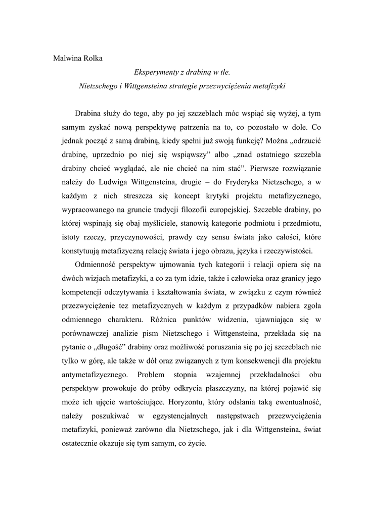 Malwina Rolka Eksperymenty z drabiną w tle. Nietzschego i Wittgensteina strategie przezwyciężenia metafizyki Drabina służy do tego, aby po jej szczeblach móc wspiąć się wyżej, a tym samym zyskać nową perspektywę patrzenia na to, co pozostało w dole. Co jednak począć z samą drabiną, kiedy spełni już swoją funkcję? Można „odrzucić drabinę, uprzednio po niej się wspiąwszy” albo „znad ostatniego szczebla drabiny chcieć wyglądać, ale nie chcieć na nim stać”. Pierwsze rozwiązanie należy do Ludwiga Wittgensteina, drugie – do Fryderyka Nietzschego, a w każdym z nich streszcza się koncept krytyki projektu metafizycznego, wypracowanego na gruncie tradycji filozofii europejskiej. Szczeble drabiny, po której wspinają się obaj myśliciele, stanowią kategorie podmiotu i przedmiotu, istoty rzeczy, przyczynowości, prawdy czy sensu świata jako całości, które konstytuują metafizyczną relację świata i jego obrazu, języka i rzeczywistości. Odmienność perspektyw ujmowania tych kategorii i relacji opiera się na dwóch wizjach metafizyki, a co za tym idzie, także i człowieka oraz granicy jego kompetencji odczytywania i kształtowania świata, w związku z czym również przezwyciężenie tez metafizycznych w każdym z przypadków nabiera zgoła odmiennego charakteru. Różnica punktów widzenia, ujawniająca się w porównawczej analizie pism Nietzschego i Wittgensteina, przekłada się na pytanie o „długość” drabiny oraz możliwość poruszania się po jej szczeblach nie tylko w górę, ale także w dół oraz związanych z tym konsekwencji dla projektu antymetafizycznego. Problem stopnia wzajemnej przekładalności obu perspektyw prowokuje do próby odkrycia płaszczyzny, na której pojawić się może ich ujęcie wartościujące. Horyzontu, który odsłania taką ewentualność, należy poszukiwać w egzystencjalnych następstwach przezwyciężenia metafizyki, ponieważ zarówno dla Nietzschego, jak i dla Wittgensteina, świat ostatecznie okazuje się tym samym, co życie.