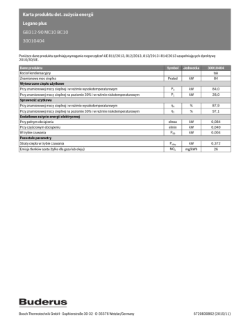 Karta produktu dot. zużycia energii Logano plus GB312-90 MC10 BC10 30010404 Poniższe dane produktu spełniają wymagania rozporządzeń UE 811/2013, 812/2013, 813/2013 i 814/2013 uzupełniających dyrektywę 2010/30/UE. Dane produktu Symbol Jednostka Prated kW 84 Przy znamionowej mocy cieplnej i w reżimie wysokotemperaturowym P4 kW 84,0 Przy znamionowej mocy cieplnej na poziomie 30% i w reżimie niskotemperaturowym P1 kW 28,0 Przy znamionowej mocy cieplnej i w reżimie wysokotemperaturowym η4 % 87,9 Przy znamionowej mocy cieplnej na poziomie 30% i w reżimie niskotemperaturowym η1 % 97,1 Przy pełnym obciążeniu elmax kW 0,084 Przy częściowym obciążeniu elmin kW 0,040 PSB kW 0,004 Kocioł kondensacyjny Znamionowa moc cieplna 30010404 tak Wytworzone ciepło użytkowe Sprawność użytkowa Dodatkowe zużycie energii elektrycznej W trybie czuwania Pozostałe parametry Straty ciepła w trybie czuwania Pstby kW 0,372 Emisja tlenków azotu (tylko dla gazu lub oleju) NOx mg/kWh 26 Bosch Thermotechnik GmbH - Sophienstraße 30-32 - D-35576 Wetzlar/Germany 6720830862 (2015/11)