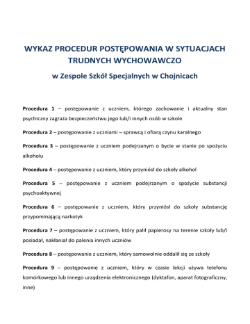 WYKAZ PROCEDUR POSTĘPOWANIA W SYTUACJACH TRUDNYCH WYCHOWAWCZO w Zespole Szkół Specjalnych w Chojnicach Procedura 1 – postępowanie z uczniem, którego zachowanie i aktualny stan psychiczny zagraża bezpieczeostwu jego lub/i innych osób w szkole Procedura 2 – postępowanie z uczniami – sprawcą i ofiarą czynu karalnego Procedura 3 – postępowanie z uczniem podejrzanym o bycie w stanie po spożyciu alkoholu Procedura 4 – postępowanie z uczniem, który przyniósł do szkoły alkohol Procedura 5 – postępowanie z uczniem podejrzanym o spożycie substancji psychoaktywnej Procedura 6 – postępowanie z uczniem, który przyniósł do szkoły substancję przypominającą narkotyk Procedura 7 – postępowanie z uczniem, który palił papierosy na terenie szkoły lub/i posiadał, nakłaniał do palenia innych uczniów Procedura 8 – postępowanie z uczniem, który samowolnie oddalił się ze szkoły Procedura 9 – postępowanie z uczniem, który w czasie lekcji używa telefonu komórkowego lub innego urządzenia elektronicznego (dyktafon, aparat fotograficzny, inne)
