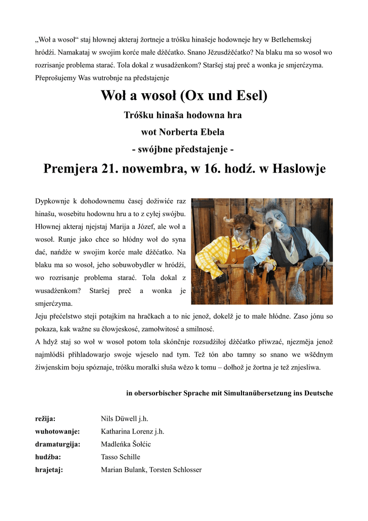 „Woł a wosoł“ staj hłownej akteraj žortneje a tróšku hinašeje hodowneje hry w Betlehemskej hródźi. Namakataj w swojim korće małe dźěćatko. Snano Jězusdźěćatko? Na blaku ma so wosoł wo rozrisanje problema starać. Tola dokal z wusadźenkom? Staršej staj preč a wonka je smjerćzyma. Přeprošujemy Was wutrobnje na předstajenje Woł a wosoł (Ox und Esel) Tróšku hinaša hodowna hra wot Norberta Ebela - swójbne předstajenje - Premjera 21. nowembra, w 16. hodź. w Haslowje Dypkownje k dohodownemu časej dožiwiće raz hinašu, wosebitu hodownu hru a to z cyłej swójbu. Hłownej akteraj njejstaj Marija a Józef, ale woł a wosoł. Runje jako chce so hłódny woł do syna dać, nańdźe w swojim korće małe dźěćatko. Na blaku ma so wosoł, jeho sobuwobydler w hródźi, wo rozrisanje problema starać. Tola dokal z wusadźenkom? Staršej preč a wonka je smjerćzyma. Jeju přećelstwo steji potajkim na hračkach a to nic jenož, dokelž je to małe hłódne. Zaso jónu so pokaza, kak wažne su čłowjeskosć, zamołwitosć a smilnosć. A hdyž staj so woł w wosoł potom tola skónčnje rozsudźiłoj dźěćatko přiwzać, njezměja jenož najmłódši přihladowarjo swoje wjeselo nad tym. Tež tón abo tamny so snano we wšědnym žiwjenskim boju spóznaje, tróšku moralki słuša wězo k tomu – dołhož je žortna je tež znjesliwa. in obersorbischer Sprache mit Simultanübersetzung ins Deutsche režija: Nils Düwell j.h. wuhotowanje: Katharina Lorenz j.h. dramaturgija: Madleńka Šołćic hudźba: Tasso Schille hrajetaj: Marian Bulank, Torsten Schlosser