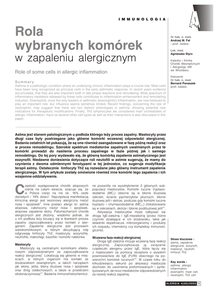 I M M U N O L O G I A Rola wybranych komórek w zapaleniu alergicznym Role of some cells in allergic inflammation Summary Asthma is a pathologic condition where an underlying chronic inflammation plays a crucial role. Mast cells have been long recognized as principal cells in the early asthmatic response. In recent years evidence accumulates, that they are also important both in late phase reactions and remodeling. Wide spectrum of inflammatory mediators released by these cells contributes to inflammation enhancement and remodeling induction. Eosinophils, once the only leaders in asthmatic (eosinophilic) inflammation, are now believed to play an important role, but influence seems somehow limited. Recent findings, concerning the role of neutrophils, may suggest that there are two distinct phenotypes in asthma, showing potential new indications for therapeutic modifications. Finally, Th2 lymphocytes are considered main orchestrates of allergic inflammation. Input os several other cell types as well as their interactions is also discussed in this paper. Dr hab. n. med. Andrzej M. Fal - prof. nadzw. Lek. med. Agnieszka Styrc Katedra i Klinika Chorób Wewnêtrznych i Alergologii AM we Wroc³awiu Kierownik: Dr hab. n. med. Bernard Panaszekprof. nadzw. ............................................... Astma jest stanem patologicznym u pod³o¿a którego le¿y proces zapalny. Mastocyty przez d³ugi czas by³y postrzegane jako g³ówne komórki wczesnej odpowiedzi alergicznej. Badania ostatnich lat pokazuj¹, ¿e s¹ one równie¿ zaanga¿owane w fazê póŸn¹ reakcji oraz w proces remodelingu. Szerokie spektrum mediatorów zapalnych uwalnianych przez te komórki prowadzi do nasilenia procesu zapalnego w fazie póŸnej jak i samego remodelingu. Do tej pory wydawa³o siê, ¿e g³ówn¹ komórk¹ zapalenia astmatycznego jest eozynofil. Niedawne doniesienia dotycz¹ce roli neutofili w astmie sugeruj¹, ¿e mamy do czynienia z dwoma odmiennymi fenotypami w tej jednostce, co sugeruje modyfikacje terapii astmy. Ostatecznie limfocyty Th2 s¹ rozwa¿ane jako g³ówny instrument zapalenia alergicznego. W tym artykule zosta³y omówione równie¿ inne komórki tego zapalenia i ich wzajemne oddzia³ywanie. C zêstoœæ wystêpowania chorób atopowych roœnie na ca³ym œwiecie, szacuje siê, ¿e w Polsce cierpi na nie ok. 16% osób doros³ych i 19% dzieci1. Najczêstsz¹ manifestacj¹ kliniczn¹ alergii jest sezonowy alergiczny nie¿yt nosa i spojówek2. Inne postaci alergii to: astma atopowa, ca³oroczny nie¿yt nosa i spojówek, atopowe zapalenie skóry. Patomechanizm chorób alergicznych jest z³o¿ony, wiadomo jednak, ¿e u ich pod³o¿a le¿y tocz¹cy siê w tkankach proces zapalny zapocz¹tkowany przez kontakt z alergenem. Zapalenie alergiczne jest procesem wielokomórkowym, w którym decyduj¹c¹ rolê odgrywaj¹ limfocyty Th2, mastocyty, eozynofile, neutrofile, makrofagi, bazofile i komórki nab³onka. Mastocyty Mastocyty s¹ centralnymi komórkami efektorowymi odpowiedzialnymi za zapocz¹tkowanie reakcji alergicznej3. Lokalizuj¹ siê g³ównie w miejscach, w których organizm ma kontakt ze œrodowiskiem zewnêtrznym, w takich narz¹dach jak skóra, jelita, b³ony œluzowe nosa i spojówek oraz dróg oddechowych, a tak¿e w przestrzeni oko³onaczyniowej3,4. Badania immunohistochemicz- ne pozwoli³y na wyodrêbnienie 2 g³ównych subpopulacji mastocytów. Komórki tuczne tryptazododatnie (MCT) obecne s¹ w b³onie œluzowej oskrzeli, œcianie pêcherzyków p³ucnych, b³onie œluzowej jelit i skórze, podczas gdy komórki tuczne tryptazo- i chymazododatnie (MCTC) zlokalizowane s¹ w oskrzelach, skórze i b³onie podœluzowej jelit4,5. Aktywacja mastocytów mo¿e odbywaæ siê drog¹ IgE-zale¿n¹ i IgE-niezale¿n¹ (przez ró¿ne czynniki dzia³aj¹ce w ich œrodowisku, takie jak sk³adniki dope³niacza, mikroorganizmy i produkty ich rozpadu, chemokiny czy kompleksy immunologiczne). Wczesna faza reakcji alergicznej Droga IgE-zale¿na inicjuje wczesn¹ fazê reakcji alergicznej. Zapocz¹tkowuje j¹ zwi¹zanie cz¹steczki alergenu przez IgE, która ³¹czy siê z mastocytem za pomoc¹ receptora o wysokim powinowactwie do IgE (FcRI) obecnego na powierzchni komórek tucznych4,6. W czasie kilku do kilkudziesiêciu sekund po aktywacji mastocyta dochodzi do uwolnienia preformowanych i syntetyzowanych de novo mediatorów odpowiedzialnych za rozwój reakcji zapalnej. S³owa kluczowe : astma, zapalenie alergiczne, eozynofil, mastocyt, neutrofil, limfocyt Th2 Key words : asthma, allergic inflammation, eosinophil, mast cell, neutrophil, Th2 cell A L E R G I A 4 ( 2 6 ) / 2 0 0 5 11 I M M U N O L O G I A S¹ to magazynowane w ziarnistoœciach mastocytarnych aminy biogenne (histamina), glikozaminoglikany (GAG), proteazy (tryptaza, chymaza, karboksypeptydaza), peroksydaza, czynnik aktywuj¹cy p³ytki (PAF), dysmutaza ponadtlenkowa (SOD) oraz syntetyzowane de novo metabolity kwasu arachidonowego (prostaglandyny, leukotrieny) i szereg prozapalnych cytokin, immunomoduluj¹cych przebieg odpowiedzi alergicznej (TNF , IL-3,-4,-5,-6,-8,-10,-13, CSF, GM-CSF)7,8. Efektem ich dzia³ania jest miêdzy innymi rozszerzenie naczyñ krwionoœnych i zwiêkszenie ich przepuszczalnoœci oraz skurcz miêœni g³adkichreakcje odpowiedzialne za objawy obrzêku naczynioruchowego, pokrzywki, napadu astmy, alergii pokarmowych czy alergicznego nie¿ytu nosa i spojówek. Rola mastocyta w natychmiastowych reakcjach nadwra¿liwoœci jest niekwestionowana. PóŸna faza reakcji alergicznej Przez wiele lat kontrowersje budzi³a natomiast rola tych komórek w procesach póŸnej fazy reakcji alergicznej. Dziœ wiadomo ju¿, ¿e funkcja mastocyta nie ogranicza siê tylko do ostrej reakcji alergicznej. Wydzielane przez mastocyty mediatory pe³ni¹ równie¿ kluczow¹ rolê w zapocz¹tkowaniu przewlek³ego procesu zapalnego, decyduj¹c o sk³adzie nacieku zapalnego oraz nap³ywie innych komórek do miejsca zapalenia10. • Tryptaza np. wykazuje w³a
