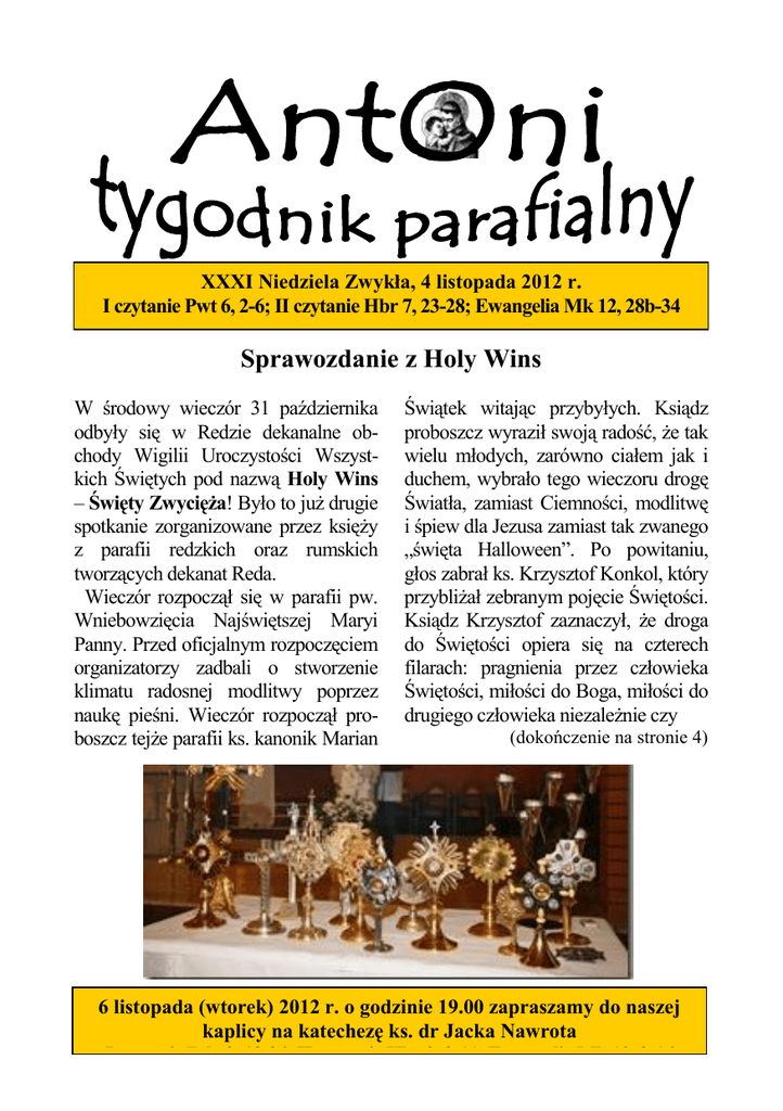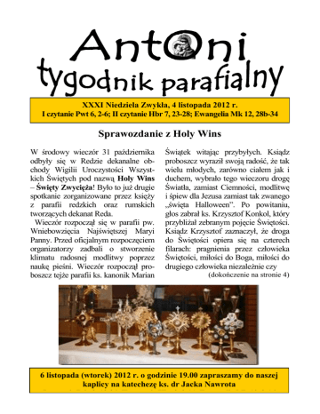 AntOni XXXI Niedziela Zwykła, 4 listopada 2012 r. I czytanie Pwt 6, 2-6; II czytanie Hbr 7, 23-28; Ewangelia Mk 12, 28b-34 Sprawozdanie z Holy Wins W środowy wieczór 31 października odbyły się w Redzie dekanalne obchody Wigilii Uroczystości Wszystkich Świętych pod nazwą Holy Wins – Święty Zwycięża! Było to już drugie spotkanie zorganizowane przez księży z parafii redzkich oraz rumskich tworzących dekanat Reda. Wieczór rozpoczął się w parafii pw. Wniebowzięcia Najświętszej Maryi Panny. Przed oficjalnym rozpoczęciem organizatorzy zadbali o stworzenie klimatu radosnej modlitwy poprzez naukę pieśni. Wieczór rozpoczął proboszcz tejże parafii ks. kanonik Marian Świątek witając przybyłych. Ksiądz proboszcz wyraził swoją radość, że tak wielu młodych, zarówno ciałem jak i duchem, wybrało tego wieczoru drogę Światła, zamiast Ciemności, modlitwę i śpiew dla Jezusa zamiast tak zwanego „święta Halloween”. Po powitaniu, głos zabrał ks. Krzysztof Konkol, który przybliżał zebranym pojęcie Świętości. Ksiądz Krzysztof zaznaczył, że droga do Świętości opiera się na czterech filarach: pragnienia przez człowieka Świętości, miłości do Boga, miłości do drugiego człowieka niezależnie czy (dokończenie na stronie 4) 6 listopada (wtorek) 2012 r. o godzinie 19.00 zapraszamy do naszej kaplicy na katechezę ks. dr Jacka Nawrota I czytanie Rdz 2, 18-24; II czytanie Hbr 2, 9-11; Ewangelia Mk 10, 2-16 Kobiety w Biblii (1) Kobieta jest po to, by uosabiać mądrość i miłość, bowiem jest zdolna do takiego wymiaru rozumienia, który zbyt łatwo umyka maszynie logicznej, jaką jest czynny umysł mężczyzny.[T. Merton, 7 esejów o Albercie Camus]. Tym cytatem otwieram cykl artykułów na najbliższy rok, który poświęcony będzie obrazom kobiet w Biblii. Postaram się nakreślić ich zadanie, cechy jakimi dysponują i odkryć, jak to odnosi się do naszego życia. W czym możemy być do nich podobne, a czego raczej unikać. Spróbujemy odczytać kim jest kobieta w oczach Pana Boga. Zaczniemy oczywiście od samego początku. Pierwszą kobietą, która pojawia się w Piśmie Świętym jest Ewa. W drugim opisie stworzenia czytamy: Z żebra, które Pan Bóg wyjął z mężczyzny, utworzył kobietę i przyprowadził ją do niego.[Rdz 2,22]. Pierwsza kobieta bierze swój początek z mężczyzny, jest ciałem z jego ciała. To oznacza, że razem się dopełniają. Tworzą naturalną jedność. Mężczyzna był sam, co czyniło go nie do końca szczęśliwym. Prawdziwej radości doznał dopiero wtedy, gdy Pan Bóg przyprowadził do niego kobietę. Bóg nie chciał, żeby mężczyzna był sam. Kobieta miała stać się jego towarzyszką, pomocą, miała obdarzać go troską i miłością. Razem mieli żyć w miłości Boga. Co więcej, dopiero w dopełnieniu się tych dwojga widać pełnię obrazu Pana Boga. W tradycji zwykło się przedstawiać Ewę, jako „tę złą”, która nie dosyć, że dała się skusić wężowi, to jeszcze zmusiła do grzechu swojego męża. Czy takie myślenie jest słuszne? Broniąc Ewy, trzeba powiedzieć, że owszem dała się podejść wężowi, ale nie możemy obarczać jej całą winą. Adam bowiem, to ten, który stał obok i nie zrobił nic, aby odwieść ją od decyzji, którą podjęła. Oboje dokonują świadomego i dobrowolnego wyboru, którego skutkiem jest wygnanie z Raju. Od tej pory kobieta będzie zaznawać dominacji tego, który miał obdarzać ją miłością, przez co jej pragnienia nie zostaną w pełni zaspokojone. Wtedy też kobieta otrzymała imię Ewa, co można tłumaczyć jako matka żyjących. Kobieta od tej pory ma przekazywać życie. Bóg obdarza kobietę cechami, które mówią wiele o nim samym, o Jego czułości, radości, a przede wszystkim miłości. Ewa pokazuje jednak, że mimo iż człowiek został stworzony na podobieństwo Boga, istnieje w nim skłonność do grzechu. Kasia Kowalczyk Wiara szuka zrozumienia Na jakiej podstawie Kościół włącza się w życie polityczne? Złośliwi odpowiedzą na to pytanie, że na tej samej podstawie na której politycy występują w roli lekarzy, albo nawet Pana Boga, decydując o prawie do życia i śmierci. Nie będąc jednak złośliwym Kościół pozytywnie wnosi swój wkład w życie polityczne, jako że dotyczy ono obywateli państw, którzy są jednocześnie wiernymi Kościoła. Patrząc szerzej na to zagadnienie Kościół postrzega polecenie „czynienie sobie ziemi poddaną” (por. Rdz 1,28) jako mądre zarządzanie własnością Boga (por. Mt 25,14). Częściej słyszy się o sprzeciwie Kościoła wobec różnych nieetycznych zabiegów organów stanowiących prawa. Jest jednak wiele dokumentów Kościoła, które nie mają charakteru walecznej obrony, lecz zwykłe podawanie propozycji rozwiązań pewnych spraw lub zwracanie uwagi na konsekwencje działań, wyborów i ustaleń prawnych. Tam jednak, gdzie trzeba powiedzieć prawdę, często niewygodną i wymagającą więcej nakładów siły i środków na rzecz dobra wspólnego, tam Kościół nie cofa się przed stanowczym i pełnym miłości głoszeniem Ewangelii. Zbiór wypowiedzi Kościoła na tematy społeczne nazywa się Katolicką Nauką Społeczną. Choć istniała od zawsze, to za jej początek w wymiarze nowożytnym uznaje się opublikowanie encykliki Leona XIII z 1891 roku pt. „Rerum novarum” (łac. „O rzeczach nowych”). Ostatnią z encyklik społecznych wydał w 2009 roku papież Benedykt XVI: „Caritas in veritate” (łac. Miłość w prawdzie). Wszystkie encykliki społeczne powstawały w konkretnym momencie dziejów i odnosiły się do wydarzeń bieżących, albo do ich skutków w przyszłości. Różne gałęzie urzędów Kościoła działają na różnych szczeblach międzynarodowych. W Watykanie działa powołana przez Pawła VI Papieska Rada „Iustitia et pax” (łac. Sprawiedliwość i pokój), która koordynuje nauczaniem społecznym Kościo