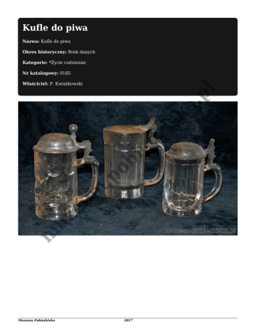 Kufle do piwa Nazwa: Kufle do piwa Okres historyczny: Brak danych Kategorie: *Życie codzienne Nr katalogowy: 0185 m uz eu m .p ob ie dz i sk a .p l Właściciel: P. Kwiatkowski Muzeum Pobiedziska 2017