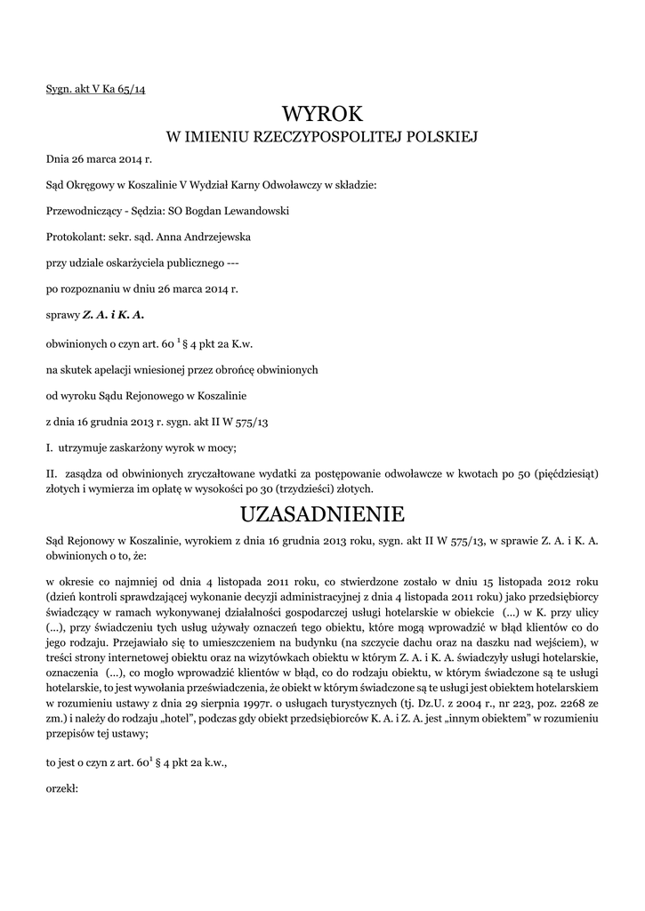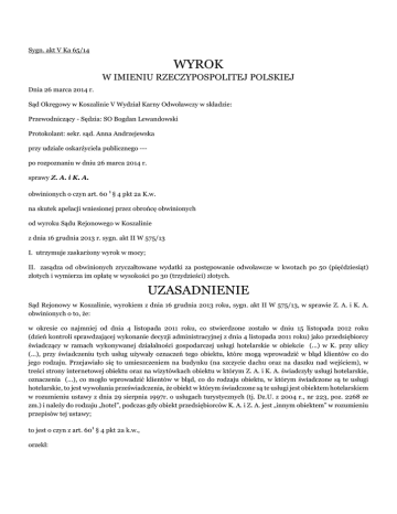 Sygn. akt V Ka 65/14 WYROK W IMIENIU RZECZYPOSPOLITEJ POLSKIEJ Dnia 26 marca 2014 r. Sąd Okręgowy w Koszalinie V Wydział Karny Odwoławczy w składzie: Przewodniczący - Sędzia: SO Bogdan Lewandowski Protokolant: sekr. sąd. Anna Andrzejewska przy udziale oskarżyciela publicznego --po rozpoznaniu w dniu 26 marca 2014 r. sprawy Z. A. i K. A. obwinionych o czyn art. 60 1 § 4 pkt 2a K.w. na skutek apelacji wniesionej przez obrońcę obwinionych od wyroku Sądu Rejonowego w Koszalinie z dnia 16 grudnia 2013 r. sygn. akt II W 575/13 I. utrzymuje zaskarżony wyrok w mocy; II. zasądza od obwinionych zryczałtowane wydatki za postępowanie odwoławcze w kwotach po 50 (pięćdziesiąt) złotych i wymierza im opłatę w wysokości po 30 (trzydzieści) złotych. UZASADNIENIE Sąd Rejonowy w Koszalinie, wyrokiem z dnia 16 grudnia 2013 roku, sygn. akt II W 575/13, w sprawie Z. A. i K. A. obwinionych o to, że: w okresie co najmniej od dnia 4 listopada 2011 roku, co stwierdzone zostało w dniu 15 listopada 2012 roku (dzień kontroli sprawdzającej wykonanie decyzji administracyjnej z dnia 4 listopada 2011 roku) jako przedsiębiorcy świadczący w ramach wykonywanej działalności gospodarczej usługi hotelarskie w obiekcie (...) w K. przy ulicy (...), przy świadczeniu tych usług używały oznaczeń tego obiektu, które mogą wprowadzić w błąd klientów co do jego rodzaju. Przejawiało się to umieszczeniem na budynku (na szczycie dachu oraz na daszku nad wejściem), w treści strony internetowej obiektu oraz na wizytówkach obiektu w którym Z. A. i K. A. świadczyły usługi hotelarskie, oznaczenia (...), co mogło wprowadzić klientów w błąd, co do rodzaju obiektu, w którym świadczone są te usługi hotelarskie, to jest wywołania przeświadczenia, że obiekt w którym świadczone są te usługi jest obiektem hotelarskiem w rozumieniu ustawy z dnia 29 sierpnia 1997r. o usługach turystycznych (tj. Dz.U. z 2004 r., nr 223, poz. 2268 ze zm.) i należy do rodzaju „hotel”, podczas gdy obiekt przedsiębiorców K. A. i Z. A. jest „innym obiektem” w rozumieniu przepisów tej ustawy; to jest o czyn z art. 601 § 4 pkt 2a k.w., orzekł: I. uznał obwinioną Z. A. za winną popełnienia zarzucanego jej wykroczenia z art. 601 § 4 pkt 2a k.w. i na podstawie art. 39§1 k.w. odstąpił od wymierzenia jej kary; II. uznał obwinioną K. A. za winną popełnienia zarzucanego jej wykroczenia z art. 601 § 4 pkt 2a k.w. i na podstawie art. 39§1 k.w. odstąpił od wymierzenia jej kary; III. zwolnił obwinione od obowiązku uiszczenia kosztów postępowania i nie wymierzył im opłaty. Od powyższego wyroku apelację wywiódł obrońca obwinionych, zarzucając zaskarżonemu orzeczeniu naruszenie art. 601§4 pkt 2a k.w. poprzez jego błędną wykładnię, a w konsekwencji niezasadne przyjęcie, że obwinione swoim zachowaniem wyczerpały znamiona czynu z art. 601§4 pkt 2a k.w., to jest, że używanie przez obwinione w ramach wykonywanej działalności gospodarczej oznaczenia (...) w obiekcie (...) mogło wprowadzić klientów w błąd co do rodzaju obiektu, w którym świadczone są usługi hotelarskie. Podnosząc powyższy zarzut obrońca obwinionych wniósł o zmianę zaskarżonego wyroku poprzez uniewinnienie obwinionych od zarzucanego im czynu, ewentualnie uchylenie zaskarżonego wyroku i przekazanie sprawy Sądowi I instancji do ponownego rozpoznania. Sąd Okręgowy zważył co następuje: Apelacja nie zasługiwała na uwzględnienie. Dokonana przez Sąd Rejonowy w Koszalinie analiza materiału dowodowego jest prawidłowa i w pełni odpowiada dyrektywom określonym w art.4 k.p.k. w zw. z art.8 k.p.s.w. Za takie też należy uznać wyprowadzone z niej wnioski, w tym ustalenia odnośnie stanu faktycznego sprawy, a także dokonaną ocenę prawną. Sąd w sposób logiczny uzasadnił, dlaczego uwzględnił jedne dowody, a innym zaś nie dał wiary i na których oparł się dokonując w sprawie ustaleń. Przeprowadzone w oparciu o tę analizę wnioskowanie jest logiczne, zgodne z przesłankami wynikającymi z art. 7 k.p.k. w zw. z art. 8 k.p.s.w. i przekonująco uzasadnione. Poza sferą rozważań Sądu Rejonowego nie pozostały jednocześnie żadne dowody ani też okoliczności istotne z punktu widzenia ostatecznego rozstrzygnięcia (art. 34 k.p.s.w.). Wypływającym z powyższego, zaprezentowanym przez Sąd I instancji ocenom i poglądom, obrońca obwinionych przeciwstawia w apelacji własne opinie, przy czym wywody te stanowią przyjętą przez obwinione w sprawie linię obrony i nie zasługują na uwzględnienie. Ustalając stan faktyczny Sąd I instancji prawidłowo oparł się na zgromadzonych w sprawie dowodach z dokumentów, zeznań świadka D. M. i wyjaśnień obwinionych. Dokonana przez Sąd Rejonowy ocena zebranych dowodów nie budzi w ocenie Sądu Odwoławczego zastrzeżeń. Apelujący zarzucił zaskarżonemu orzeczeniu naruszenie przepisów prawa materialnego tj. art. 601§4 pkt 2a k.w. poprzez jego błędną wykładnię i przyjęcie, że zachowanie obwinionych wyczerpało znamiona czynu stypizowanego w tymże przepisie. Przede wszystkim wskazać należy, co rozumie się przez pojęcia hotel i usługi hotelarskie. Pierwsze z tychże pojęć stanowi obiekt posiadający co najmniej 10 pokoi, w tym większość miejsc w pokojach jedno i dwuosobowych, świadczące szeroki zakres usług związanych z pobytem klientów. Z kolei, usługi hotelarskie stanowią krótkotrwałe, ogólnie dostępnie wynajmowanie domów, mieszkań, pokoi, miejsc noclegowych, a także miejsc na ustawienie namiotów lub przyczep samochodowych oraz świadczenie, w obrębie obiektu, usług z tym związanych (art. 3 u.u.t.). Usługi te mogą być świadczone również w innych obiektach hotelarskich, jeżeli spełniają minimalne wymagania co do wyposażenia, wymagania sanitarne, przeciwpożarowe i inne określone odrębnymi przepisami. Przy świadczeniu usług hotelarskich zabronione jest jednak używanie oznaczeń