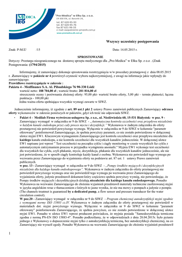 Wszyscy uczestnicy postępowania Znak: P-M/Z/ /15 Data: 14.05.2015 r. SPROSTOWANIE Dotyczy: Przetargu nieograniczonego na dostawę sprzętu medycznego dla „Pro-Medica” w Ełku Sp. z o.o . (Znak Postępowania: (1794/2015) Informujemy, iż zamawiający dokonuje sprostowania rozstrzygnięcia w/w procedury przetargowej z dnia 08.05.2015 r. .Zamawiający w pakiecie nr 4 powtórzył czynność wyboru najkorzystniejszej, z uwagi na informacje jakie wpłynęły do zamawiającego. Prawidłowe rozstrzygnięcie w zakresie : Pakietu 4 - Medfinance S.A. Al. Piłsudskiego 76 90-330 Łódź wartość netto: 188 704,00 zł ; wartość brutto: 201 816,00 zł streszczenie oceny i porównania złożonej oferty: 95,00 pkt- wartość brutto oferty, 5,00 pkt – termin płatności; łączna punktacja - 100,00 pkt Jedna ważna oferta spełniająca wszystkie wymogi zawarte w SIWZ. Jednocześnie informujemy, iż zgodnie z art. 89 ust.1 pkt 2 ustawy Prawo zamówień publicznych Zamawiający odrzuca oferty wykonawców w zakresie poniższych nr pakietów, gdyż ich treść nie odpowiada SIWZ. • Pakiet 4 - Medilab Firma wytwórczo-usługowa Sp. z o.o., ul. Niedźwiedzia 60, 15-531 Białystok- w poz. 9 Zamawiający wymagał w załączniku nr 9 do SIWZ - „Automatyczna kontrola szczelności oraz przepływu niezależnie w każdym kanale endoskopu przez cały proces mycia i dezynfekcji.” Wykonawca w żadnym załączniku do oferty przetargowej nie potwierdził powyższego wymogu. Wyłącznie w załączniku nr 9 do SIWZ w kolumnie "parametr oferowany" poinformował Zamawiającego, że spełnia powyższy parametr, co nie zostało potwierdzone w dołączonej ulotce myjni EW1. Kluczowym wymaganiem Zamawiającego jest kontrola szczelności oraz przepływu niezależnie dla każdego kanału endoskopu, a nie kontrola szczelności dla wszystkich kanałów jednocześnie. W dołączonej ulotce EW1 napisane jest wprost ” Test szczelności na początku cyklu i ciągły monitoring w czasie wszystkich faz cyklu z automatycznym zatrzymaniem procesu w przypadku wystąpienia anomalii." Myjnia EW1 wykonuje test szczelności dla wszystkich faz cyklu, czyli płukanie, mycie, dezynfekcja, płukanie dla wszystkich kanałów jednocześnie, ale nie jest potwierdzone, że w sposób ciągły kontroluje każdy kanał z osobna. Wykonawca nie potwierdził tego wymogu po wezwaniu przez Zamawiającego do wyjaśnienia oferty na podstawie art. 87 ust. 1 ustawy Prawo zamówień publicznych. w poz. 13 - Zamawiający wymagał w załączniku nr 9 do SIWZ - „Pompy środków myjących i dezynfekcyjnych niezależnie dla każdego kanału endoskopowego”. Wykonawca w żadnym załączniku do oferty przetargowej nie potwierdził powyższego wymogu oraz nie potwierdził tego wymogu po wezwaniu przez Zamawiającego do wyjaśnienia oferty, jedynie przedstawił dokument który częściowo spełnia powyższy wymóg, nie potwierdzając, że Pompy środków myjących i dezynfekcyjnych działają niezależnie dla każdego kanału endoskopowego. Ponadto Wykonawca na wezwanie Zamawiającego do złożenia wyjaśnień przedstawił materiały techniczne zaoferowanej myjni w języku angielskim wraz z tłumaczeniem z których to jasno wynika, że nie ma mowy o pompach a jedynie o pompie. (The channels treatmet is guaranteed by a dedicated pump, a flow sensor and pressure transducer for the water circulation control). W poz.20 - Zamawiający wymagał w załączniku nr 9 do SIWZ - Program chemicznej autodezynfekcji myjni zgodnie z wymogami normy ISO 15883 cz.IV. Wykonawca w żadnym załączniku do oferty przetargowej nie potwierdził w materiałach dot. myjni powyższego wymogu. Wyłącznie w załączniku nr 9 do SIWZ w kolumnie "parametr oferowany" poinformowała Zamawiającego, że spełnia powyższe, co nie zostało potwierdzone w dołączonej ulotce myjni EW1. Ponadto w ulotce EW1 wprost producent poświadcza, że myjnia posiada ”Samodezynfekcja termiczna zgodna z normą PN-EN ISO 15883-4". Ponadto podkreślamy, że w odpowiedziach z dnia 28.04.2015r. było pytanie jednego z Wykonawcy o dopuszczenie myjni tylko z autodezynfekcją termiczną, bez autodezyfekcji chemicznej, na co Zamawiający nie wyraził zgody. Ponadto Wykonawca na wezwanie Zamawiającego do złożenia wyjaśnień przedstawił 1 materiały techniczne oraz wyjaśnienia z których nie wynika, że zaoferowana myjnia posiada dostępny program dezynfekcji chemicznej. Wykonawca przedstawiając materiały firmowe powoływał się jedynie na dezynfekcję termiczną. W poz. 21 - Zamawiający wymagał w załączniku nr 9 do SIWZ - Wewnętrzny filtr bakterii 0,2 µm o polu powierzchni min. 2.300 cm2 Wykonawca proponuje zastosowanie dwóch filtrów HEPA H14 o polu powierzchni 1575 cm 2 każdy. Bezwzględnie Wykonawca nie spełnia wymagań Zamawiającego, proponując dwa filtry o mniejszej powierzchni. Naraża to Zamawiającego na większe koszty eksploatacji, ponieważ zmusi użytkownika do wymiany dwóch filtrów, a nie jednego. Wykonawca proponując swoje rozwiązanie w świetle ustawy zamówień publicznych powinna zapytać o dopuszczenie Zamawiającego, czego nie uczyniła. Umowa zostanie zawarta w 6-tym dniu od dnia przesłania zawiadomienia o wyborze najkorzystniejszej oferty zgodnie z art. 94 ustawy z dnia 29 stycznia 2004 r. Prawo zamówień publicznych (Dz. U. z 2013 r. poz. 907, 984 i 1047 oraz z 2014 r. poz. 423, 768, 811, 915, 1146 i 1232 oraz z 2015 r. poz. 349). Zabezpieczenie wykonania umowy 5% brutto powinno być wniesione przed podpisaniem umowy. Przepraszamy za zaistniałą pomyłkę. Z poważaniem 2