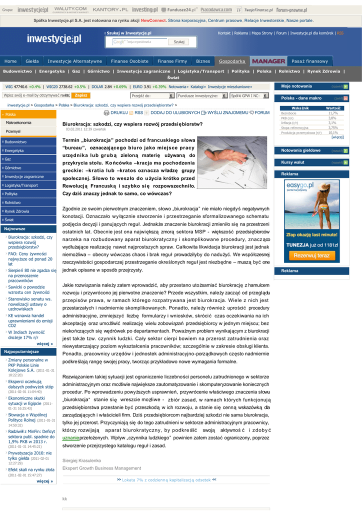 Grupa: Spółka Inwestycje.pl S.A. jest notowana na rynku akcji NewConnect. Strona korporacyjna, Centrum prasowe , Relacje Inwestorskie, Nasze portale. Szukaj w Inwestycje.pl Kontakt | Reklama | Mapa Strony | Forum | Inwestycje.pl dla komórek | RSS Szukaj Home Giełda Inwestycje Alternatywne Finanse Osobiste Finanse Firmy Biznes Gospodarka Pasa ż finansowy Budownictwo | Energetyka | Gaz | Górnictwo | Inwestycje zagraniczne | Logistyka/Transport | Polityka | Polska | Rolnictwo | Rynek Zdrowia | Świat Moje notowania WIG 47740.6 +0.4% | WIG20 2738.62 +0.5% | DOLAR 2.84 +0.69% | EURO 3.91 +0.39% Notowania» Katalogi» Inwestycje mieszkaniowe» l ter.. Wpisz swój e-mail by otrzymywać newse Zapisz 6 Przejdź do: Fundusze inwestycyjne: 6 Spółki GPW I NC: 6 inwestycje.pl > Gospodarka > Polska > Biurokracja: szkodzi, czy wspiera rozwój przedsi ębiorstw? > DRUKUJ Polska RSS DODAJ DO ULUBIONYCH Polska - dane makro Wska źnik WYŚLIJ ZNAJOMEMU FORUM Bezrobocie PKB (r/r) Makroekonomia Biurokracja: szkodzi, czy wspiera rozwój przedsiębiorstw? 03.02.2011 12:39 czwartek Przemysł Inflacja (r/r) Stopa referencyjna Produkcja przemysłowa (r/r) Termin „biurokracja” pochodzi od francuskiego s łowa Budownictwo “bureau”, oznaczającego biuro jako miejsce pracy Energetyka (rozwi ń) (zwi ń) Warto ść 11,7% 3,8% 3,1% 3,75% 10,1% [więcej] Notowania giełdowe (rozwi ń) Kursy walut (rozwi ń) urzęd nik a lub grub ą zieloną materię używaną do Gaz przykrycia stołu. Ko ńcówka –kracja ma pochodzenia Górnictwo greckie: –kratia lub –kratos oznacza w ładzę grupy Inwestycje zagraniczne społecznej. S łowo to wesz ło do u życia krótko przed Logistyka/Transport Rewolucją Francuską i szybko si ę rozpowszechniło. Polityka Czy dziś znaczy jednak to samo, co wówczas? Reklama Rolnictwo Zgodnie ze swoim pierwotnym znaczeniem, słowo „biurokracja” nie miało niegdyś negatywnych Rynek Zdrowia konotacji. Oznacza ło wy łącznie stworzenie i przestrzeganie sformalizowanego schematu Świat podjęcia decyzji i panujących reguł. Jednakże znaczenie biurokracji zmieniło się na przestrzeni Najnowsze ostatnich lat. Obecnie jest ona najwi ększą zmorą sektora MSP - większość przedsiębiorców Biurokracja: szkodzi, czy wspiera rozwój przedsiębiorstw? narzeka na rozbudowany aparat biurokratyczny i skomplikowane procedury, znacz ąco FAO: Ceny żywno ści najwyższe od ponad 20 lat niemożliwa – obecny wówczas chaos i brak reguł prowadziłyby do nadu żyć. We współczesnej Sierpień 80 nie zgadza się na przenoszenie pracowników jednak opisane w sposób przejrzysty. Sawicki o powodzie wzrostu cen żywno ści wydłużające realizację nawet najprostszych spraw. Całkowita likwidacja biurokracji jest jednak rzeczywistości gospodarczej przestrzeganie określonych reguł jest niezbędne – muszą być one Jakie rozwiązania należy zatem wprowadzić, aby przestano utożsamiać biurokrację z hamulcem rozwoju i przywrócono jej pierwotne znaczenie? Przede wszystkim, należy zacząć od przeglądu Stanowisko senatu ws. nowelizacji ustawy o uzdrowiskach przepisów prawa, w ramach którego rozpatrywana jest biurokracja. Wiele z nich jest KE wznawia handel uprawnieniami do emisji CO2 administracyjne, zmniejszyć liczbę formularzy i wniosków, skróci ć czas oczekiwania na ich W Indiach żywno ść drożeje 17% r/r więcej » niekończących się wędrówek po departamentach. Poważnym problem wynikającym z biurokracji Najpopularniejsze przestarzałych i nadmiernie skomplikowanych. Ponadto, nale ży również uprościć procedury akceptację oraz umożliwić realizację wielu zobowiązań przedsiębiorcy w jednym miejscu; bez jest tak że tzw. czynnik ludzki. Ca ły sektor cierpi bowiem na przerost zatrudnienia oraz niewystarczający poziom wykształcenia pracowników; szczególnie w zakresie obsługi klienta. Ponadto, pracownicy urzędów i jednostek administracyjno-porządkowych często nadmiernie Zmiany personalne w PKP Polskie Linie Kolejowe S.A. (2011-01-31 podkreślają rangę swojej pracy, tworząc przykładowo nowe wymagania formalne. 18:22:20) Rozwiązaniem takiej sytuacji jest ograniczenie liczebności personelu zatrudnionego w sektorze Eksperci oczekują dalszych podwyżek stóp administracyjnym oraz możliwie największe zautomatyzowanie i skomputeryzowanie koniecznych (2011-02-01 11:04:40) procedur. Po wprowadzeniu powyższych usprawnień, przywrócenie właściwego znaczenia słowu Ekonomiczne skutki sytuacji w Egipcie (2011- „biurokracja” stanie si ę wreszcie możliwe - zbiór zasad, w ramach których funkcjonuj ą 01-31 16:25:43) przedsiębiorstwa przestanie być przeszkodą w ich rozwoju, a stanie się cenną wskazówką dla Słowacja o Wspólnej Polityce Rolnej (2011-01-31 zarządzających i właścicieli firm. Dziś przedsiębiorcom najbardziej szkodzi nie sama biurokracja, 14:50:32) Radziwiłł z MinFin: Deficyt sektora publ. spadnie do 1,9% PKB w 2013 r. (2011-01-31 14:45:21) Prywatyzacja 2010: nie tylko giełda (2011-02-01 12:27:29) Efekt skali na rynku złota tylko jej przerost. Przyczyniają się do tego zatrudnieni w sektorze administracyjnym pracownicy, którzy rozwijaj ą aparat biurokratyczny, by podkre ślić swoją aktywnoś ć i z d o b y ć uznanie przełożonych. Wpływ „czynnika ludzkiego” powinien zatem zostać ograniczony, poprzez stworzenie przejrzystego katalogu reguł i zasad. Siergiej Krasulenko Ekspert Growth Business Management (2011-02-01 15:47:27) >> Lokata 7% z codzienną kapitalizacj ą odsetek << więcej » kk Reklama Dodaj artykuł do: Wróć do działu: Polska » Komentarze (0) [+] Skomentuj ten artykuł [»] Przejdź do Forum Czytaj także: Przełamany monopol [2011 -02 -03 11:49:45] FAO: Ceny żywności najwyższe od ponad 20 lat [2011 -02 -03 11:39:12] Sierpień 80 nie zgadza się na przenoszenie pracowników [2011 -02 -03 11:15:36] Stanowisko senatu ws. nowelizacji ustawy o uzdrowiskach [2011 -02 -03 10:43:16] 