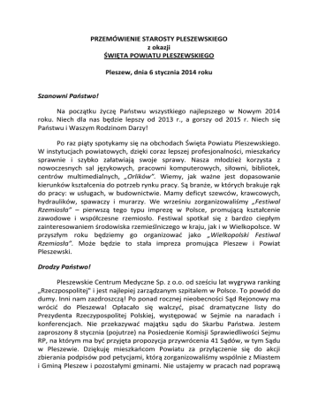 PRZEMÓWIENIE STAROSTY PLESZEWSKIEGO z okazji ŚWIĘTA POWIATU PLESZEWSKIEGO Pleszew, dnia 6 stycznia 2014 roku Szanowni Państwo! Na początku życzę Państwu wszystkiego najlepszego w Nowym 2014 roku. Niech dla nas będzie lepszy od 2013 r., a gorszy od 2015 r. Niech się Państwu i Waszym Rodzinom Darzy! Po raz piąty spotykamy się na obchodach Święta Powiatu Pleszewskiego. W instytucjach powiatowych, dzięki coraz lepszej profesjonalności, mieszkańcy sprawnie i szybko załatwiają swoje sprawy. Nasza młodzież korzysta z nowoczesnych sal językowych, pracowni komputerowych, siłowni, bibliotek, centrów multimedialnych, „Orlików”. Wiemy, jak ważne jest dopasowanie kierunków kształcenia do potrzeb rynku pracy. Są branże, w których brakuje rąk do pracy: w usługach, w budownictwie. Mamy deficyt szewców, krawcowych, hydraulików, spawaczy i murarzy. We wrześniu zorganizowaliśmy „Festiwal Rzemiosła” – pierwszą tego typu imprezę w Polsce, promującą kształcenie zawodowe i współczesne rzemiosło. Festiwal spotkał się z bardzo ciepłym zainteresowaniem środowiska rzemieślniczego w kraju, jak i w Wielkopolsce. W przyszłym roku będziemy go organizować jako „Wielkopolski Festiwal Rzemiosła”. Może będzie to stała impreza promująca Pleszew i Powiat Pleszewski. Drodzy Państwo! Pleszewskie Centrum Medyczne Sp. z o.o. od sześciu lat wygrywa ranking „Rzeczpospolitej" i jest najlepiej zarządzanym szpitalem w Polsce. To powód do dumy. Inni nam zazdroszczą! Po ponad rocznej nieobecności Sąd Rejonowy ma wrócić do Pleszewa! Opłacało się walczyć, pisać dramatyczne listy do Prezydenta Rzeczypospolitej Polskiej, występować w Sejmie na naradach i konferencjach. Nie przekazywać majątku sądu do Skarbu Państwa. Jestem zaproszony 8 stycznia (pojutrze) na Posiedzenie Komisji Sprawiedliwości Sejmu RP, na którym ma być przyjęta propozycja przywrócenia 41 Sądów, w tym Sądu w Pleszewie. Dziękuję mieszkańcom Powiatu za przyłączenie się do akcji zbierania podpisów pod petycjami, którą zorganizowaliśmy wspólnie z Miastem i Gminą Pleszew i pozostałymi gminami. Nie ustajemy w pracach nad poprawą dróg powiatowych. W 2013 roku przy wsparciu finansowym (30%) Gminy Gołuchów i Pleszew wykonaliśmy drogę Bielawy – Ludwina oraz ulice: Podgórną i Krzywoustego – jedne z najbardziej zdewastowanych ulic w Pleszewie. To Powiat Pleszewski był inwestorem. A przecież to tylko największe inwestycje! W tym roku: 2014 - zmodernizujemy m. in. drogę z Prokopowa do Domu Parafialnego, wraz z chodnikami. Będziemy pracować nad kolejnymi projektami. Dobrzyca z początkiem roku stała się drugim obok Pleszewa miastem. Gratulujemy i kibicujemy! Panie i Panowie! Zaproszeni goście! Piętnaście lat temu na mapie administracyjnej Polski zaistniał nie tylko kolejny szczebel samorządu terytorialnego. Powstała wspólnota powiatowa. Wspólnota mieszkańców Powiatu Pleszewskiego. Możemy mieć różne cele, różne priorytety, inne terminy realizacji wspólnych zadań. Ale najważniejsze jest właśnie to: budowanie wspólnoty Powiatu Pleszewskiego. Łączy nas nie tylko terytorium, które zamieszkujemy, wspólne wartości jakie wyznajemy, ale i duma z przynależności do Powiatu. Naszego Powiatu, który wspólną pracą potrafi wykorzystać swoją szansę na rozwój! Doceniając inicjatywę Chocza osobiście zaangażowałem się, by pozyskać pierwsze pieniądze na remont Kolegiaty w Choczu. Udało się. Będziemy działać razem nadal. Już w styczniu zaproponuję projekt pod nazwą "Karta Młodego Przedsiębiorcy". Ten projekt będzie szansą dla zaczynających swój biznes: sprawdzianem prawdomówności mówiących, że wspierają młody biznes, że są za przedsiębiorcami. Będziemy jednoczyć mieszkańców wokół idei umacniania Naszej Wspólnoty. Drodzy Państwo! „Talent jest jak kawałek szlachetnego, ale surowego metalu, dopiero pilna praca go obrobi i wartość mu wielką nadaje”. Te słowa Stanisława Staszica, patrona tej Szkoły, dopingowały nas w pracach nad projektem regulaminu przyznawania Stypendiów Starosty Pleszewskiego. Poprosiłem najpierw Zarząd, a potem Radę Powiatu, by przyjąć zasady przyznawania stypendiów. Dziękuję Radzie i Zarządowi za ich przyjęcie. Talent wcześnie wykryty, ma szansę na rozwój. W dalszej części naszej uroczystości chcemy dzisiaj wyróżnić i nagrodzić uczniów osiągających bardzo dobre wyniki w nauce. Docenić potencjał artystyczny, sportowy, cechujący młodych ludzi – mieszkańców Naszego Powiatu. Docenić także nauczycieli i rodziców, współtworzących ich sukcesy. Młodzi ludzie są naszą wielką radością i dumą. Chcemy ich wspierać w rozwoju ich pasji i marzeń. Drodzy Państwo! Zaprosiłem na nasze dzisiejsze spotkanie dr. Macieja Kowalczyka z Ostrowa Wielkopolskiego. Jest m.in. autorem książki „Geneza i pierwsze półwiecze powiatu ostrowskiego 1887-1939. Zarys dziejów ustrojowo-politycznych”. Za osiągnięcia na rzecz rozwoju i promocji kultury został nagrodzony w 2013 roku „Laurem Kultury” Starosty Ostrowskiego. Obecnie pracuje nad najnowszym wydaniem publikacji o historii Powiatu Pleszewskiego. Tego fragmentu naszej historii, o którym wiemy bardzo mało. Poprosiłem Pana Doktora o przedstawienie prezentacji pt. „Powiat Pleszewski w XIX wieku i I połowie XX stulecia". To będzie krótki zwiastun tego, co zawierać będzie ta potrzebna publikacja, którą okazywać będziemy Państwu za rok. Państwu dziękuję za uwagę. Michał Karalus Starosta Pleszewski