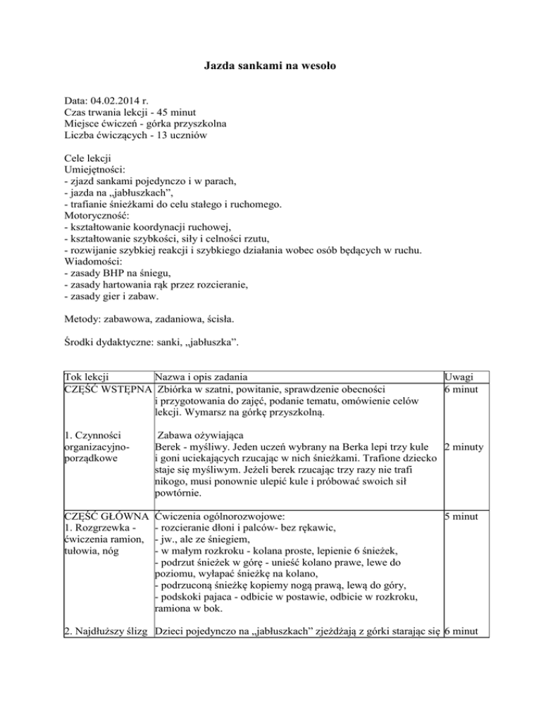 Jazda sankami na wesoło Data: 04.02.2014 r. Czas trwania lekcji - 45 minut Miejsce ćwiczeń - górka przyszkolna Liczba ćwiczących - 13 uczniów Cele lekcji Umiejętności: - zjazd sankami pojedynczo i w parach, - jazda na „jabłuszkach”, - trafianie śnieżkami do celu stałego i ruchomego. Motoryczność: - kształtowanie koordynacji ruchowej, - kształtowanie szybkości, siły i celności rzutu, - rozwijanie szybkiej reakcji i szybkiego działania wobec osób będących w ruchu. Wiadomości: - zasady BHP na śniegu, - zasady hartowania rąk przez rozcieranie, - zasady gier i zabaw. Metody: zabawowa, zadaniowa, ścisła. Środki dydaktyczne: sanki, „jabłuszka”. Tok lekcji Nazwa i opis zadania CZĘŚĆ WSTĘPNA Zbiórka w szatni, powitanie, sprawdzenie obecności i przygotowania do zajęć, podanie tematu, omówienie celów lekcji. Wymarsz na górkę przyszkolną. Uwagi 6 minut 1. Czynności organizacyjnoporządkowe Zabawa ożywiająca Berek - myśliwy. Jeden uczeń wybrany na Berka lepi trzy kule 2 minuty i goni uciekających rzucając w nich śnieżkami. Trafione dziecko staje się myśliwym. Jeżeli berek rzucając trzy razy nie trafi nikogo, musi ponownie ulepić kule i próbować swoich sił powtórnie. CZĘŚĆ GŁÓWNA 1. Rozgrzewka ćwiczenia ramion, tułowia, nóg Ćwiczenia ogólnorozwojowe: - rozcieranie dłoni i palców- bez rękawic, - jw., ale ze śniegiem, - w małym rozkroku - kolana proste, lepienie 6 śnieżek, - podrzut śnieżek w górę - unieść kolano prawe, lewe do poziomu, wyłapać śnieżkę na kolano, - podrzuconą śnieżkę kopiemy nogą prawą, lewą do góry, - podskoki pajaca - odbicie w postawie, odbicie w rozkroku, ramiona w bok. 5 minut 2. Najdłuższy ślizg Dzieci pojedynczo na „jabłuszkach” zjeżdżają z górki starając się 6 minut dojechać jak najdalej tylko siłą rozpędu. Wyznaczamy 3 najdłuższe ślizgi. 3. Zabawa zręcznościowa Dzieci pojedynczo zjeżdżają na sankach z górki starając się celować śnieżkami do celu wyznaczonego przez nauczyciela zdobywając punkt za każdy celny rzut. 6 minut 4. Zabawa rzutna "Polowanie" 4 minuty Uczniów dzielimy na trzy zespoły. Dwa zespoły ustawiają naprzeciw siebie, na liniach (odległość linii około 10m). Każdy uczeń lepi po trzy śnieżki. Trzeci zespół na sygnał przebiega korytarzem (między liniami) na drugą stronę. Dzieci z ulepionymi śnieżkami starają się upolować przebiegające dzieci. Liczymy trafienia (ujemne punkty) dla przebiegającego zespołu. Później następuje zmiana przebiegających. Wygrywa zespół, który ma mniej upolowanych dzieci. 5. Zabawa bieżna „Kto szybciej” 8 minut Uczniowie dobierają się w pary i ustawiają się przed górką. Na sygnał każda para startując oddzielnie stara się jak najszybciej wbiec z sankami na górkę, a następnie zjechać do mety w jak najkrótszym czasie. CZĘŚĆ KOŃCOWA 1. Zabawa uspokajająca "45 sekund" Dzieci zamykają oczy. Prowadzący daje znak, a dzieci po cichu odliczają czas upłynięcia 30 sekund i zgłaszają to przez podniesienie ręki. Zwycięzcą zostaje uczeń, który najdokładniej odmierzy czas. 2 minuty 2. Zakończenie lekcji Zebranie pomocy i przejście do szkoły. Oczyszczenie ubrania i obuwia. W szatni (korytarz) omówienie lekcji. 6 minut