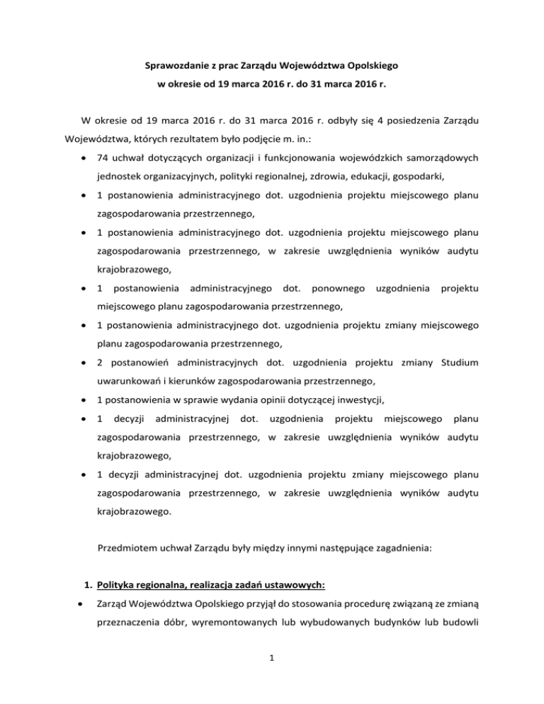 Sprawozdanie z prac Zarządu Województwa Opolskiego w okresie od 19 marca 2016 r. do 31 marca 2016 r. W okresie od 19 marca 2016 r. do 31 marca 2016 r. odbyły się 4 posiedzenia Zarządu Województwa, których rezultatem było podjęcie m. in.: 74 uchwał dotyczących organizacji i funkcjonowania wojewódzkich samorządowych jednostek organizacyjnych, polityki regionalnej, zdrowia, edukacji, gospodarki, 1 postanowienia administracyjnego dot. uzgodnienia projektu miejscowego planu zagospodarowania przestrzennego, 1 postanowienia administracyjnego dot. uzgodnienia projektu miejscowego planu zagospodarowania przestrzennego, w zakresie uwzględnienia wyników audytu krajobrazowego, 1 postanowienia administracyjnego dot. ponownego uzgodnienia projektu miejscowego planu zagospodarowania przestrzennego, 1 postanowienia administracyjnego dot. uzgodnienia projektu zmiany miejscowego planu zagospodarowania przestrzennego, 2 postanowień administracyjnych dot. uzgodnienia projektu zmiany Studium uwarunkowań i kierunków zagospodarowania przestrzennego, 1 postanowienia w sprawie wydania opinii dotyczącej inwestycji, 1 decyzji administracyjnej dot. uzgodnienia projektu miejscowego planu zagospodarowania przestrzennego, w zakresie uwzględnienia wyników audytu krajobrazowego, 1 decyzji administracyjnej dot. uzgodnienia projektu zmiany miejscowego planu zagospodarowania przestrzennego, w zakresie uwzględnienia wyników audytu krajobrazowego. Przedmiotem uchwał Zarządu były między innymi następujące zagadnienia: 1. Polityka regionalna, realizacja zadań ustawowych: Zarząd Województwa Opolskiego przyjął do stosowania procedurę związaną ze zmianą przeznaczenia dóbr, wyremontowanych lub wybudowanych budynków lub budowli 1 w całości lub w części/przeniesienie praw własności lub posiadania nabytych dóbr objętych operacją/zwolnienie ze zobowiązań w wyniku zaistnienia okoliczności o charakterze siły wyższej lub wyjątkowych okoliczności w ramach działań objętych PROW 2014-2020 wdrażanych przez podmioty zewnętrzne. (uchwała nr 1836/2016 z dnia 22 marca 2016 r.) Zarząd Województwa Opolskiego wyraził zgodę na udzielenie zamówienia publicznego: - na usługę druku polegającą na realizacji 5 zadań w ramach Planu operacyjnego KSOW 2014-2020 dla Województwa Opolskiego na lata 2016-2017 Zadanie 1: Wydanie Przewodnika po polu doświadczalnym, Zadanie 2: Wydanie Listy Odmian Zalecanych, Zadanie 3: Wykonanie plakatów na VII Festiwal Piosenki Turystycznej, Zadanie 4: Wykonanie dyplomów na VII Festiwal Piosenki Turystycznej, Zadanie 5: Wykonanie plakatów na operację Z babci szafy wyciągnięte – dawniej i dziś. (uchwała nr 1838/2016 z dnia 22 marca 2016 r.) - na usługę druku biuletynu pn. Wyniki Porejestrowe Doświadczalnictwa Odmianowego w Województwie Opolskim za lata 2013-2015. (uchwała nr 1839/2016 z dnia 22 marca 2016 r.) - na świadczenie usług cateringowych i dostarczanie posiłków na potrzeby spotkań o różnej randze organizowanych w ramach Planu operacyjnego KSOW 2014-2020 dla Województwa Opolskiego na lata 2016-2017 w ramach 3 zadań 1. Zlecenie usługi cateringowej na szkolenia, 2. Zlecenie usługi cateringowej na VII Festiwal Piosenki Turystycznej, 3. Zlecenie usługi cateringowej na spotkania informacyjno-konsultacyjne PROW 2014-2020 w 2016r. (uchwała nr 1840/2016 z dnia 22 marca 2016 r.) - na usługę cateringową w ramach operacji Innowacyjne rozwiązania w technologiach uprawy roślin rolniczych oraz nowości odmianowe na polu doświadczalnym Opolskiego Ośrodka Doradztwa Rolniczego w Łosiowie. (uchwała nr 1869/2016 z dnia 29 marca 2016 r.) - na dostawę materiałów promocyjnych polegającą na realizacji 2 zadań w ramach Planu operacyjnego KSOW 2014-2020 dla Województwa Opolskiego na lata 2016-2017 Zadanie 1:Dostawa materiałów promocyjnych 2 w ramach realizacji Planu komunikacyjnego. Zadanie 2: Dostawa materiałów promocyjnych w ramach realizacji operacji z partnerem KSOW (uchwała nr 1837/2016 z dnia 22 marca 2016 r.) - na usługi cateringowe na potrzeby szkoleń, spotkań i warsztatów organizowanych w ramach projektu pn. „Bioróżnorodność Opolszczyzny - skarbem dziedzictwa przyrodniczego” realizowanego przez Departament Rolnictwa i Rozwoju Wsi. (uchwała nr 1841/2016 z dnia 22 marca 2016 r.) - na usługę wykonania materiałów edukacyjnych w ramach projektu „Bioróżnorodność Opolszczyzny – skarbem dziedzictwa przyrodniczego”. (uchwała nr 1870/2016 z dnia 29 marca 2016 r.) - na usługę druku polegającą na realizacji dwóch zadań w ramach projektu „Bioróżnorodność Opolszczyzny – skarbem dziedzictwa przyrodniczego”: Zadanie 1: Wydanie ulotki „Bioróżnorodność Opolszczyzny – skarbem dziedzictwa przyrodniczego”; Zadanie 2: Wydanie broszury „Bioróżnorodność Opolszczyzny w konkursach”. (uchwała nr 1871/2016 z dnia 29 marca 2016 r.) - polegającego na wykonaniu usługi pod nazwą „Kompleksowa kampania promocyjna związana z realizacją projektu „Ochrona trzmiela i siedlisk z nim związanych oraz promowanie postaw społecznych sprzyjających ochronie bioróżnorodności w Województwie Opolskim”. (uchwała nr 1900/2016 z dnia 31 marca 2016 r.) - na usługę pn. „Piknik z Funduszami Europejskimi” organizowanego w ramach Święta Województwa Opolskiego. (uchwała nr 1905/2016 z dnia 31 marca 2016 r.) - na wykonanie i dostarczenie materiałów informacyjno-promocyjnych na potrzeby RPO WO 2014-2020 oraz Programu Interreg V-A Republika Czeska-Polska”. (uchwała nr 1906/2016 z dnia 31 marca 2016 r.) Zarząd Województwa Opolskiego wyraził zgodę na zlecenie opracowania Programu Ochrony Środowiska dla Województwa Opolskiego na lata 2016 – 2020 wraz z Prognozą oddziaływania na środowisko. (uchwała nr 1844/2016 z dnia 22 marca 2016 r.) Zarząd Województwa Opolskiego przyjął projekt umowy zawieranej pomiędzy Miastem Opole, a Województwem Opolskim w sprawie udzielenia po