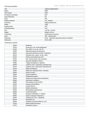 http://nemiga.com/cat_spares/etk/vin/ Informacje pojazdów: VIN WBADL81080GX69873 Marka BMW Kod modelu DL81 W obszarze sprzedaży ECE Kraj producenta DE Seria E39 Rodzaj nadwozia Lim / Sedana Zwrotnica Napęd lewostronny Model 530d Rodzaj silnika M57 Przemieszczenie 3.0 l. Moc 142 kW / 193 KM Napęd Napęd na tylne Transmisja Automatyczna skrzynia Kolor 490 - Special paint Tapicerka Z1XX - Tapicerka specj./bez danych o kolorach Wykonane 07.02.2003 Wyposażenie pojazdu S202A Steptronic S210A Dynamiczny ukł. przeciwpoślizgowy S232A Obr. BMW, st. le. spr. rad. 50 S249A Wielofunkcyjność dla kierownicy S255A Kierownica sportowa ze skóry z poduszką S261A Poduszka bocz. pasaż. na tyln. siedz. S415A Roleta przeciwsłoneczna tylna S422A Wer. drewna szlach. klon muszlowy S423A Dywaniki podłogowe Velours S428A Trójkąt ostrzegawczy i apteczka N430A Lusterko wewn. ściemniane automatycznie S431A Lusterko wewn. ściemniane automatycznie S441A Pakiet dla palących S459A Elektryczna regulacja foteli z pamięcią S464A Worek na narty S465A System załadunku S473A Podłokietnik przedni S494A Podgrzwanie fotela kierowcy/pasażera N500A Spryskiwacz reflektora S508A Park Distance Control (PDC) S520A Lampa przeciwmgłowa S521A Czujnik deszczu S522A Światło ksenonowe S534A Klimatyzacja automatyczna S548A Licznik kilometrów S555A Komputer pokładowy V z pilotem S609A System nawigacji Professional S644A Instalacja tel. kom. z Bluetooth N672A Zmieniarka CD S694A Instalacja zmieniarki BMW na 6 CD S723A Pakiet wydania Exclusive S775A Podsufitka antracyt S778A Listwy wejściowe "BMW Individual" S785A Lampy kierunkowskazów białe L801A Wersja krajowa Niemcy S818A Główny wyłącznik akumulatora S851A Wersja językowa, niemiecki S863A Spis dealerów, Europa S879A Literatura pokładowa, niemiecki S915A Dummy-SALAPA S930A Dummy-SALAPA S940A Wyposażenie na życzenie Klienta S946A Dummy-SALAPA S970A Pakiet Business Dokument przygotowany przez portal Automotive Nemiga.com. Informacje na temat VIN bezpłatnie!