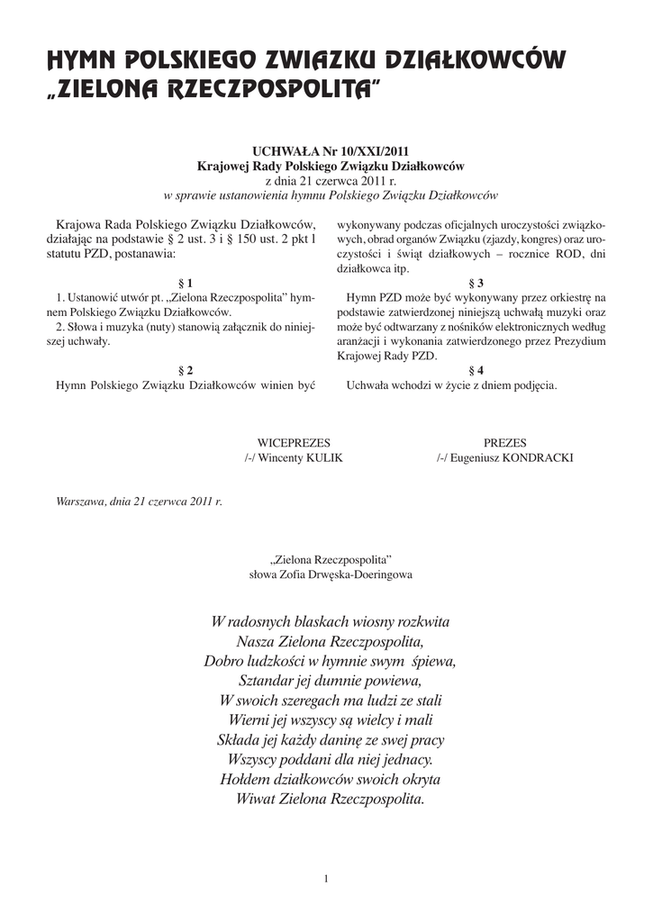 HYMN POLSKIEGO ZWIAZKU DZIAŁKOWCÓW „ZIELONA RZECZPOSPOLITA” UCHWAŁA Nr 10/XXI/2011 Krajowej Rady Polskiego Związku Działkowców z dnia 21 czerwca 2011 r. w sprawie ustanowienia hymnu Polskiego Związku Działkowców Krajowa Rada Polskiego Związku Działkowców, działając na podstawie § 2 ust. 3 i § 150 ust. 2 pkt l statutu PZD, postanawia: wykonywany podczas oficjalnych uroczystości związkowych, obrad organów Związku (zjazdy, kongres) oraz uroczystości i świąt działkowych – rocznice ROD, dni działkowca itp. §3 Hymn PZD może być wykonywany przez orkiestrę na podstawie zatwierdzonej niniejszą uchwałą muzyki oraz może być odtwarzany z nośników elektronicznych według aranżacji i wykonania zatwierdzonego przez Prezydium Krajowej Rady PZD. §4 Uchwała wchodzi w życie z dniem podjęcia. §1 1. Ustanowić utwór pt. „Zielona Rzeczpospolita” hymnem Polskiego Związku Działkowców. 2. Słowa i muzyka (nuty) stanowią załącznik do niniejszej uchwały. §2 Hymn Polskiego Związku Działkowców winien być WICEPREZES /-/ Wincenty KULIK PREZES /-/ Eugeniusz KONDRACKI Warszawa, dnia 21 czerwca 2011 r. „Zielona Rzeczpospolita” słowa Zofia Drwęska-Doeringowa W radosnych blaskach wiosny rozkwita Nasza Zielona Rzeczpospolita, Dobro ludzkoÊci w hymnie swym Êpiewa, Sztandar jej dumnie powiewa, W swoich szeregach ma ludzi ze stali Wierni jej wszyscy sà wielcy i mali Składa jej ka˝dy danin´ ze swej pracy Wszyscy poddani dla niej jednacy. Hołdem działkowców swoich okryta Wiwat Zielona Rzeczpospolita. 1 Hymn Polskiego Zwiàzku Działkowców Opracował na zlecenie PZD – J. Fijałkowski 2