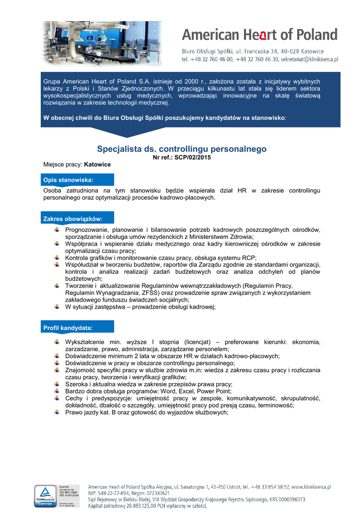 Grupa American Heart of Poland S.A. istnieje od 2000 r., założona została z inicjatywy wybitnych lekarzy z Polski i Stanów Zjednoczonych. W przeciągu kilkunastu lat stała się liderem sektora wysokospecjalistycznych usług medycznych, wprowadzając innowacyjne na skalę światową rozwiązania w zakresie technologii medycznej. W obecnej chwili do Biura Obsługi Spółki poszukujemy kandydatów na stanowisko: Specjalista ds. controllingu personalnego Nr ref.: SCP/02/2015 Miejsce pracy: Katowice Opis stanowiska: Osoba zatrudniona na tym stanowisku będzie wspierała dział HR w zakresie controllingu personalnego oraz optymalizacji procesów kadrowo-płacowych. Zakres obowiązków: Prognozowanie, planowanie i bilansowanie potrzeb kadrowych poszczególnych ośrodków, sporządzanie i obsługa umów rezydenckich z Ministerstwem Zdrowia; Współpraca i wspieranie działu medycznego oraz kadry kierowniczej ośrodków w zakresie optymalizacji czasu pracy; Kontrola grafików i monitorowanie czasu pracy, obsługa systemu RCP; Współudział w tworzeniu budżetów, raportów dla Zarządu zgodnie ze standardami organizacji, kontrola i analiza realizacji zadań budżetowych oraz analiza odchyleń od planów budżetowych; Tworzenie i aktualizowanie Regulaminów wewnątrzzakładowych (Regulamin Pracy, Regulamin Wynagradzania, ZFŚS) oraz prowadzenie spraw związanych z wykorzystaniem zakładowego funduszu świadczeń socjalnych; W sytuacji zastępstwa – prowadzenie obsługi kadrowej; Profil kandydata: Wykształcenie min. wyższe I stopnia (licencjat) – preferowane kierunki: ekonomia, zarzadzanie, prawo, administracja, zarządzanie personelem; Doświadczenie minimum 2 lata w obszarze HR w działach kadrowo-płacowych; Doświadczenie w pracy w obszarze controllingu personalnego; Znajomość specyfiki pracy w służbie zdrowia m.in: wiedza z zakresu czasu pracy i rozliczania czasu pracy, tworzenia i weryfikacji grafików; Szeroka i aktualna wiedza w zakresie przepisów prawa pracy; Bardzo dobra obsługa programów: Word, Excel, Power Point; Cechy i predyspozycje: umiejętność pracy w zespole, komunikatywność, skrupulatność, dokładność, dbałość o szczegóły, umiejętność pracy pod presją czasu, terminowość; Prawo jazdy kat. B oraz gotowość do wyjazdów służbowych; Oferujemy: Ambitną i pełną wyzwań pracę, w dynamicznej firmie, będącej liderem w swojej branży; Wynagrodzenie adekwatne do posiadanych kwalifikacji. Osoby zainteresowane udziałem w procesie rekrutacji prosimy o przesłanie aplikacji zawierającej CV i list motywacyjny z dopiskiem nr ref w tytule emaila: „SCP/02/2015” na adres e-mail: [email protected] Uprzejmie informujemy, że skontaktujemy się tylko z wybranymi osobami.