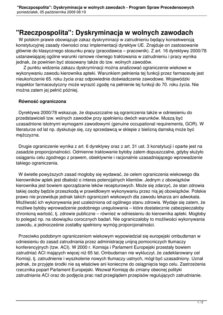 "Rzeczpospolita": Dyskryminacja w wolnych zawodach - Program Spraw Precedensowych poniedziałek, 05 października 2009 08:19 "Rzeczpospolita": Dyskryminacja w wolnych zawodach W polskim prawie obowiązuje zakaz dyskryminacji w zatrudnieniu będący konsekwencją konstytucyjnej zasady równości oraz implementacji dyrektyw UE. Znajduje on zastosowanie głównie do klasycznego stosunku pracy (pracodawca – pracownik). Z art. 16 dyrektywy 2000/78 ustanawiającej ogólne warunki ramowe równego traktowania w zatrudnieniu i pracy wynika jednak, że powinien być stosowany także do tzw. wolnych zawodów. Z punktu widzenia zakazu dyskryminacji można analizować ograniczenie wiekowe w wykonywaniu zawodu kierownika apteki. Warunkiem pełnienia tej funkcji przez farmaceutę jest nieukończenie 65. roku życia oraz odpowiednie doświadczenie zawodowe. Wojewódzki inspektor farmaceutyczny może wyrazić zgodę na pełnienie tej funkcji do 70. roku życia. Nie można zatem jej pełnić później. Równość ograniczona Dyrektywa 2000/78 wskazuje, że dopuszczalne są ograniczenia także w odniesieniu do przedstawicieli tzw. wolnych zawodów przy spełnieniu dwóch warunków. Muszą być uzasadnione istotnymi wymogami zawodowymi (genuine occupational requirements, GOR). W literaturze od lat np. dyskutuje się, czy sprzedawcą w sklepie z bielizną damską może być mężczyzna. Drugie ograniczenie wynika z art. 6 dyrektywy oraz z art. 31 ust. 3 konstytucji i oparte jest na zasadzie proporcjonalności. Odmienne traktowanie byłoby zatem dopuszczalne, gdyby służyło osiąganiu celu zgodnego z prawem, obiektywnie i racjonalnie uzasadniającego wprowadzenie takiego ograniczenia. W świetle powyższych zasad mogłoby się wydawać, że celem ograniczenia wiekowego dla kierowników aptek jest dbałość o interes potencjalnych klientów. Jednym z obowiązków kierownika jest bowiem sporządzanie leków recepturowych. Może się zdarzyć, że stan zdrowia takiej osoby będzie przeszkodą w prawidłowym wykonywaniu przez nią jej obowiązków. Polskie prawo nie przewiduje jednak takich ograniczeń wiekowych dla zawodu lekarza ani adwokata. Możliwość ich wykonywania jest uzależniona od ogólnego stanu zdrowia. Wydaje się zatem, że możliwe byłoby wprowadzenie podobnego uregulowania – które dostatecznie zabezpieczałoby chronioną wartość, tj. zdrowie publiczne – również w odniesieniu do kierownika apteki. Mogłoby to polegać np. na obowiązku corocznych badań. Nie ograniczałoby to możliwości wykonywania zawodu, a jednocześnie zostałby spełniony wymóg proporcjonalności. Przeciwko podobnym ograniczeniom wiekowym wypowiedział się europejski ombudsman w odniesieniu do zasad zatrudniania przez administrację unijną pomocniczych tłumaczy konferencyjnych (tzw. ACI). W 2000 r. Komisja i Parlament Europejski przestały bowiem zatrudniać ACI mających więcej niż 65 lat. Ombudsman nie wykluczył, że zadeklarowany cel Komisji, tj. zatrudnienie i wyszkolenie nowych tłumaczy ustnych, mógł być uzasadniony. Uznał jednak, że przyjęte środki nie są właściwe ani konieczne do osiągnięcia tego celu. Zastrzeżenia rzecznika poparł Parlament Europejski. Wezwał Komisję do zmiany obecnej polityki zatrudniania ACI oraz do podjęcia prac nad przeglądem przepisów regulujących zatrudnianie. 1/2 "Rzeczpospolita": Dyskryminacja w wolnych zawodach - Program Spraw Precedensowych poniedziałek, 05 października 2009 08:19 Prawo do analizy Konieczne wydaje się zatem przeanalizowanie także polskich przepisów pod kątem tego, czy nie ograniczają konstytucyjnych praw jednostki oraz zasad ogólnych prawa wspólnotowego (por. wyrok ETS w sprawie C-144/04 Mangold). Taką konieczność wydaje się potwierdzać wydana ostatnio opinia rzecznika generalnego ETS w sprawie Petersen (C-341/09). Uznał on że dyrektywa 2000/78 nie stoi na przeszkodzie uregulowaniu obowiązującemu w Niemczech, które ogranicza możliwość wykonywania zawodu dentysty do 68. roku życia. Ocenił, że racjonalnie i obiektywnie uzasadnione są cele – ochrona systemu ubezpieczeń zdrowotnych oraz stworzenie młodym osobom szans na wykonywanie zawodu dentysty. Nie wiadomo, czy ETS podzieli zdanie rzecznika generalnego. Jego opinia jednak skłania do zastanowienia się, czy ograniczenia wiekowe dla kierowników aptek zawarte w prawie farmaceutycznym są przejawem tak wyraźnie określonych racjonalnych i spójnych celów jak regulacje niemieckie. Barbara Grabowska Joomla SEF URLs by Artio 2/2