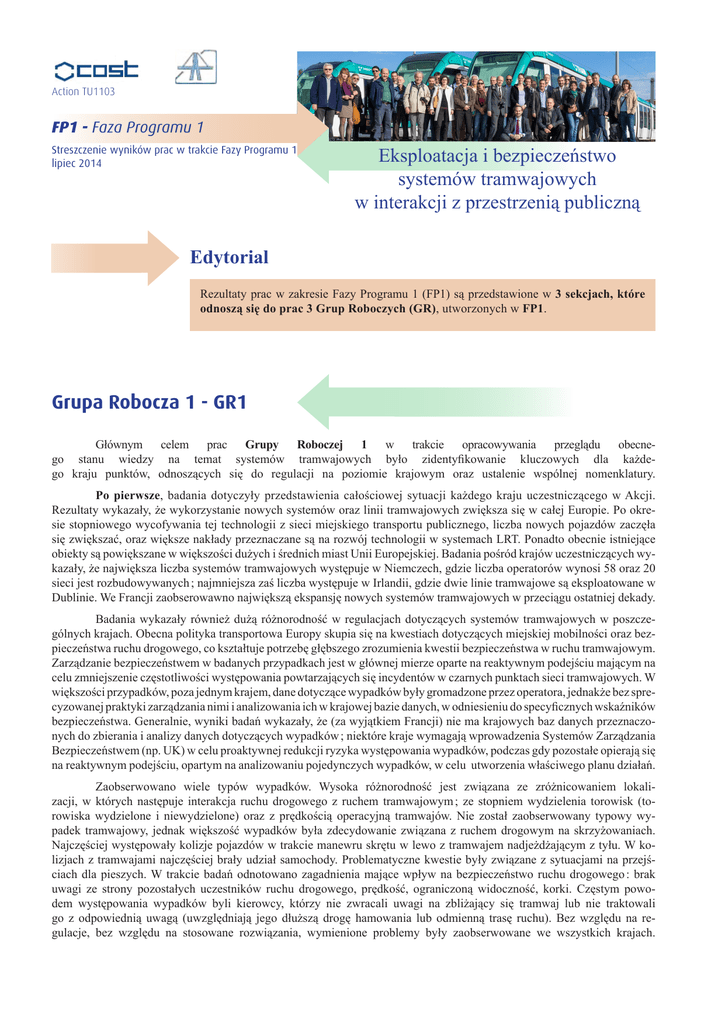 Action TU1103 FP1 - Faza Programu 1 Streszczenie wyników prac w trakcie Fazy Programu 1 lipiec 2014 Eksploatacja i bezpieczeństwo systemów tramwajowych w interakcji z przestrzenią publiczną Edytorial Rezultaty prac w zakresie Fazy Programu 1 (FP1) są przedstawione w 3 sekcjach, które odnoszą się do prac 3 Grup Roboczych (GR), utworzonych w FP1. Grupa Robocza 1 - GR1 Głównym celem prac Grupy Roboczej 1 w trakcie opracowywania przeglądu obecnego stanu wiedzy na temat systemów tramwajowych było zidentyfikowanie kluczowych dla każdego kraju punktów, odnoszących się do regulacji na poziomie krajowym oraz ustalenie wspólnej nomenklatury. Po pierwsze, badania dotyczyły przedstawienia całościowej sytuacji każdego kraju uczestniczącego w Akcji. Rezultaty wykazały, że wykorzystanie nowych systemów oraz linii tramwajowych zwiększa się w całej Europie. Po okresie stopniowego wycofywania tej technologii z sieci miejskiego transportu publicznego, liczba nowych pojazdów zaczęła się zwiększać, oraz większe nakłady przeznaczane są na rozwój technologii w systemach LRT. Ponadto obecnie istniejące obiekty są powiększane w większości dużych i średnich miast Unii Europejskiej. Badania pośród krajów uczestniczących wykazały, że największa liczba systemów tramwajowych występuje w Niemczech, gdzie liczba operatorów wynosi 58 oraz 20 sieci jest rozbudowywanych ; najmniejsza zaś liczba występuje w Irlandii, gdzie dwie linie tramwajowe są eksploatowane w Dublinie. We Francji zaobserowawno największą ekspansję nowych systemów tramwajowych w przeciągu ostatniej dekady. Badania wykazały również dużą różnorodność w regulacjach dotyczących systemów tramwajowych w poszczególnych krajach. Obecna polityka transportowa Europy skupia się na kwestiach dotyczących miejskiej mobilności oraz bezpieczeństwa ruchu drogowego, co kształtuje potrzebę głębszego zrozumienia kwestii bezpieczeństwa w ruchu tramwajowym. Zarządzanie bezpieczeństwem w badanych przypadkach jest w głównej mierze oparte na reaktywnym podejściu mającym na celu zmniejszenie częstotliwości występowania powtarzających się incydentów w czarnych punktach sieci tramwajowych. W większości przypadków, poza jednym krajem, dane dotyczące wypadków były gromadzone przez operatora, jednakże bez sprecyzowanej praktyki zarządzania nimi i analizowania ich w krajowej bazie danych, w odniesieniu do specyficznych wskaźników bezpieczeństwa. Generalnie, wyniki badań wykazały, że (za wyjątkiem Francji) nie ma krajowych baz danych przeznaczonych do zbierania i analizy danych dotyczących wypadków ; niektóre kraje wymagają wprowadzenia Systemów Zarządzania Bezpieczeństwem (np. UK) w celu proaktywnej redukcji ryzyka występowania wypadków, podczas gdy pozostałe opierają się na reaktywnym podejściu, opartym na analizowaniu pojedynczych wypadków, w celu utworzenia właściwego planu działań. Zaobserwowano wiele typów wypadków. Wysoka różnorodność jest związana ze zróżnicowaniem lokalizacji, w których następuje interakcja ruchu drogowego z ruchem tramwajowym ; ze stopniem wydzielenia torowisk (torowiska wydzielone i niewydzielone) oraz z prędkością operacyjną tramwajów. Nie został zaobserwowany typowy wypadek tramwajowy, jednak większość wypadków była zdecydowanie związana z ruchem drogowym na skrzyżowaniach. Najczęściej występowały kolizje pojazdów w trakcie manewru skrętu w lewo z tramwajem nadjeżdżającym z tyłu. W kolizjach z tramwajami najczęściej brały udział samochody. Problematyczne kwestie były związane z sytuacjami na przejściach dla pieszych. W trakcie badań odnotowano zagadnienia mające wpływ na bezpieczeństwo ruchu drogowego : brak uwagi ze strony pozostałych uczestników ruchu drogowego, prędkość, ograniczoną widoczność, korki. Częstym powodem występowania wypadków byli kierowcy, którzy nie zwracali uwagi na zbliżający się tramwaj lub nie traktowali go z odpowiednią uwagą (uwzględniają jego dłuższą drogę hamowania lub odmienną trasę ruchu). Bez względu na regulacje, bez względu na stosowane rozwiązania, wymienione problemy były zaobserwowane we wszystkich krajach. Po drugie, badanie dotyczyło ram prawnych i technicznych w systemach LRT ; została sporządzona kompletna lista regulacji na poziomie krajowym i unijnym, dotyczących systemów tramwajowych. Regulacje pomiędzy krajami są mocno zróżnicowane. Odnośnie systemów tramwajowych, w większości przypadków nie występuje jeden kodeks gromadzący wszystkie przepisy dotyczące sektora tramwajowego, zazwyczaj występują interpretacje przepisów dotyczących kolei oraz sektora drogowego. Z drugiej strony, składowe tego systemu często zawierają normy bazujące na krajowych standardach technicznych, czasem uwzględniające zapisy z norm europejskich, które odnoszą się do systemów LRT. Niektóre z nich są związane ze statystykami dotyczącymi kolei oraz zarządzania bezpieczeństwem, jednak większość z nich odnosi się do aspektów techniczny (tabor, źródło zasilania, tory). Ostatecznie, został opracowany wspólny glosariusz w celu odnalezienia możliwych problematycznych kwestii językowych oraz uniknięcia potencjalnych pomyłek i złego tłumaczenia. Ten glosariusz (nie będący słownikiem) zawiera zilustrowane główne pojęcia w oryginalnym języku oraz ich opis w języku angielskim (tramwaj, szybki tramwaj, ruch mieszany, torowiska wydzielone…). Została również opracowana ogólna tabela ze wszystkimi tłumaczeniami w poszczególnych językach, uzupełniona o komentarze. Podsumowując, nie napotkano żadnych skomplikowanych kwestii spornych, jednak pojęcia takie jak jak „metrobus” lub „władze lokalne” okazały się nieznacznie różnić. Grupa Robocza 2 - GR2 Grupa Robocza 2 podjęła się opracowania danych z wypadków oraz innych wskaźników, które mają związek z występowaniem wypa