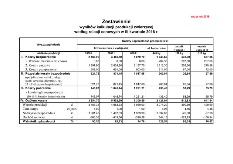 wrzesień 2016 Zestawienie wyników kalkulacji produkcji zwierzęcej według relacji cenowych w III kwartale 2016 r. Koszty i opłacalność produkcji w zł Wyszczególnienie krowa mleczna o wydajności wielkość produkcji 3500 l I. Koszty bezpośrednie 1. Wartość materiału do chowu 2. Koszty paszowe 3. Koszty pozapaszowe II. Pozostałe koszty bezpośrednie (specjalistyczne wydatki, usługi, środki czystości, dezynfekc., itp., 25 - 5 % kosztów bezpośrednich) III. Koszty pośrednie 5000 l 6000 l mł. bydło rzeźne tucznik wariant I tucznik wariant II 440 kg 110 kg 110 kg 2 486,90 3 485,80 4 070,70 1 733,60 532,90 557,86 0,00 0,00 0,00 209,30 207,60 207,60 1 897,90 2 834,80 3 167,70 1 313,30 258,30 278,26 589,00 621,73 651,00 871,45 903,00 1 017,68 211,00 260,04 67,00 26,64 72,00 27,89 621,73 746,07 871,45 1 045,74 1 017,68 1 221,21 260,04 433,40 26,64 53,29 27,89 55,79 746,07 3 854,70 1 045,74 5 402,99 1 221,21 6 309,59 433,40 2 427,04 53,29 612,83 55,79 641,54 3 488,33 4 983,33 5 980,00 3 071,20 490,60 490,60 1,00 1,00 1,00 6,98 4,46 4,46 1 001,43 1 497,53 1 909,30 1 337,60 -42,30 -67,26 -366,36 -419,66 -329,59 644,16 -122,23 -150,94 90,50 92,23 94,78 126,54 80,05 76,47 - koszty ogólnogospodarcze (30-10 % kosztów bezpośrednich) IV. Ogółem koszty Wartość produkcji Cena skupu Nadwyżka bezpośrednia Dochód rolniczy Wskaźnik opłacalności zł zł/jedn. zł zł %