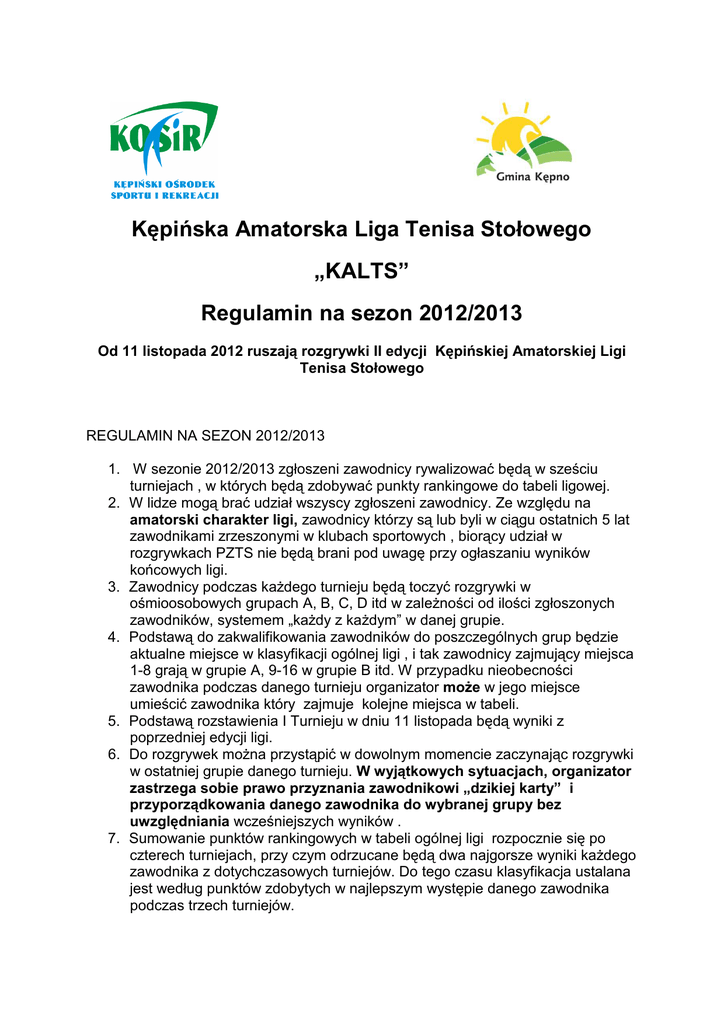 Kępińska Amatorska Liga Tenisa Stołowego „KALTS” Regulamin na sezon 2012/2013 Od 11 listopada 2012 ruszają rozgrywki II edycji Kępińskiej Amatorskiej Ligi Tenisa Stołowego REGULAMIN NA SEZON 2012/2013 1. W sezonie 2012/2013 zgłoszeni zawodnicy rywalizować będą w sześciu turniejach , w których będą zdobywać punkty rankingowe do tabeli ligowej. 2. W lidze mogą brać udział wszyscy zgłoszeni zawodnicy. Ze względu na amatorski charakter ligi, zawodnicy którzy są lub byli w ciągu ostatnich 5 lat zawodnikami zrzeszonymi w klubach sportowych , biorący udział w rozgrywkach PZTS nie będą brani pod uwagę przy ogłaszaniu wyników końcowych ligi. 3. Zawodnicy podczas każdego turnieju będą toczyć rozgrywki w ośmioosobowych grupach A, B, C, D itd w zależności od ilości zgłoszonych zawodników, systemem „każdy z każdym” w danej grupie. 4. Podstawą do zakwalifikowania zawodników do poszczególnych grup będzie aktualne miejsce w klasyfikacji ogólnej ligi , i tak zawodnicy zajmujący miejsca 1-8 grają w grupie A, 9-16 w grupie B itd. W przypadku nieobecności zawodnika podczas danego turnieju organizator może w jego miejsce umieścić zawodnika który zajmuje kolejne miejsca w tabeli. 5. Podstawą rozstawienia I Turnieju w dniu 11 listopada będą wyniki z poprzedniej edycji ligi. 6. Do rozgrywek można przystąpić w dowolnym momencie zaczynając rozgrywki w ostatniej grupie danego turnieju. W wyjątkowych sytuacjach, organizator zastrzega sobie prawo przyznania zawodnikowi „dzikiej karty” i przyporządkowania danego zawodnika do wybranej grupy bez uwzględniania wcześniejszych wyników . 7. Sumowanie punktów rankingowych w tabeli ogólnej ligi rozpocznie się po czterech turniejach, przy czym odrzucane będą dwa najgorsze wyniki każdego zawodnika z dotychczasowych turniejów. Do tego czasu klasyfikacja ustalana jest według punktów zdobytych w najlepszym występie danego zawodnika podczas trzech turniejów. 8. W przypadku równej ilości punktów rankingowych o miejscu w tabeli decyduje wynik ostatniego turnieju 9. W każdym turnieju można zdobyć następującą ilość punktów rankingowych – ligowych: Grupa A 1. 2. 3. 4. 5. 6. 7. 8. Miejsce 100 Miejsce 95 Miejsce 90 Miejsce 85 Miejsce 80 Miejsce 75 Miejsce 70 Miejsce 65 Grupa B 1. 2. 3. 4. 5. 6. 7. 8. Miejsce Miejsce Miejsce Miejsce Miejsce Miejsce Miejsce Miejsce 85 81 77 73 69 65 61 57 Miejsce Miejsce Miejsce Miejsce Miejsce Miejsce Miejsce Miejsce 73 70 67 64 61 58 56 54 Miejsce Miejsce Miejsce Miejsce Miejsce Miejsce Miejsce Miejsce 64 62 60 58 56 54 52 50 Grupa C 1. 2. 3. 4. 5. 6. 7. 8. Grupa D 1. 2. 3. 4. 5. 6. 7. 8. O końcowej klasyfikacji w danym Turnieju decydować będzie w pierwszej kolejności ilość wygranych setów. W przypadku równej ilości setów wygranych decyduje w kolejności 1) wynik bezpośredniego pojedynku 2) różnica setów 10. Wszystkie mecze będą rozgrywane w niedziele od godz. 10.00 w n/w terminach. Przyporządkowanie zawodników do poszczególnych grup nastąpi w ciągu 15 min od godziny rozpoczęcia turnieju. Zawodnicy, którzy spóźnią się a nie przekażą informacji o tym organizatorowi , będą mogli rywalizować w ostatniej grupie. - 11 listopada 2012 – 1 runda - 02 grudnia 2012 – 2 runda - 20 stycznia 2013 – 3 runda - 10 lutego 2013 – 4 runda - 03 marca 2013 – 5 runda - 31 marca 2013 – 6 runda 11. Mecze rozgrywane będą do 3 wygranych setów. 12. Każdy zawodnik zobowiązany jest do uiszczenia wpisowego w wysokości 40 złotych (za cały sezon) do dnia 31 grudnia 2012. Dopiero po uiszczeniu opłaty wpisowej, zawodnik będzie zgłoszony do rozgrywek na pełnych prawach!!! . Wpłaty dokonuje się u organizatora ligi (Maciej Baciński lub w biurze KOSiR). Wszystkie mecze będą się odbywały w hali KOSiR (salka gimnastyczna) w Kępnie . Organizator dostarcza piłeczki na wszystkie mecze w kolorze białym 13. Dla wszystkich uczestników organizator zapewnia pamiątkowe dyplomy a za zajęcie 3 pierwszych miejsc w lidze puchary i dyplomy
