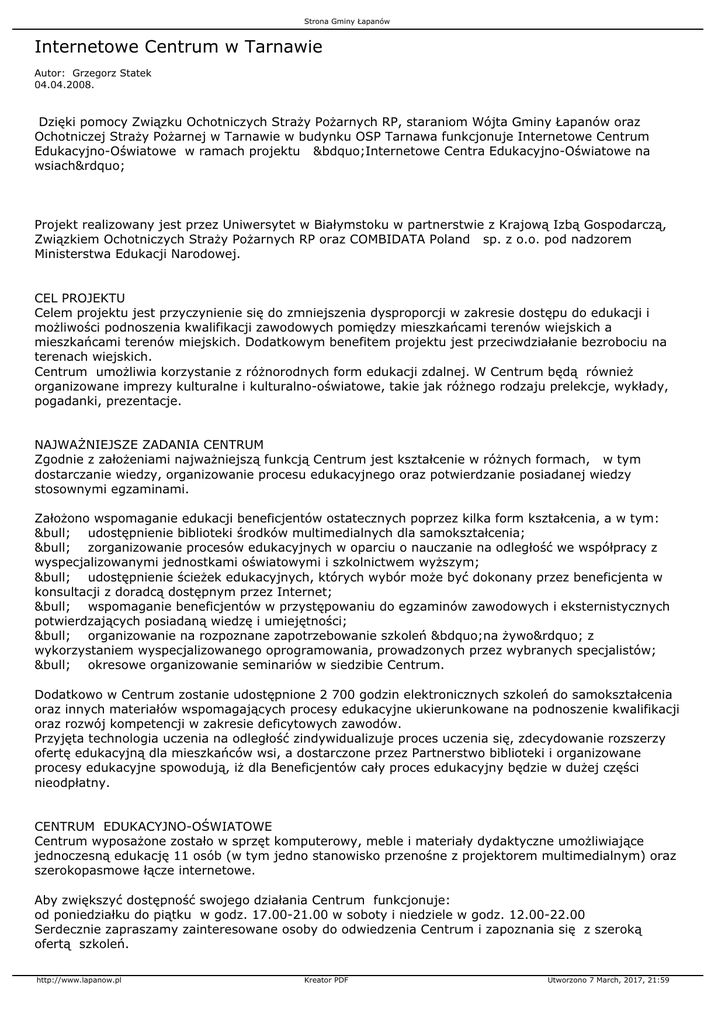 Strona Gminy Łapanów Internetowe Centrum w Tarnawie Autor: Grzegorz Statek 04.04.2008. Dzięki pomocy Związku Ochotniczych Straży Pożarnych RP, staraniom Wójta Gminy Łapanów oraz Ochotniczej Straży Pożarnej w Tarnawie w budynku OSP Tarnawa funkcjonuje Internetowe Centrum Edukacyjno-Oświatowe w ramach projektu „Internetowe Centra Edukacyjno-Oświatowe na wsiach” Projekt realizowany jest przez Uniwersytet w Białymstoku w partnerstwie z Krajową Izbą Gospodarczą, Związkiem Ochotniczych Straży Pożarnych RP oraz COMBIDATA Poland sp. z o.o. pod nadzorem Ministerstwa Edukacji Narodowej. CEL PROJEKTU Celem projektu jest przyczynienie się do zmniejszenia dysproporcji w zakresie dostępu do edukacji i możliwości podnoszenia kwalifikacji zawodowych pomiędzy mieszkańcami terenów wiejskich a mieszkańcami terenów miejskich. Dodatkowym benefitem projektu jest przeciwdziałanie bezrobociu na terenach wiejskich. Centrum umożliwia korzystanie z różnorodnych form edukacji zdalnej. W Centrum będą również organizowane imprezy kulturalne i kulturalno-oświatowe, takie jak różnego rodzaju prelekcje, wykłady, pogadanki, prezentacje. NAJWAŻNIEJSZE ZADANIA CENTRUM Zgodnie z założeniami najważniejszą funkcją Centrum jest kształcenie w różnych formach, w tym dostarczanie wiedzy, organizowanie procesu edukacyjnego oraz potwierdzanie posiadanej wiedzy stosownymi egzaminami. Założono wspomaganie edukacji beneficjentów ostatecznych poprzez kilka form kształcenia, a w tym: • udostępnienie biblioteki środków multimedialnych dla samokształcenia; • zorganizowanie procesów edukacyjnych w oparciu o nauczanie na odległość we współpracy z wyspecjalizowanymi jednostkami oświatowymi i szkolnictwem wyższym; • udostępnienie ścieżek edukacyjnych, których wybór może być dokonany przez beneficjenta w konsultacji z doradcą dostępnym przez Internet; • wspomaganie beneficjentów w przystępowaniu do egzaminów zawodowych i eksternistycznych potwierdzających posiadaną wiedzę i umiejętności; • organizowanie na rozpoznane zapotrzebowanie szkoleń „na żywo” z wykorzystaniem wyspecjalizowanego oprogramowania, prowadzonych przez wybranych specjalistów; • okresowe organizowanie seminariów w siedzibie Centrum. Dodatkowo w Centrum zostanie udostępnione 2 700 godzin elektronicznych szkoleń do samokształcenia oraz innych materiałów wspomagających procesy edukacyjne ukierunkowane na podnoszenie kwalifikacji oraz rozwój kompetencji w zakresie deficytowych zawodów. Przyjęta technologia uczenia na odległość zindywidualizuje proces uczenia się, zdecydowanie rozszerzy ofertę edukacyjną dla mieszkańców wsi, a dostarczone przez Partnerstwo biblioteki i organizowane procesy edukacyjne spowodują, iż dla Beneficjentów cały proces edukacyjny będzie w dużej części nieodpłatny. CENTRUM EDUKACYJNO-OŚWIATOWE Centrum wyposażone zostało w sprzęt komputerowy, meble i materiały dydaktyczne umożliwiające jednoczesną edukację 11 osób (w tym jedno stanowisko przenośne z projektorem multimedialnym) oraz szerokopasmowe łącze internetowe. Aby zwiększyć dostępność swojego działania Centrum funkcjonuje: od poniedziałku do piątku w godz. 17.00-21.00 w soboty i niedziele w godz. 12.00-22.00 Serdecznie zapraszamy zainteresowane osoby do odwiedzenia Centrum i zapoznania się z szeroką ofertą szkoleń. http://www.lapanow.pl Kreator PDF Utworzono 7 March, 2017, 21:59 Strona Gminy Łapanów Galeria zdjęć: Tekst i zdjęcia: Wiesław Węglarz - UG Łapanów http://www.lapanow.pl Kreator PDF Utworzono 7 March, 2017, 21:59