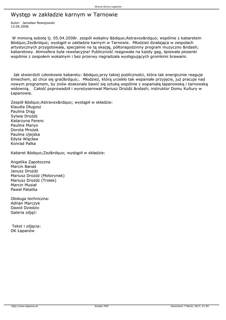 Strona Gminy Łapanów Występ w zakładzie karnym w Tarnowie Autor: Jarosław Nowojowski 13.04.2008. W minioną sobotę tj. 05.04.2008r. zespół wokalny „Astravox” wspólnie z kabaretem „Zez” wystąpił w zakładzie karnym w Tarnowie. Młodzież działająca w zespołach artystycznych przygotowała, specjalnie na tą okazję, półtoragodzinny program muzyczno – kabaretowy. Atmosfera była rewelacyjna! Publiczność reagowała na każdy gag, śpiewała piosenki wspólnie z zespołem wokalnym i bez przerwy nagradzała występujących gromkimi brawami. Jak stwierdzili członkowie kabaretu: „przy takiej publiczności, która tak energicznie reaguje śmiechem, aż chce się grać”. Młodzież, którą urzekło tak wspaniałe przyjęcie, już pracuje nad nowym programem, by znów doskonale bawić się sztuką wspólnie z wspaniałą łapanowską i tarnowską widownią. Całość poprowadził i wyreżyserował Mariusz Drożdż – instruktor Domu Kultury w Łapanowie. Zespół „Astravox” wystąpił w składzie: Klaudia Długosz Paulina Drąg Sylwia Drożdż Katarzyna Ferenc Paulina Manys Dorota Mrożek Paulina Ujejska Edyta Więcław Konrad Palka Kabaret „Zez” wystąpił w składzie: Angelika Zapotoczna Marcin Banaś Janusz Drożdż Mariusz Drożdż (Motorynek) Mariusz Drożdż (Trolek) Marcin Musiał Paweł Patalita Obsługa techniczna: Adrian Marczyk Dawid Dziedzic Galeria zdjęć: Tekst i zdjęcia: DK Łapanów http://www.lapanow.pl Kreator PDF Utworzono 7 March, 2017, 21:59
