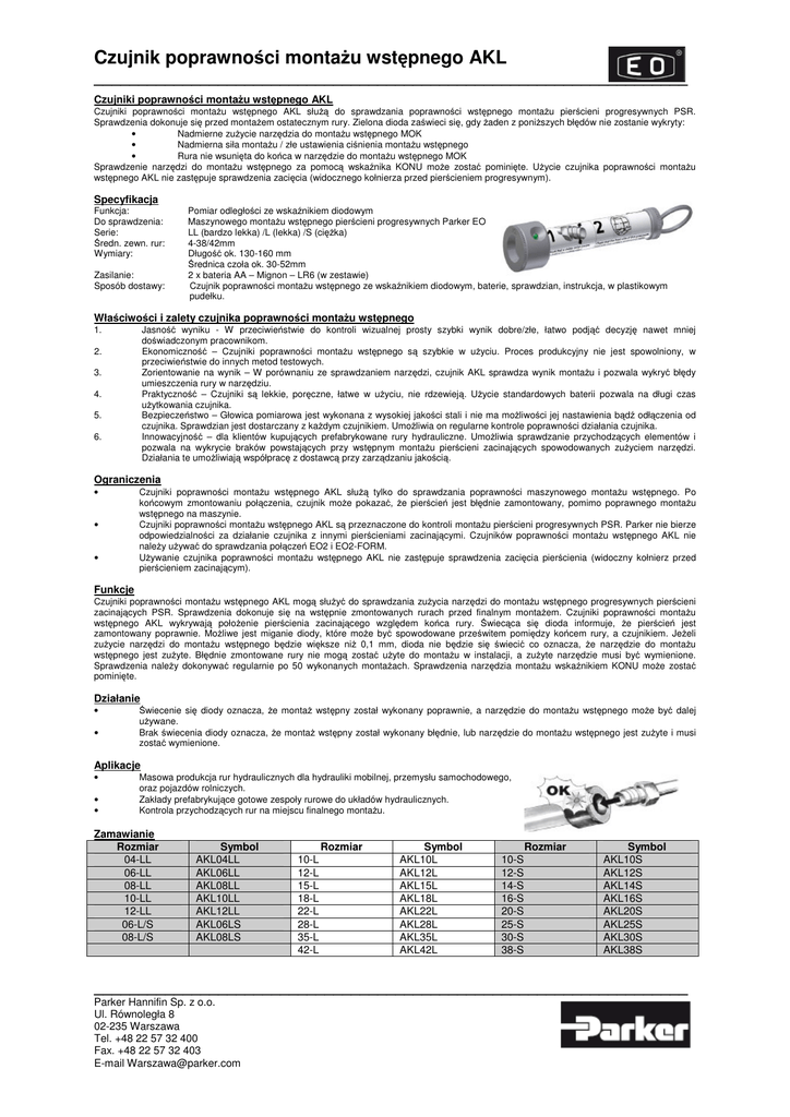 Czujnik poprawno ci monta u wst pnego AKL ___________________________________________________________________ Czujniki poprawno ci monta u wst pnego AKL Czujniki poprawno ci monta u wst pnego AKL słu do sprawdzania poprawno ci wst pnego monta u pier cieni progresywnych PSR. Sprawdzenia dokonuje si przed monta em ostatecznym rury. Zielona dioda za wieci si , gdy aden z poni szych bł dów nie zostanie wykryty: • Nadmierne zu ycie narz dzia do monta u wst pnego MOK • Nadmierna siła monta u / złe ustawienia ci nienia monta u wst pnego • Rura nie wsuni ta do ko ca w narz dzie do monta u wst pnego MOK Sprawdzenie narz dzi do monta u wst pnego za pomoc wska nika KONU mo e zosta pomini te. U ycie czujnika poprawno ci monta u wst pnego AKL nie zast puje sprawdzenia zaci cia (widocznego kołnierza przed pier cieniem progresywnym). Specyfikacja Funkcja: Do sprawdzenia: Serie: redn. zewn. rur: Wymiary: Zasilanie: Sposób dostawy: Pomiar odległo ci ze wska nikiem diodowym Maszynowego monta u wst pnego pier cieni progresywnych Parker EO LL (bardzo lekka) /L (lekka) /S (ci ka) 4-38/42mm Długo ok. 130-160 mm rednica czoła ok. 30-52mm 2 x bateria AA – Mignon – LR6 (w zestawie) Czujnik poprawno ci monta u wst pnego ze wska nikiem diodowym, baterie, sprawdzian, instrukcja, w plastikowym pudełku. Wła ciwo ci i zalety czujnika poprawno ci monta u wst pnego 1. Jasno wyniku - W przeciwie stwie do kontroli wizualnej prosty szybki wynik dobre/złe, łatwo podj decyzj nawet mniej do wiadczonym pracownikom. Ekonomiczno – Czujniki poprawno ci monta u wst pnego s szybkie w u yciu. Proces produkcyjny nie jest spowolniony, w przeciwie stwie do innych metod testowych. Zorientowanie na wynik – W porównaniu ze sprawdzaniem narz dzi, czujnik AKL sprawdza wynik monta u i pozwala wykry bł dy umieszczenia rury w narz dziu. Praktyczno – Czujniki s lekkie, por czne, łatwe w u yciu, nie rdzewiej . U ycie standardowych baterii pozwala na długi czas u ytkowania czujnika. Bezpiecze stwo – Głowica pomiarowa jest wykonana z wysokiej jako ci stali i nie ma mo liwo ci jej nastawienia b d odł czenia od czujnika. Sprawdzian jest dostarczany z ka dym czujnikiem. Umo liwia on regularne kontrole poprawno ci działania czujnika. Innowacyjno – dla klientów kupuj cych prefabrykowane rury hydrauliczne. Umo liwia sprawdzanie przychodz cych elementów i pozwala na wykrycie braków powstaj cych przy wst pnym monta u pier cieni zacinaj cych spowodowanych zu yciem narz dzi. Działania te umo liwiaj współprac z dostawc przy zarz dzaniu jako ci . 2. 3. 4. 5. 6. Ograniczenia • • • Czujniki poprawno ci monta u wst pnego AKL słu tylko do sprawdzania poprawno ci maszynowego monta u wst pnego. Po ko cowym zmontowaniu poł czenia, czujnik mo e pokaza , e pier cie jest bł dnie zamontowany, pomimo poprawnego monta u wst pnego na maszynie. Czujniki poprawno ci monta u wst pnego AKL s przeznaczone do kontroli monta u pier cieni progresywnych PSR. Parker nie bierze odpowiedzialno ci za działanie czujnika z innymi pier cieniami zacinaj cymi. Czujników poprawno ci monta u wst pnego AKL nie nale y u ywa do sprawdzania poł cze EO2 i EO2-FORM. U ywanie czujnika poprawno ci monta u wst pnego AKL nie zast puje sprawdzenia zaci cia pier cienia (widoczny kołnierz przed pier cieniem zacinaj cym). Funkcje Czujniki poprawno ci monta u wst pnego AKL mog słu y do sprawdzania zu ycia narz dzi do monta u wst pnego progresywnych pier cieni zacinaj cych PSR. Sprawdzenia dokonuje si na wst pnie zmontowanych rurach przed finalnym monta em. Czujniki poprawno ci monta u wst pnego AKL wykrywaj poło enie pier cienia zacinaj cego wzgl dem ko ca rury. wiec ca si dioda informuje, e pier cie jest zamontowany poprawnie. Mo liwe jest miganie diody, które mo e by spowodowane prze witem pomi dzy ko cem rury, a czujnikiem. Je eli zu ycie narz dzi do monta u wst pnego b dzie wi ksze ni 0,1 mm, dioda nie b dzie si wieci co oznacza, e narz dzie do monta u wst pnego jest zu yte. Bł dnie zmontowane rury nie mog zosta u yte do monta u w instalacji, a zu yte narz dzie musi by wymienione. Sprawdzenia nale y dokonywa regularnie po 50 wykonanych monta ach. Sprawdzenia narz dzia monta u wska nikiem KONU mo e zosta pomini te. Działanie • • wiecenie si diody oznacza, e monta wst pny został wykonany poprawnie, a narz dzie do monta u wst pnego mo e by dalej u ywane. Brak wiecenia diody oznacza, e monta wst pny został wykonany bł dnie, lub narz dzie do monta u wst pnego jest zu yte i musi zosta wymienione. Aplikacje • • • Masowa produkcja rur hydraulicznych dla hydrauliki mobilnej, przemysłu samochodowego, oraz pojazdów rolniczych. Zakłady prefabrykuj ce gotowe zespoły rurowe do układów hydraulicznych. Kontrola przychodz cych rur na miejscu finalnego monta u. Zamawianie Rozmiar 04-LL 06-LL 08-LL 10-LL 12-LL 06-L/S 08-L/S Symbol AKL04LL AKL06LL AKL08LL AKL10LL AKL12LL AKL06LS AKL08LS 10-L 12-L 15-L 18-L 22-L 28-L 35-L 42-L Rozmiar Symbol AKL10L AKL12L AKL15L AKL18L AKL22L AKL28L AKL35L AKL42L 10-S 12-S 14-S 16-S 20-S 25-S 30-S 38-S Rozmiar Symbol AKL10S AKL12S AKL14S AKL16S AKL20S AKL25S AKL30S AKL38S ___________________________________________________________________ Parker Hannifin Sp. z o.o. Ul. Równoległa 8 02-235 Warszawa Tel. +48 22 57 32 400 Fax. +48 22 57 32 403 E-mail [email protected]