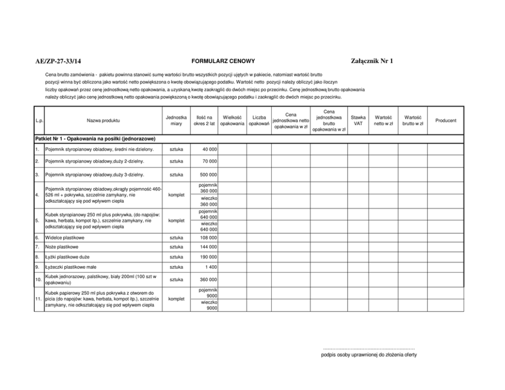 Załącznik Nr 1 FORMULARZ CENOWY AE/ZP-27-33/14 Cena brutto zamówienia - pakietu powinna stanowić sumę wartości brutto wszystkich pozycji ujętych w pakiecie, natomiast wartość brutto pozycji winna być obliczona jako wartość netto powiększona o kwotę obowiązującego podatku. Wartość netto pozycji należy obliczyć jako iloczyn liczby opakowań przez cenę jednostkową netto opakowania, a uzyskaną kwotę zaokrąglić do dwóch miejsc po przecinku. Cenę jednostkową brutto opakowania należy obliczyć jako cenę jednostkową netto opakowania powiększoną o kwotę obowiązującego podatku i zaokrąglić do dwóch miejsc po przecinku. L.p. Nazwa produktu Jednostka miary Ilość na okres 2 lat Cena Wielkość Liczba jednostkowa netto opakowania opakowań opakowania w zł Cena jednostkowa brutto opakowania w zł Stawka VAT Wartość netto w zł Wartość brutto w zł Patkiet Nr 1 - Opakowania na posiłki (jednorazowe) 1. Pojemnik styropianowy obiadowy, średni nie dzielony. sztuka 40 000 2. Pojemnik styropianowy obiadowy,duży 2-dzielny. sztuka 70 000 3. Pojemnik styropianowy obiadowy,duży 3-dzielny. sztuka 500 000 4. Pojemnik styropianowy obiadowy,okrągły pojemność 460526 ml + pokrywka, szczelnie zamykany, nie odkształcający się pod wpływem ciepła 5. Kubek styropianowy 250 ml plus pokrywka, (do napojów: kawa, herbata, kompot itp.), szczelnie zamykany, nie odkształcający się pod wpływem ciepła komplet pojemnik 640 000 wieczko 640 000 6. Widelce plastikowe sztuka 108 000 7. Noże plastikowe sztuka 144 000 8. Łyżki plastikowe duże sztuka 190 000 9. Łyżeczki plastikowe małe sztuka 1 400 10. Kubek jednorazowy, palstikowy, biały 200ml (100 szt w opakowaniu) sztuka 360 000 komplet pojemnik 9000 wieczko 9000 Kubek papierowy 250 ml plus pokrywka z otworem do 11. picia (do napojów: kawa, herbata, kompot itp.), szczelnie zamykany, nie odkształcający się pod wpływem ciepła komplet pojemnik 360 000 wieczko 360 000 …………………………………………………… podpis osoby uprawnionej do złożenia oferty Producent L.p. Nazwa produktu Jednostka miary Ilość na okres 2 lat 12. Pojemnik z polipropylenu prostokątny PP 250 ml, wys. 45mm +/- 5% sztuka 40 000 13. Pojemnik z polipropylenu prostokatny PP 350 ml, wys. 67mm +/- 5% sztuka 5 000 14. Pojemnik z polipropylenu prostokątny PP 500 ml, wys. 98mm +/- 5% sztuka 1 000 sztuka 46 000 16. Pojemnik z polipropylenu okrągły PS 50 ml plus wieczko komplet pojemnik 3000 wieczko 3000 17. Pojemnik typu PET 700-750 ml (sałatkowy) z zespoloną pokrywką wys. do 900 mm +/- 5% sztuka 2 000 18. Talerzyk deserowy jednorazowy papierowy okragły, średnica 15 cm +/- 5% sztuka 20 000 19. Taca aluminiowa mała wymiary ok.350x245 mm +/- 5% sztuka 200 sztuka 200 sztuka 1 000 15. Przykrywka prostokatna PP do poj. 250,350,500ml 20. Taca aluminiowa średnia wymiary ok. 420x290 mm +/5% Pojemnik z polipropylenu o poj. 1 litra, wysokość nie 21. większa niż 7cm, z możliwością używania w kuchenkach mikrofalowych Cena Wielkość Liczba jednostkowa netto opakowania opakowań opakowania w zł Cena jednostkowa brutto opakowania w zł Stawka VAT Wartość netto w zł Wartość brutto w zł Razem Pakiet Nr 1 …………………………………………………… podpis osoby uprawnionej do złożenia oferty Producent