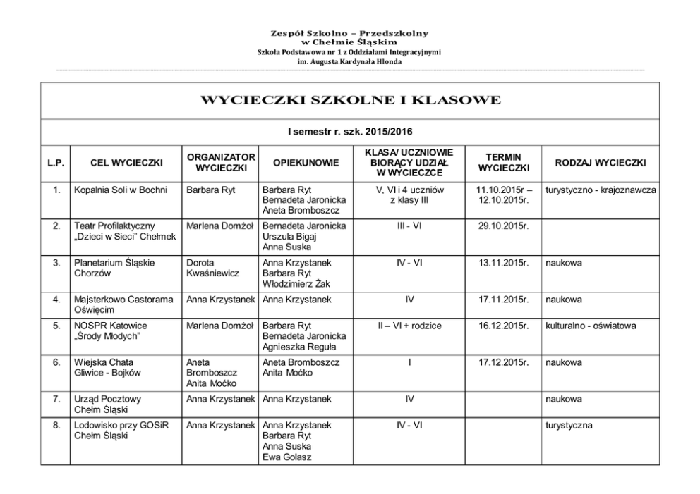WYCIECZKI SZKOLNE I KLASOWE 2015_2016