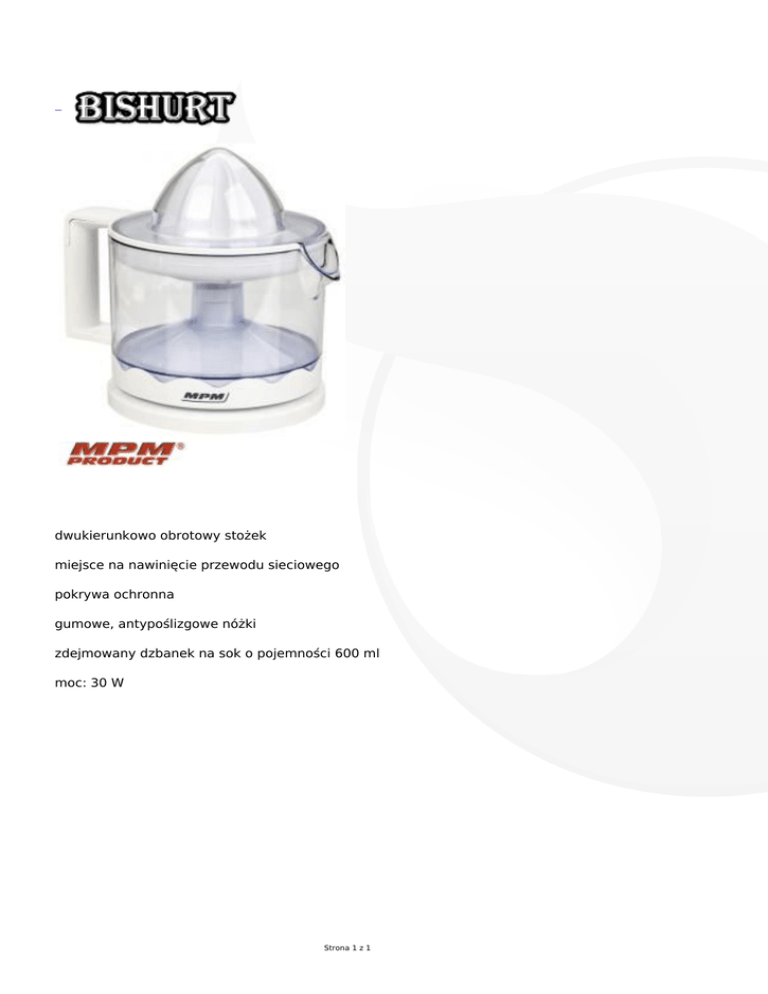 dwukierunkowo obrotowy stożek miejsce na nawinięcie przewodu sieciowego pokrywa ochronna gumowe, antypoślizgowe nóżki zdejmowany dzbanek na sok o pojemności 600 ml moc: 30 W Strona 1 z 1