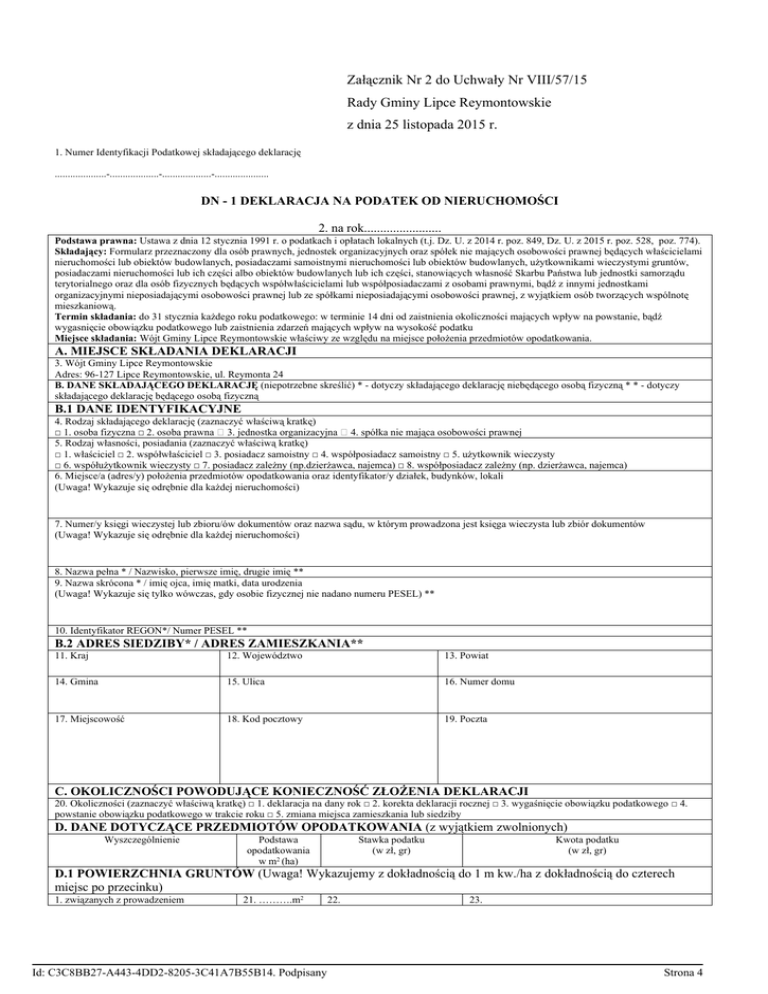 Załącznik Nr 2 do Uchwały Nr VIII/57/15 Rady Gminy Lipce Reymontowskie z dnia 25 listopada 2015 r. 1. Numer Identyfikacji Podatkowej składającego deklarację ....................-...................-...................-..................... DN - 1 DEKLARACJA NA PODATEK OD NIERUCHOMOŚCI 2. na rok........................ Podstawa prawna: Ustawa z dnia 12 stycznia 1991 r. o podatkach i opłatach lokalnych (t.j. Dz. U. z 2014 r. poz. 849, Dz. U. z 2015 r. poz. 528, poz. 774). Składający: Formularz przeznaczony dla osób prawnych, jednostek organizacyjnych oraz spółek nie mających osobowości prawnej będących właścicielami nieruchomości lub obiektów budowlanych, posiadaczami samoistnymi nieruchomości lub obiektów budowlanych, użytkownikami wieczystymi gruntów, posiadaczami nieruchomości lub ich części albo obiektów budowlanych lub ich części, stanowiących własność Skarbu Państwa lub jednostki samorządu terytorialnego oraz dla osób fizycznych będących współwłaścicielami lub współposiadaczami z osobami prawnymi, bądź z innymi jednostkami organizacyjnymi nieposiadającymi osobowości prawnej lub ze spółkami nieposiadającymi osobowości prawnej, z wyjątkiem osób tworzących wspólnotę mieszkaniową. Termin składania: do 31 stycznia każdego roku podatkowego: w terminie 14 dni od zaistnienia okoliczności mających wpływ na powstanie, bądź wygasnięcie obowiązku podatkowego lub zaistnienia zdarzeń mających wpływ na wysokość podatku Miejsce składania: Wójt Gminy Lipce Reymontowskie właściwy ze względu na miejsce położenia przedmiotów opodatkowania. A. MIEJSCE SKŁADANIA DEKLARACJI 3. Wójt Gminy Lipce Reymontowskie Adres: 96-127 Lipce Reymontowskie, ul. Reymonta 24 B. DANE SKŁADAJĄCEGO DEKLARACJĘ (niepotrzebne skreślić) * - dotyczy składającego deklarację niebędącego osobą fizyczną * * - dotyczy składającego deklarację będącego osobą fizyczną B.1 DANE IDENTYFIKACYJNE 4. Rodzaj składającego deklarację (zaznaczyć właściwą kratkę) □ 1. osoba fizyczna □ 2. osoba prawna 3. jednostka organizacyjna 4. spółka nie mająca osobowości prawnej 5. Rodzaj własności, posiadania (zaznaczyć właściwą kratkę) □ 1. właściciel □ 2. współwłaściciel □ 3. posiadacz samoistny □ 4. współposiadacz samoistny □ 5. użytkownik wieczysty □ 6. współużytkownik wieczysty □ 7. posiadacz zależny (np.dzierżawca, najemca) □ 8. współposiadacz zależny (np. dzierżawca, najemca) 6. Miejsce/a (adres/y) położenia przedmiotów opodatkowania oraz identyfikator/y działek, budynków, lokali (Uwaga! Wykazuje się odrębnie dla każdej nieruchomości) 7. Numer/y księgi wieczystej lub zbioru/ów dokumentów oraz nazwa sądu, w którym prowadzona jest księga wieczysta lub zbiór dokumentów (Uwaga! Wykazuje się odrębnie dla każdej nieruchomości) 8. Nazwa pełna * / Nazwisko, pierwsze imię, drugie imię ** 9. Nazwa skrócona * / imię ojca, imię matki, data urodzenia (Uwaga! Wykazuje się tylko wówczas, gdy osobie fizycznej nie nadano numeru PESEL) ** 10. Identyfikator REGON*/ Numer PESEL ** B.2 ADRES SIEDZIBY* / ADRES ZAMIESZKANIA** 11. Kraj 12. Województwo 13. Powiat 14. Gmina 15. Ulica 16. Numer domu 17. Miejscowość 18. Kod pocztowy 19. Poczta C. OKOLICZNOŚCI POWODUJĄCE KONIECZNOŚĆ ZŁOŻENIA DEKLARACJI 20. Okoliczności (zaznaczyć właściwą kratkę) □ 1. deklaracja na dany rok □ 2. korekta deklaracji rocznej □ 3. wygaśnięcie obowiązku podatkowego □ 4. powstanie obowiązku podatkowego w trakcie roku □ 5. zmiana miejsca zamieszkania lub siedziby D. DANE DOTYCZĄCE PRZEDMIOTÓW OPODATKOWANIA (z wyjątkiem zwolnionych) Wyszczególnienie Podstawa opodatkowania w m2 (ha) Stawka podatku (w zł, gr) Kwota podatku (w zł, gr) D.1 POWIERZCHNIA GRUNTÓW (Uwaga! Wykazujemy z dokładnością do 1 m kw./ha z dokładnością do czterech miejsc po przecinku) 1. związanych z prowadzeniem 21. ……….m2 Id: C3C8BB27-A443-4DD2-8205-3C41A7B55B14. Podpisany 22. 23. Strona 4 działalności gospodarczej, bez względu na sposób sklasyfikowania w ewidencji gruntów i budynków 2. pod wodami powierzchniowymi stojącymi lub wodami powierzchniowymi płynących jezior i zbiorników sztucznych 3. pozostałych, w tym zajętych na prowadzenie odpłatnej statutowej działalności pożytku publicznego przez organizacje pożytku publicznego 4. niezabudowanych objętych obszarem rewitalizacji, o którym mowa w ustawie z dnia 9 października 2015 r. o rewitalizacji, i położonych na terenach, dla których miejscowy plan zagospodarowania przestrzennego przewiduje przeznaczenie pod zabudowę mieszkaniową, usługową albo zabudowę o przeznaczeniu mieszanym obejmującym wyłącznie te rodzaje zabudowy, jeżeli od dnia wejścia w życie tego planu w odniesieniu do tych gruntów upłynął okres 4 lat, a w tym czasie nie zakończono budowy zgodnie z przepisami prawa budowlanego ……………………,………. ……………….......,……… 24 . ………...ha 25. ………………….,………... 26. …………………...,…….. 27. ………..m2 28. ……………….....,………... 29. …………………...,…….... 30. ………..m2 31. ………................................. 32. ……….............................. D.2 POWIERZCHNIA UŻYTKOWA BUDYNKÓW LUB ICH CZĘŚCI (*) 1. mieszkalnych - ogółem 33. ………...m2 36. ...... ……m2 34. …………….......,………... 37. …………….........,………. 35. …………….......,............ 38. …………………..,………. 51. 52. 53. ………………. ………………………… ………………………….. w tym: - kondygnacji o wysokości od 1,40 do 2,20 m (zaliczyć 50% powierzchni) - kondygnacji o wysokosci powyżej 2,20 m ………………......,……..... …………………..,……….. ………...m2 * Do powierzchni użytkowej budynku lub jego części należy zaliczyć powierzchni