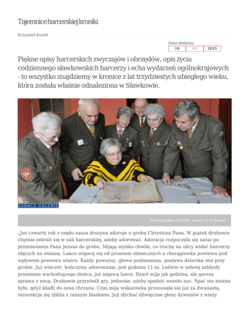 Tajemniceharcerskiejkroniki Krzysztof Kozieł Data dodania: 16 03 2015 Piękne opisy harcerskich zwyczajów i obrzędów, opis życia codziennego sławkowskich harcerzy i echa wydarzeń ogólnokrajowych - to wszystko znajdziemy w kronice z lat trzydziestych ubiegłego wieku, która została właśnie odnaleziona w Sławkowie. Z O BACZ GALE R IĘ Przeczytanie artykułu zajmie Ci 4 minuty „Już czwarty rok z rzędu nasza drużyna adoruje u grobu Chrystusa Pana. W piątek druhowie chętnie zebrali się w sali harcerskiej, ażeby adorować. Adoracja rozpoczęła się zaraz po przeniesieniu Pana Jezusa do grobu. Mijają szybko chwile, co trochę na ulicy widać harcerzy idących na zmianę. Lance migocą się od promieni słonecznych a chorągiewka powiewa pod wpływem powiewu wiatru. Każdy poważny, głowa podniesiona, postawa dziarska stoi przy grobie. Już wieczór, kończymy adorowanie, jest godzina 11-ta. Ledwie w sobotę zabłysły promienie wschodzącego słońca, już migocą lance. Dzień mija jak godzina, ale gorsza sprawa z nocą. Druhowie przynieśli gry, jedzenie, ażeby spędzić wesoło noc. Spać nie można było, gdyż kładli do nosa chrzanu. Czas mija wskazówka przesunęła się już za dwunastą, rezurekcja się zbliża z rannym blaskiem. Już słychać dźwięczne głosy dzwonów z wieży kościelnej wołających ludzi na rezurekcje. Tłumy ciągną powoli do kościoła. Na wschodzie widać czerwone słońce, dzwony biją, słychać strzały a w pośrodku tłumu pod baldachimem idzie Chrystus Zmartwychwstały. Wesołego Alleluja! Sławków, dnia 21/IV 35 r.” Tak oto sławkowscy harcerze przeżywali dokładnie osiemdziesiąt lat temu Święta Wielkiejnocy. [Wszystkie cytaty odzwierciedlają pisownię oryginalną]. Dokument zatytułowany „Kronika 78. Zagłębiowskiej Męskiej Drużyny Harcerskiej im. ks. Józefa Poniatowskiego w Sławkowie” przetrwał osiem dziesięcioleci, a jakiś czas temu trafił do Kręgu Straszoharcerskiego w Sławkowie. I to właśnie dzięki nim pięknie ilustrowana odsłania dziś przed nami fascynujące tajemnice. Wszystko pisane pięknym, ręcznym pismem, piórem do kaligrafii. Do tego urzekające wręcz rysunki, część w czerni i bieli, inne mieniące się zachowanymi mimo upływu dziesiątków lat kolorami. – Kronikę otrzymałam po śmierci druha Stanisława Bulskiego, który strzegł jej jak oka w głowie przez wiele lat. Nie przypuszczałam jednak, że może ona mieć taką wartość historyczną – przyznaje Janina Gołąb, przewodnicząca Kręgu Starszoharcerskiego w Sławkowie - Od momentu powstania naszego kręgu w 1990 roku, za jedno z głównych zadań stawiamy sobie zachowywanie pamięci o ruchu harcerskim w naszym mieście. Prowadzimy własną kronikę, która teraz, przez pryzmat przedwojennych zapisków, nabiera szczególnego znaczenia. Upublicznienie wiadomości o harcerskiej kronice z lat trzydziestych ubiegłego wieku to wydarzenie wyjątkowe, biorąc pod uwagę również i to, że właśnie w tym roku obchodzimy jubileusz dwudziestopięciolecia powstania naszego kręgu – dodaje. Kronika rozpoczyna się wpisem z 1930 roku. Kolejne zapiski ciągną się przez sześć lat. Ich autorem jest kronikarz, S. Dzięcioł. On również wykonał większość rysunków. Jej zawartość bardziej przypomina pamiętnik, w którym opisywane są emocje towarzyszące wielu wydarzeniom w życiu harcerzy, a nie tylko suche, kronikarskie fakty. A o czym piszą przedwojenni harcerze? O obchodach imienin Józefa Piłsudskiego i świąt narodowych, o obozach, zbiórkach. Widać też, jak bardzo przeżywali wydarzenia ogólnokrajowe, jak śmierć Józefa Piłsudskiego czy zamordowanie w 1934 roku ministra Bronisława Pierackiego. Do tego wszystkiego na kartach mamy własnoręczne podpisy ówczesnych sławkowskich i zagłębiowskich druhów i druhen. Lektura zapisów kroniki to więc również wspaniała lekcja historii. - Przeglądając to wszystko wprost uderza, jak wielką wagę przywiązywało się w tamtych czasach do patriotycznego wychowywania młodego pokolenia. Widać wyraźnie, że ci bardzo młodzi przecież chłopcy autentycznie żyli tymi wszystkimi wydarzeniami – podkreśla Janina Cembrzyńska – Tarmas. Jeden z wpisów z 1934 roku zawiera życzenia od ówczesnego wicemarszałka Senatu RP, Antoniego Boguckiego. W innym miejscu znajdziemy bardzo ciekawy wpis harcerza, podróżującego w tym czasie po Polsce: Harcerze w szczególny sposób witali też nadejście nowego roku. Na stronie otwierającej 1935 rok znajdujemy wiersz: „W Niebiosa sine, po których okręty / płyną chmur białych, jak miniony puch / ślemy życzenie swe w modlitwie świętej: Boże Narodu, odródź karli duch! / Niech bohatery wstaną przeogromne / jak wihr potężne, jasne jak grom / jako Opoka Piotrowa niezłomne, / czyste i święte jako Boży dom! Niech wiodą Naród do gwiazd, a nie w błoto, / pod znakiem Krzyża, nie pod wodzą żądz! / niechaj kochają jeno słońca złoto / czynów słonecznych ogromami lśniąc. / Sławków, 20 stycznia 1935 r.” Ostatnie wpisy pochodzą z 1936 roku. Dlaczego dotąd prowadzone z taką regularnością zapiski nagle urywają się? Odpowiedź jest prosta i smutna zarazem: „Sześć lat pod kierownictwem Szkoły Powszechnej, jak ta mała garstka drużyny Sławkowskiej o własnych siłach i własnemi staraniami szła ku lepszemu jutru. Cóż, kiedy już niemogła dalej szerzyć swe Hasło Harcerskie, gdyż środki powoli się zaczęły niknąć z kasy, a o zdobywaniu znów nowych środków do dalszego prowadzenia nie można było znikąd otrzymać, z powodu, że drużyna utraciła swego Opiekuna, który z bólem w sercu musiał opuszczać gdzie indziej na stanowisko. Rozpacz ogarnęła i pustka powstała w naszej Drużynie, gdy otrzymaliśmy wiadomość, że utraciliśmy Opiekuna, ojca naszej drużyny. Cóż tedy robić: lecz nie tracimy nadzieji i o własnych siłach jak możemy tak utrzymujemy naszą d