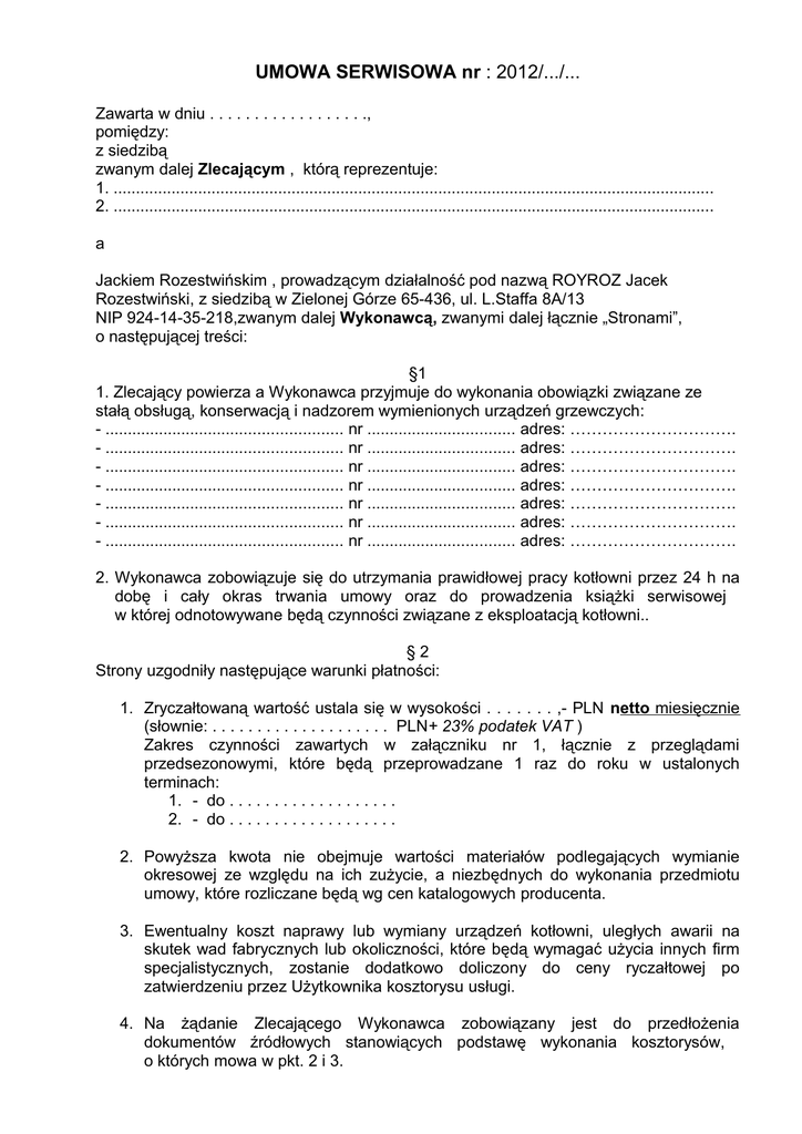 UMOWA SERWISOWA nr : 2012/.../... Zawarta w dniu . . . . . . . . . . . . . . . . . ., pomiędzy: z siedzibą zwanym dalej Zlecającym , którą reprezentuje: 1. ....................................................................................................................................... 2. ....................................................................................................................................... a Jackiem Rozestwińskim , prowadzącym działalność pod nazwą ROYROZ Jacek Rozestwiński, z siedzibą w Zielonej Górze 65-436, ul. L.Staffa 8A/13 NIP 924-14-35-218,zwanym dalej Wykonawcą, zwanymi dalej łącznie „Stronami”, o następującej treści: §1 1. Zlecający powierza a Wykonawca przyjmuje do wykonania obowiązki związane ze stałą obsługą, konserwacją i nadzorem wymienionych urządzeń grzewczych: - ..................................................... nr ................................. adres: …………………………. - ..................................................... nr ................................. adres: …………………………. - ..................................................... nr ................................. adres: …………………………. - ..................................................... nr ................................. adres: …………………………. - ..................................................... nr ................................. adres: …………………………. - ..................................................... nr ................................. adres: …………………………. - ..................................................... nr ................................. adres: …………………………. 2. Wykonawca zobowiązuje się do utrzymania prawidłowej pracy kotłowni przez 24 h na dobę i cały okras trwania umowy oraz do prowadzenia książki serwisowej w której odnotowywane będą czynności związane z eksploatacją kotłowni.. §2 Strony uzgodniły następujące warunki płatności: 1. Zryczałtowaną wartość ustala się w wysokości . . . . . . . ,- PLN netto miesięcznie (słownie: . . . . . . . . . . . . . . . . . . . . PLN+ 23% podatek VAT ) Zakres czynności zawartych w załączniku nr 1, łącznie z przeglądami przedsezonowymi, które będą przeprowadzane 1 raz do roku w ustalonych terminach: 1. - do . . . . . . . . . . . . . . . . . . . 2. - do . . . . . . . . . . . . . . . . . . . 2. Powyższa kwota nie obejmuje wartości materiałów podlegających wymianie okresowej ze względu na ich zużycie, a niezbędnych do wykonania przedmiotu umowy, które rozliczane będą wg cen katalogowych producenta. 3. Ewentualny koszt naprawy lub wymiany urządzeń kotłowni, uległych awarii na skutek wad fabrycznych lub okoliczności, które będą wymagać użycia innych firm specjalistycznych, zostanie dodatkowo doliczony do ceny ryczałtowej po zatwierdzeniu przez Użytkownika kosztorysu usługi. 4. Na żądanie Zlecającego Wykonawca zobowiązany jest do przedłożenia dokumentów źródłowych stanowiących podstawę wykonania kosztorysów, o których mowa w pkt. 2 i 3. 5. Zapłata odbywać się będzie na podstawie faktury, którą Wykonawca wystawi na końcu każdego miesiąca, której wartość wynikać będzie z treści umowy zawartej w § 2 p.1,2,3, 6. Zlecający zobowiązuje się dokonać płatności za przedmiot umowy w ciągu 7 dni od daty dostarczenia faktury, przelewem na rachunek bankowy Wykonawcy wskazany na fakturze. §3 1. Strony ustalają, że dostęp do pomieszczenia w którym zlokalizowana jest kotłownia ograniczony będzie tylko do osób wyznaczonych przez Zlecającego i Wykonawcę i określonych poniżej: 1. 2. 3. 2. Strony ograniczają odpowiedzialność Wykonawcy w ten sposób, że nie ponosi odpowiedzialności za przedmiot umowy, w przypadku zaistnienia zdarzeń losowych. §4 W przypadku wystąpienia nagłych nieprawidłowości w pracy kotłowni wykonawca zapewnia przyjazd serwisu w ciągu .......... godzin od czasu zawiadomienia telefonicznego pod numer 0 515 106 289 lub 0 68 455 84 81. §5 1. Umowa zostaje zawarta na czas ................................................................. . 2. Ustala się, że wypowiedzenie umowy przez jakąkolwiek ze stron może nastąpić zastosowaniem 1 miesięcznego okresu wypowiedzenia . 3. Ewentualne spory wynikłe w związku z realizacją niniejszej umowy rozstrzygać będzie właściwy rzeczowo Sąd w Zielonej Górze. §6 1. Niniejsza umowa ma charakter poufny, a jej treść nie powinna być udostępniana osobom trzecim. 2. Umowę sporządzono w dwóch jednobrzmiących egzemplarzach, po jednym egz. dla każdej ze stron, której integralną częścią umowy jest załącznik nr 1. 3. Wszelkie zmiany umowy wymagają zgody stron w formie pisemnej pod rygorem nieważności. ZAMAWIAJĄCY WYKONAWCA Załącznik nr 1 HARMONOGRAM OBSŁUGI KOTŁOWNI OLEJOWEJ Lp. Zakres czynności podczas eksploatacji kotłowni gazowej 1 miesiąc 2 miesiąc 3 miesiąc 4 miesiąc 5 miesiąc tydzień tydzień tydzień tydzień tydzień 1 1. 2. 3. 4. 5. 6. 7. 8. 9. 10. 11. 12. 13. 14. 15. 16. 17. Czyszczenie zewnętrzne kotła i palnika. Sprawdzenie poprawnej pracy kotła, palnika, pomp i regulatora Sprawdzenie działania czujników zabezpieczających w kotle Sprawdzenie ciśnienia w układzie c.o. Sprawdzenie zaworów bezpieczeństwa (przedmuchanie) Kontrola połączeń hydraulicznych i elektrycznych Sprawdzenie i ewentualne uzupełnienie wszystkich uszczelnień Sprawdzenie automatyki i regulacja Sprawdzenie szczelności i pomiar ciągu komina Kontrola odskraplacza komina, kontrola ilości spalin. Czyszczenie palnika, komory spalania kotła Kontrola poprawności spalania z wykonaniem analizy spalin. Czyszczenie filtroodmulnika Kontrola wentylacji nawiewnowywiewnej Sprawdzenie i ewentualna wymiana wkładu filtra wody Kontrola działania stacji zmiękczania wody oraz regeneracja złoża jon