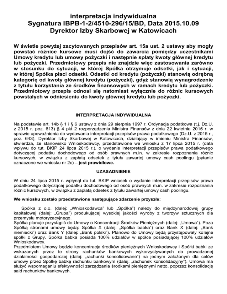 interpretacja indywidualna Sygnatura IBPB-1-2/4510-296/15/BD, Data 2015.10.09 Dyrektor Izby Skarbowej w Katowicach W świetle powyżej zacytowanych przepisów art. 15a ust. 2 ustawy aby mogły powstać różnice kursowe musi dojść do zawarcia pomiędzy uczestnikami Umowy kredytu lub umowy pożyczki i następnie spłaty kwoty głównej kredytu lub pożyczki. Przedmiotowy przepis nie znajdzie więc zastosowania zarówno w stosunku do sytuacji, w której Spółka otrzymuje odsetki, jak i sytuacji, w której Spółka płaci odsetki. Odsetki od kredytu (pożyczki) stanowią odrębną kategorię od kwoty głównej kredytu (pożyczki), gdyż stanowią wynagrodzenie z tytułu korzystania ze środków finansowych w ramach kredytu lub pożyczki. Przedmiotowy przepis odnosi się natomiast wyłącznie do różnic kursowych powstałych w odniesieniu do kwoty głównej kredytu lub pożyczki. INTERPRETACJA INDYWIDUALNA Na podstawie art. 14b § 1 i § 6 ustawy z dnia 29 sierpnia 1997 r. Ordynacja podatkowa (t.j. Dz.U. z 2015 r. poz. 613) § 4 pkt 2 rozporządzenia Ministra Finansów z dnia 22 kwietnia 2015 r. w sprawie upoważnienia do wydawania interpretacji przepisów prawa podatkowego (Dz.U. z 2015 r., poz. 643), Dyrektor Izby Skarbowej w Katowicach, działający w imieniu Ministra Finansów, stwierdza, że stanowisko Wnioskodawcy, przedstawione we wniosku z 17 lipca 2015 r. (data wpływu do tut. BKIP 24 lipca 2015 r.), o wydanie interpretacji przepisów prawa podatkowego dotyczącej podatku dochodowego od osób prawnych m.in. w zakresie rozpoznania różnic kursowych, w związku z zapłatą odsetek z tytułu zawartej umowy cash poolingu (pytanie oznaczone we wniosku nr 2c) – jest prawidłowe. UZASADNIENIE W dniu 24 lipca 2015 r. wpłynął do tut. BKIP wniosek o wydanie interpretacji przepisów prawa podatkowego dotyczącej podatku dochodowego od osób prawnych m.in. w zakresie rozpoznania różnic kursowych, w związku z zapłatą odsetek z tytułu zawartej umowy cash poolingu. We wniosku zostało przedstawione następujące zdarzenie przyszłe: Spółka z o.o. (dalej: „Wnioskodawca” lub „Spółka”) należy do międzynarodowej grupy kapitałowej (dalej: „Grupa”) produkującej wysokiej jakości wyroby z tworzyw sztucznych dla przemysłu motoryzacyjnego. Spółka planuje przystąpić do Umowy o Koncentracji Środków Pieniężnych (dalej: „Umowa”). Poza Spółką stronami umowy będą: Spółka X (dalej: „Spółka babka”) oraz Bank X (dalej: „Bank niemiecki”) oraz Bank Y (dalej: „Bank polski”). Planowo do Umowy będą przystępowały kolejne spółki z Grupy. Spółka babka posiada 100% udziałów w spółce posiadającej 100% udziałów Wnioskodawcy. Przedmiotem Umowy będzie koncentracja środków pieniężnych Wnioskodawcy i Spółki babki ze wskazanych przez te strony rachunków bankowych wykorzystywanych do prowadzonej działalności gospodarczej (dalej: „rachunki konsolidowane”) na jednym założonym dla celów umowy przez Spółkę babkę rachunku bankowym (dalej: „rachunek konsolidacyjny”). Umowa ma służyć wspomaganiu efektywności zarządzania środkami pieniężnymi netto, poprzez konsolidację sald rachunków bankowych. 2 Zamiar przystąpienia spółek wchodzących w skład Grupy do Umowy jest podyktowany chęcią wdrożenia procesu zarządzania posiadanymi na rachunkach bankowych środkami pieniężnymi oraz zadłużeniem spółek tworzących Grupę, poprzez poprawę bieżących przepływów pieniężnych. Oferowane narzędzie ma charakter efektywnej i całkowitej koncentracji środków pieniężnych, co oznacza, że odsetki od salda kredytowego lub debetowego będą naliczane/pobierane wyłącznie od rachunku konsolidacyjnego, utworzonego celowo dla potrzeb planowanego przedsięwzięcia, na którym w wyniku fizycznego transferu konsolidowane będą salda rachunków konsolidowanych, tj. saldo wskazanych przez Wnioskodawcę i Spółkę babkę rachunków bankowych. Efektem tego będzie zerowanie sald rachunków konsolidowanych i zgromadzenie środków (salda netto spółek zawierających Umowę) na rachunku konsolidacyjnym. Zarówno rachunki konsolidowane, jak i rachunek konsolidacyjny prowadzone będą w walucie euro. Konsolidacja sald rachunków na rachunku konsolidacyjnym nastąpi automatycznie. Walutą konsolidacyjną będzie euro. Oznacza to, że na końcu każdego dnia roboczego saldo rachunków konsolidowanych zostanie przekazane na rachunek konsolidacyjny Spółki babki. Możliwe są tutaj dwa warianty: a. jeśli rachunek konsolidowany wykaże saldo kredytowe, nastąpi przekazanie środków na rachunek konsolidacyjny, b. jeśli rachunek konsolidowany wykaże saldo debetowe, nastąpi przekazanie środków, w celu wyzerowania konta, z rachunku konsolidacyjnego na rachunek konsolidowany. Istotą mechanizmu jest, że pod koniec dnia roboczego, niezależnie od występującego salda, rachunki konsolidowane zostaną wyzerowane. Bank niemiecki i Bank polski w celu zapewnienia płynności na rachunkach Spółki i Spółki babki ustanowią limity dysponowania środkami. Limity takie alokowane są w ramach wewnętrznych procedur obu Banków, co oznacza że limit nie jest zobowiązaniem banku wobec klienta posiadającego rachunek konsolidowany. Salda na rachunku konsolidacyjnym będą naliczane codziennie przez Bank niemiecki i po upływie każdego miesiąca kalendarzowego zostanie przekazany zbiorczy wykaz przepływów na ten rachunek. Spółka babka na podstawie zbiorczego miesięcznego wykazu dokona wyliczenia sumy odsetek debetowych/kredytowych przypadających na poszczególnych uczestników Umowy i wykona przelewy sum wynikłych z tego wyliczenia. Wyliczenie wielkości odsetek przypadających na Spółkę i Spółkę babkę oraz techniczny sposób rozliczeń regulowane będzie odrębną umową podpisaną przez strony (dalej: „Umowa rozliczeń”). Spółka babka nie będzie pobierać żadnych opłat od Spółki w związku z funkcjonowaniem Umowy