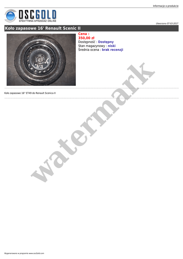 Informacje o produkcie Utworzono 07-03-2017 Koło zapasowe 16' Renault Scenic II Cena : 350,00 zł er m ar k Dostępność : Dostępny Stan magazynowy : niski Średnia ocena : brak recenzji w at Koło zapasowe 16" ET49 do Renault Scenica II Wygenerowano w programie www.oscGold.com
