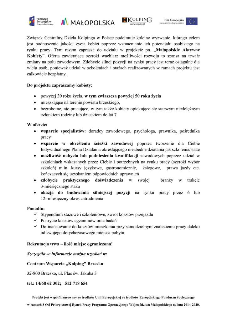 Związek Centralny Dzieła Kolpinga w Polsce podejmuje kolejne wyzwanie, którego celem jest podnoszenie jakości życia kobiet poprzez wzmacnianie ich potencjału osobistego na rynku pracy. Tym razem zaprasza do udziału w projekcie pn. „Małopolskie Aktywne Kobiety”. Oferta zawierająca szeroki wachlarz możliwości rozwoju to szansa na trwałe zmiany na polu zawodowym. Zdobycie silnej pozycji na rynku pracy jest teraz osiągalne dla wielu osób, ponieważ udział w szkoleniach i stażach realizowanych w ramach projektu jest całkowicie bezpłatny. Do projektu zapraszamy kobiety: powyżej 30 roku życia, w tym zwłaszcza powyżej 50 roku życia mieszkające na terenie powiatu brzeskiego, bezrobotne, nie pracujące, w tym także kobiety opiekujące się starszym niedołężnym członkiem rodziny lub dzieckiem do lat 7 W ofercie: wsparcie specjalistów: doradcy zawodowego, psychologa, prawnika, pośrednika pracy wsparcie w określeniu ścieżki zawodowej poprzez tworzenie dla Ciebie Indywidualnego Planu Działania określającego niezbędne działania jak szkolenia/staże możliwość nabycia lub podniesienia kwalifikacji zawodowych poprzez udział w szkoleniach wskazanych przez Ciebie i potrzebnych na rynku pracy (szeroki wybór szkoleń) m.in. kursy językowe, gastronomicznie, księgowe, prawa jazdy etc. kończących się uzyskaniem odpowiednich uprawnień zdobycie praktycznego doświadczenia w swojej branży w trakcie 3-miesięcznego stażu okazja do budowania silniejszej pozycji na rynku pracy przez 6 lub 12- miesięczny okres zatrudnienia Ponadto: Stypendium stażowe i szkoleniowe, zwrot kosztów przejazdu Pokrycie kosztów egzaminów oraz badań Dofinansowanie do kosztów mieszkania przy samodzielnym znalezieniu pracy daleko od swojego dotychczasowego miejsca pobytu. Rekrutacja trwa – ilość miejsc ograniczona! Szczegółowe informacje można uzyskać w: Centrum Wsparcia „Kolping” Brzesko 32-800 Brzesko, ul. Plac św. Jakuba 3 tel.: 14/68 62 302; 512 718 654 Projekt jest współfinansowany ze środków Unii Europejskiej ze środków Europejskiego Funduszu Społecznego w ramach 8 Osi Priorytetowej Rynek Pracy Programu Operacyjnego Województwa Małopolskiego na lata 2014-2020.