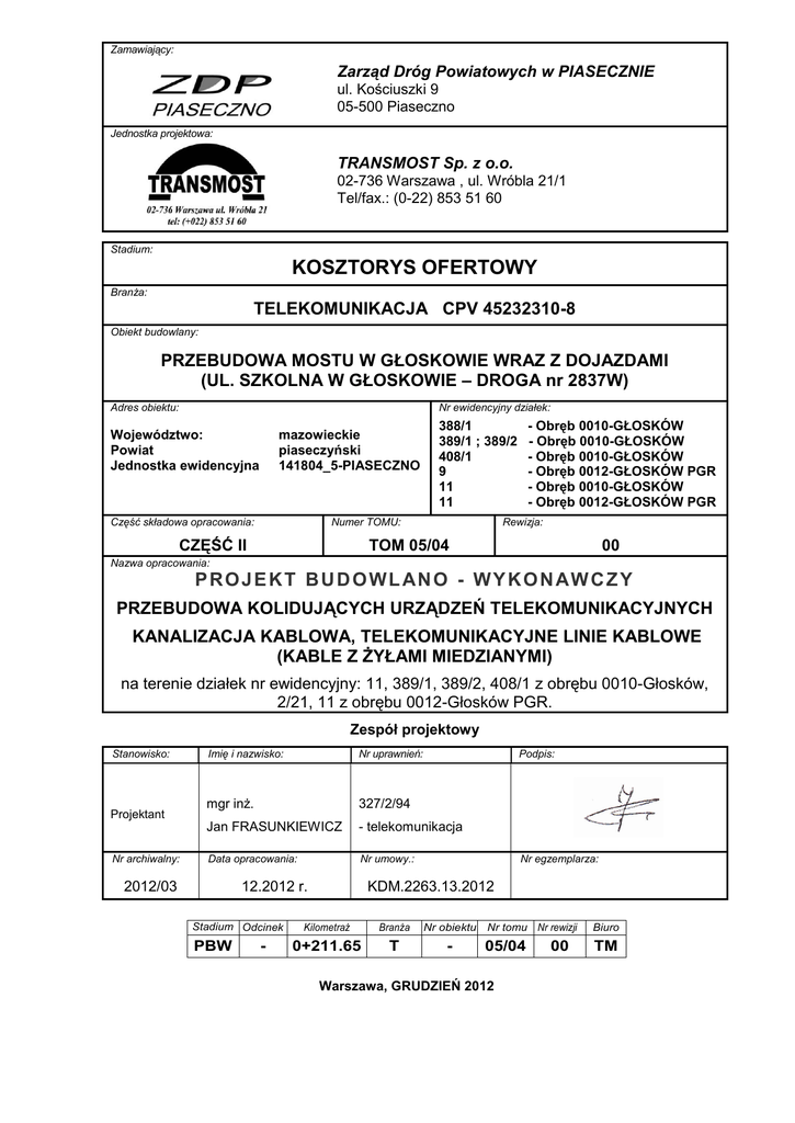 Zamawiający: Zarząd Dróg Powiatowych w PIASECZNIE ul. Kościuszki 9 05-500 Piaseczno Jednostka projektowa: TRANSMOST Sp. z o.o. 02-736 Warszawa , ul. Wróbla 21/1 Tel/fax.: (0-22) 853 51 60 Stadium: KOSZTORYS OFERTOWY Branża: TELEKOMUNIKACJA CPV 45232310-8 Obiekt budowlany: PRZEBUDOWA MOSTU W GŁOSKOWIE WRAZ Z DOJAZDAMI (UL. SZKOLNA W GŁOSKOWIE – DROGA nr 2837W) Nr ewidencyjny działek: Adres obiektu: Województwo: Powiat Jednostka ewidencyjna mazowieckie piaseczyński 141804_5-PIASECZNO Część składowa opracowania: Numer TOMU: CZĘŚĆ II - Obręb 0010-GŁOSKÓW - Obręb 0010-GŁOSKÓW - Obręb 0010-GŁOSKÓW - Obręb 0012-GŁOSKÓW PGR - Obręb 0010-GŁOSKÓW - Obręb 0012-GŁOSKÓW PGR 388/1 389/1 ; 389/2 408/1 9 11 11 Rewizja: TOM 05/04 00 Nazwa opracowania: P R O J E K T B U D O W L AN O - W Y K O N AW C Z Y PRZEBUDOWA KOLIDUJĄCYCH URZĄDZEŃ TELEKOMUNIKACYJNYCH KANALIZACJA KABLOWA, TELEKOMUNIKACYJNE LINIE KABLOWE (KABLE Z ŻYŁAMI MIEDZIANYMI) na terenie działek nr ewidencyjny: 11, 389/1, 389/2, 408/1 z obrębu 0010-Głosków, 2/21, 11 z obrębu 0012-Głosków PGR. Zespół projektowy Stanowisko: Projektant Nr archiwalny: Imię i nazwisko: Nr uprawnień: mgr inż. 327/2/94 Jan FRASUNKIEWICZ - telekomunikacja Data opracowania: Nr umowy.: 2012/03 12.2012 r. Stadium Odcinek m PBW - Podpis: Nr egzemplarza: KDM.2263.13.2012 Kilometraż Branża Nr obiektu 0+211.65 T - Nr tomu Nr rewizji Biuro 05/04 TM Warszawa, GRUDZIEŃ 2012 00 Kosztorys ofertowy . Budowa: Przebudowa urządzeń telekomunikacyjnych Obiekt: Przebudowa mostu w Głoskowie wraz z dojazdami Zamawiający: Zarząd Dróg Powiatowych w Piasecznie Sprawdzający: ................................................................................................................................................................................................................................................... Zamawiający: Wykonawca: .......... .......... strona nr: 2 Kosztorys ofertowy Element, asortyment, rodzaj robót, pozycja przedmiarowa podstawy nakładów Jedn. Krot. Ilość Wartość Wartość jednostkowa netto 1 Kanalizacjia kablowa - I etap 1.1 KNKRB 1/309/11 Wykopy wraz z zasypaniem urobku dla kabli energet. głębokość wykopu do 1.2 m ; kat. gruntu III ANALOGIA - przekopy próbne 1.2 TPSA 40/102/2 Budowa kanalizacji kablowej pierwotnej z rurA 110 w wykopie wykonanym machanicznie w gruncie kategorii III, 1 warstwa i 2 otwory w ciągu kanalizacji, 2 rury w warstwie 1.3 TPSA 40/102/2 Budowa kanalizacji kablowej pierwotnej z rur SRS 110 w wykopie wykonanym machanicznie w gruncie kategorii III, 1 warstwa i 2 otwory w ciągu kanalizacji, 2 rury w warstwie 1.4 TPSA 40/102/2 Budowa kanalizacji kablowej pierwotnej z rur DVR 110 w wykopie wykonanym machanicznie w gruncie kategorii III, 1 warstwa i 2 otwory w ciągu kanalizacji, 2 rury w warstwie 1.5 TPSA 40/102/2 Budowa kanalizacji kablowej pierwotnej z rur SMR 110 w wykopie wykonanym machanicznie w gruncie kategorii III, 1 warstwa i 2 otwory w ciągu kanalizacji, 2 rury w warstwie 1.6 KNR 501/222/2 Budowa obiektów podziemnych z rur stalowych RS 133/4,5 z wkładką z rur A 110 w gruncie kategorii III, obiekt o 1-warstwie, 2-rury w warstwie, 2-rury w ciągu 1.7 KNR 501/222/2 Budowa obiektów podziemnych z rur stalowych RS 133/4,5 z wkładką z rur SRS 110 w gruncie kategorii III, obiekt o 1-warstwie, 2-rury w warstwie, 2-rury w ciągu 1.8 TPSA 39/205/2 (1) Układanie rur osłonowych trudnopalnych w budynkach, rury HDPEt na wspornikach, nakłady liczone na 1·m ANALOGIA - zamocowanie rury SMS 110 do konstrukcji (do kątownika) obejmą fi 12mm 1.9 TPSA 40/307/2 Budowa studni kablowych rozdzielczych SKR z gotowej mieszanki betonowej, typ SKR-1, grunt kategorii III 1.10 TPSA 40/301/2 Budowa studni kablowych prefabrykowanych rozdzielczych SKR, typ SKR-1, grunt kategorii III 1.11 TPSA 40/307/6 Budowa studni kablowych rozdzielczych SKR z gotowej mieszanki betonowej, typ SKR-2, grunt kategorii III 1.12 TPSA 40/322/2 Montaż elementów mechanicznej ochrony przed ingerencją osób nieuprawnionych w istniejących studniach kablowych, pokrywa dodatkowa z listwami, rama lekka 1.13 TPSA 39/207/2 Uszczelnianie otworów kanalizacji pierwotnej, uszczelki z pianką poliuretanową, otwór z 1 rurą/kablem 1.14 TPSA 39/207/4 Uszczelnianie otworów kanalizacji pierwotnej, uszczelki z pianką poliuretanową, otwór z 3 rurami/kablami 1.15 KNR 501/614/9 Przekładanie kabla doziemnego, grunt kategorii III, kabel do Fi·50·mm, pierwszy 1.16 KNR 501/614/10 Przekładanie kabla doziemnego, grunt kategorii III, kabel do Fi·50·mm, każdy następny m 11 m 101 m 13,5 m 60,5 m 29 m 20 m 5 m 60 szt 2 szt 2 szt 3 szt 7 otwór 6 otwór 6 m 130 m 390 m 28 m 19,5 szt 2 szt 2 m 18 m 18 odcinek 1 odcinek 1 2 Kanalizacja kablowa II etap 2.1 TPSA 40/102/2 Budowa kanalizacji kablowej pierwotnej z rurA 110 w wykopie wykonanym machanicznie w gruncie kategorii III, 1 warstwa i 2 otwory w ciągu kanalizacji, 2 rury w warstwie 2.2 TPSA 40/102/2 Budowa kanalizacji kablowej pierwotnej z rur SMR 110 w wykopie wykonanym machanicznie w gruncie kategorii III, 1 warstwa i 2 otwory w ciągu kanalizacji, 2 rury w warstwie 2.3 TPSA 40/301/6 Budowa studni kablowych prefabrykowanych rozdzielczych SKR, typ SKR-2, grunt kategorii III 2.4 TPSA 40/322/2 Montaż elementów mechanicznej ochrony przed ingerencją osób nieuprawnionych w istniejących studniach kablowych, pokrywa dodatkowa z listwami, rama lekka 2.5 KNR 508/101/10 Montaż uchwytów pod rury winidurowe układane pojedynczo z przygotowaniem podłoża przy użyciu sprzętu mechanicznego, osadzenie uchwytów w podłożu betonowym 2.6 TPSA 39/205/2 (1) Układanie rur osłonowych trudnopalnych w budynkach, rury HDPEt na wspornikach, nakłady liczone na 1·m ANALOGIA - montaż rur SMR 110 do uchwytów (podwieszanie pod mostem) 3 Przebudowa telekomunikacyjnych linii kablowych I etap 3.1 KNR 501/1310/5 Pomiary wstępne prądem stałym, kabel o liczbie par·50 3.2 KNR 501/1310/7 