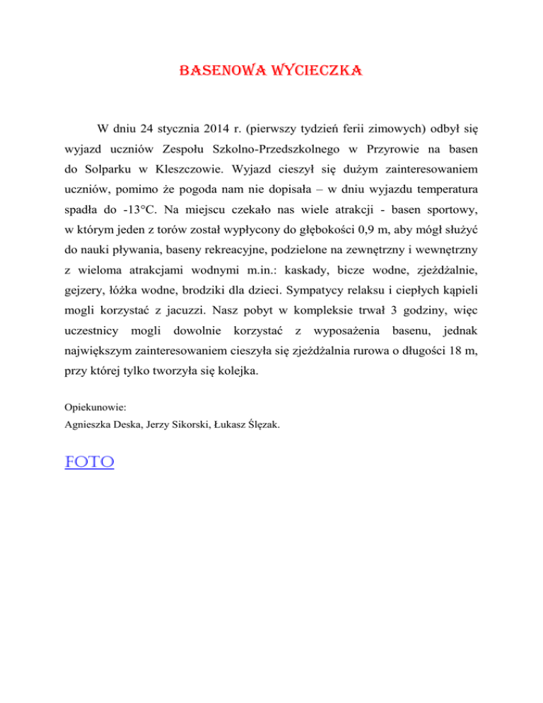 Basenowa wycieczka W dniu 24 stycznia 2014 r. (pierwszy tydzień ferii zimowych) odbył się wyjazd uczniów Zespołu Szkolno-Przedszkolnego w Przyrowie na basen do Solparku w Kleszczowie. Wyjazd cieszył się dużym zainteresowaniem uczniów, pomimo że pogoda nam nie dopisała – w dniu wyjazdu temperatura spadła do -13°C. Na miejscu czekało nas wiele atrakcji - basen sportowy, w którym jeden z torów został wypłycony do głębokości 0,9 m, aby mógł służyć do nauki pływania, baseny rekreacyjne, podzielone na zewnętrzny i wewnętrzny z wieloma atrakcjami wodnymi m.in.: kaskady, bicze wodne, zjeżdżalnie, gejzery, łóżka wodne, brodziki dla dzieci. Sympatycy relaksu i ciepłych kąpieli mogli korzystać z jacuzzi. Nasz pobyt w kompleksie trwał 3 godziny, więc uczestnicy mogli dowolnie korzystać z wyposażenia basenu, jednak największym zainteresowaniem cieszyła się zjeżdżalnia rurowa o długości 18 m, przy której tylko tworzyła się kolejka. Opiekunowie: Agnieszka Deska, Jerzy Sikorski, Łukasz Ślęzak. FOTO