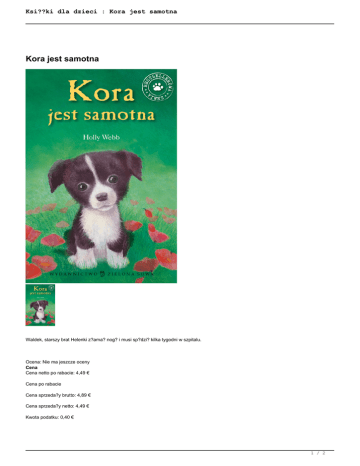 Ksi??ki dla dzieci : Kora jest samotna Kora jest samotna Waldek, starszy brat Helenki z?ama? nog? i musi sp?dzi? kilka tygodni w szpitalu. Ocena: Nie ma jeszcze oceny Cena Cena netto po rabacie: 4,49 € Cena po rabacie Cena sprzeda?y brutto: 4,89 € Cena sprzeda?y netto: 4,49 € Kwota podatku: 0,40 € 1 / 2 Ksi??ki dla dzieci : Kora jest samotna Zadaj pytanie o produkt Producent: Zielona Sowa Szczegó?y produktu Waldek, starszy brat Helenki z?ama? nog? i musi sp?dzi? kilka tygodni w szpitalu. Rodzice s? bardzo przej?ci i nie ma kto opiekowa? si? ma?? suczk? rasy border collie - Kor?. Kora jest samotna i bardzo nieszcz??liwa, podobnie jak Helenka. Tyle ?e dziewczynka tak naprawd? nie lubi psów, a Kora t?skni tylko za Waldkiem. Czy Helenka i Kora mog? si? jednak zaprzyja?ni?? EAN: 9788326504808 2 / 2 Powered by TCPDF (www.tcpdf.org)