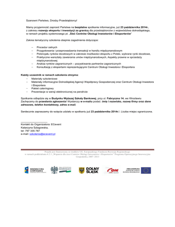 Szanowni Państwo, Drodzy Przedsiębiorcy! Mamy przyjemność zaprosić Państwa na bezpłatne spotkanie informacyjne, już 23 października 2014r., z zakresu rozwoju eksportu i inwestycji za granicą dla przedsiębiorców z województwa dolnośląskiego, w ramach projektu systemowego pt. „Sieć Centrów Obsługi Inwestorów i Eksporterów” Zakres tematyczny szkolenia obejmie zagadnienia dotyczące: − − − − − − Procedur celnych Przygotowania i przeprowadzenia transakcji w handlu międzynarodowym Potencjału rynków docelowych w zakresie możliwości eksportu z Polski, wybrane rynki docelowe, Praktyczne warsztaty zawierania umów międzynarodowych, Aspekty prawne w sprzedaży międzynarodowej Analiza rynków zagranicznych – pozyskiwanie partnerów zagranicznych Konsultację z ekspertami reprezentującymi Centrum Obsługi Inwestora i Eksportera Każdy uczestnik w ramach szkolenia otrzyma: − Materiały szkoleniowe − Materiały informacyjne Dolnośląskiej Agencji Współpracy Gospodarczej oraz Centrum Obsługi Inwestora i Eksportera − Pakiet cateringowy − Prezentacje w wersji elektronicznej na pendrivie Spotkanie odbędzie się w Budynku Wyższej Szkoły Bankowej, przy ul. Fabryczna 14, we Wrocławiu Zachęcamy do przesłania zgłoszenia! Wystarczy w e-mailu podać: imię i nazwisko, nazwę firmy oraz dane adresowe, telefon kontaktowy, adres e-mail, Serdecznie zapraszamy do wzięcia udziału w spotkaniu już 23 października 2014r.!. Liczba miejsc ograniczona. __________________ Kontakt do Organizatora: ECevent Katarzyna Szlagowska, tel: 797 335 787 e-mail: [email protected] Projekt jest finansowany ze środków UE, Europejskiego Funduszu Rozwoju Regionalnego w ramach poddziałania 6.2.1 „Wsparcie dla sieci Centrów Obsługi Inwestorów i Eksporterów” Programu Operacyjnego Innowacyjna Gospodarka, 2007–2013